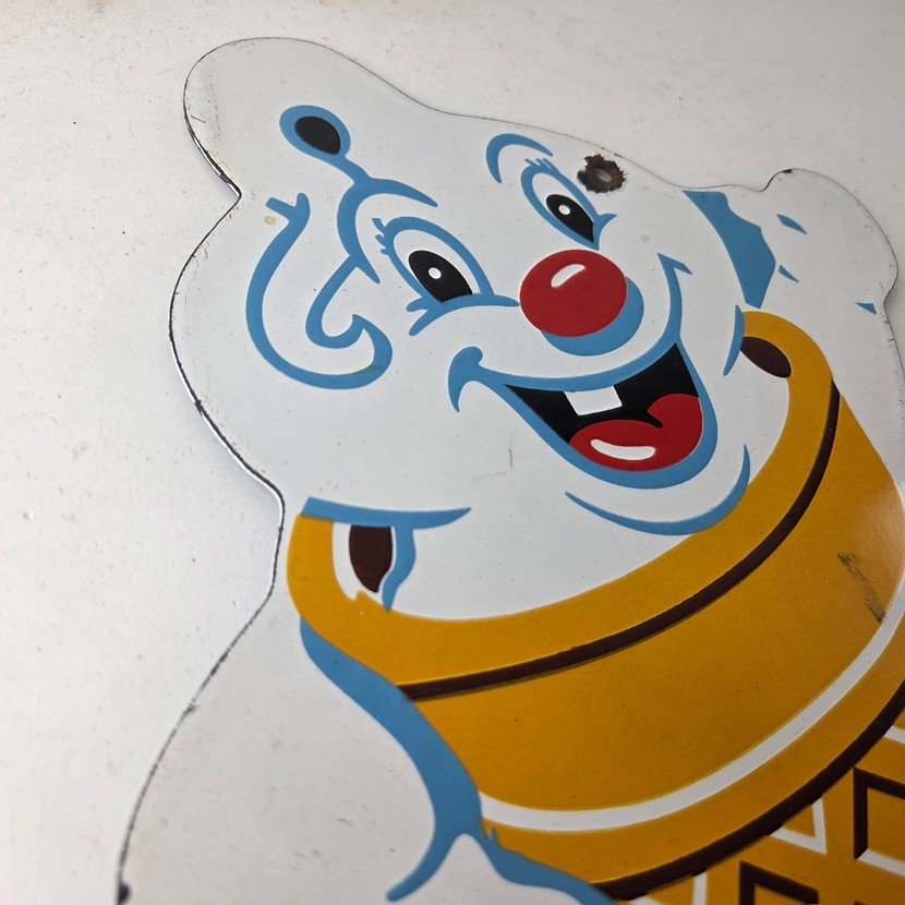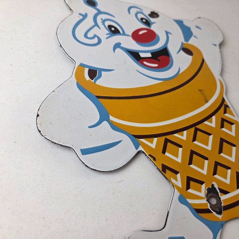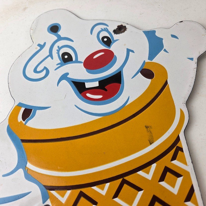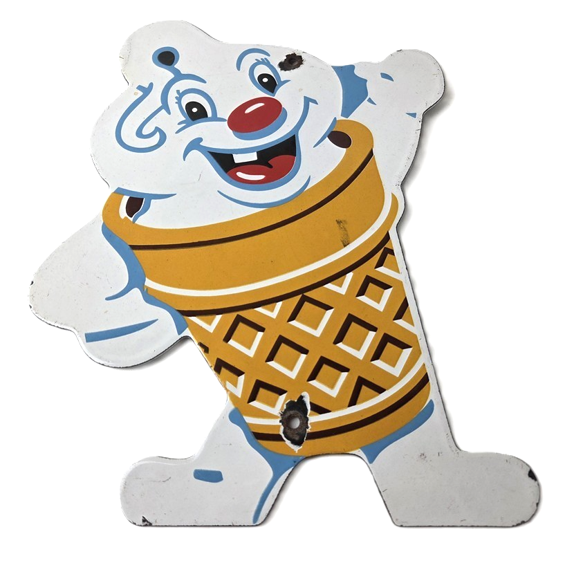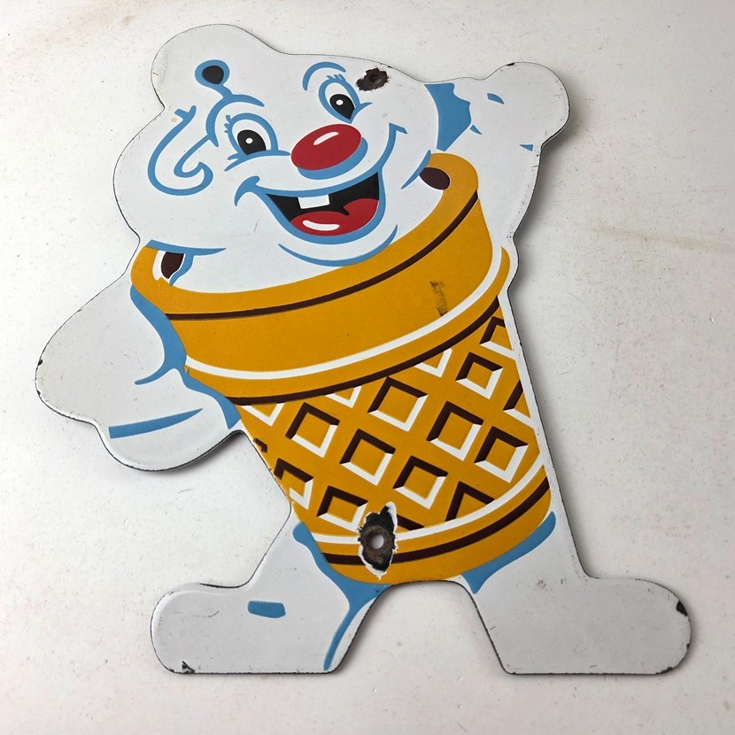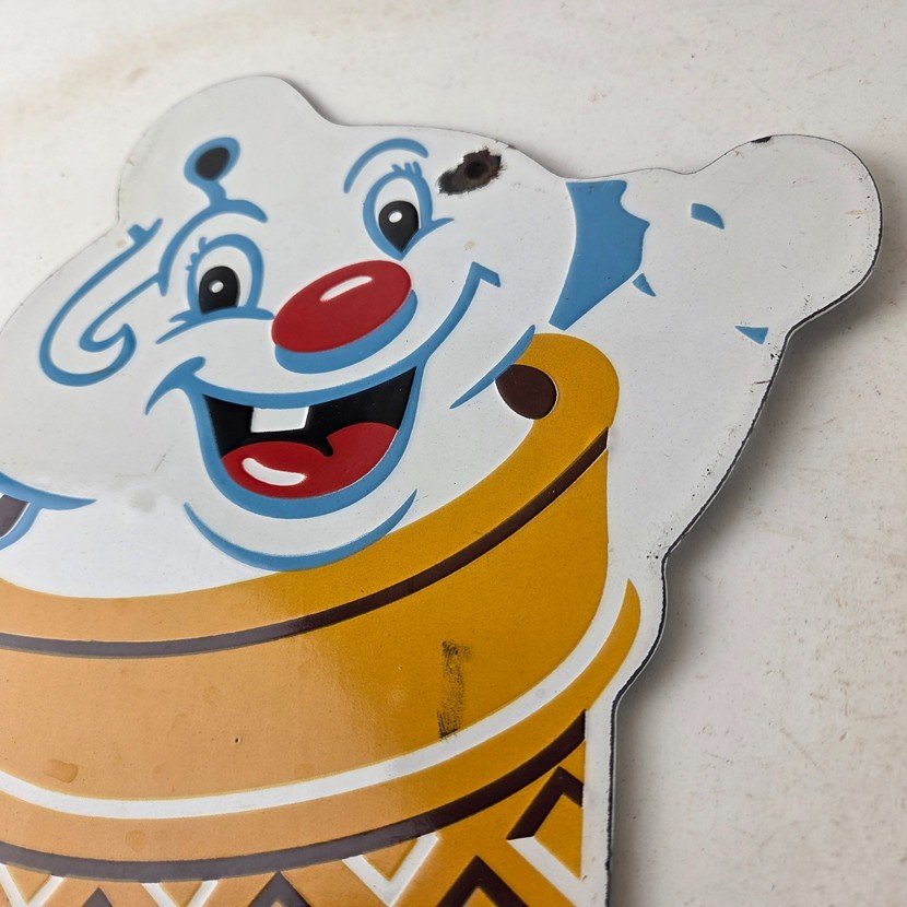 This vintage Fosters Freeze porcelain sign features the iconic Ice Cream cone. This sign is perfect for any Ice Cream cone fan or collector of memorabilia. This sign has high-quality porcelain on both sides and measures at 11″ by 8 1/2″.