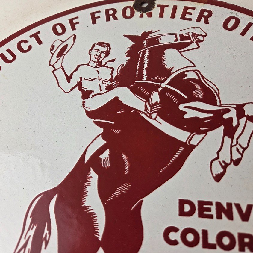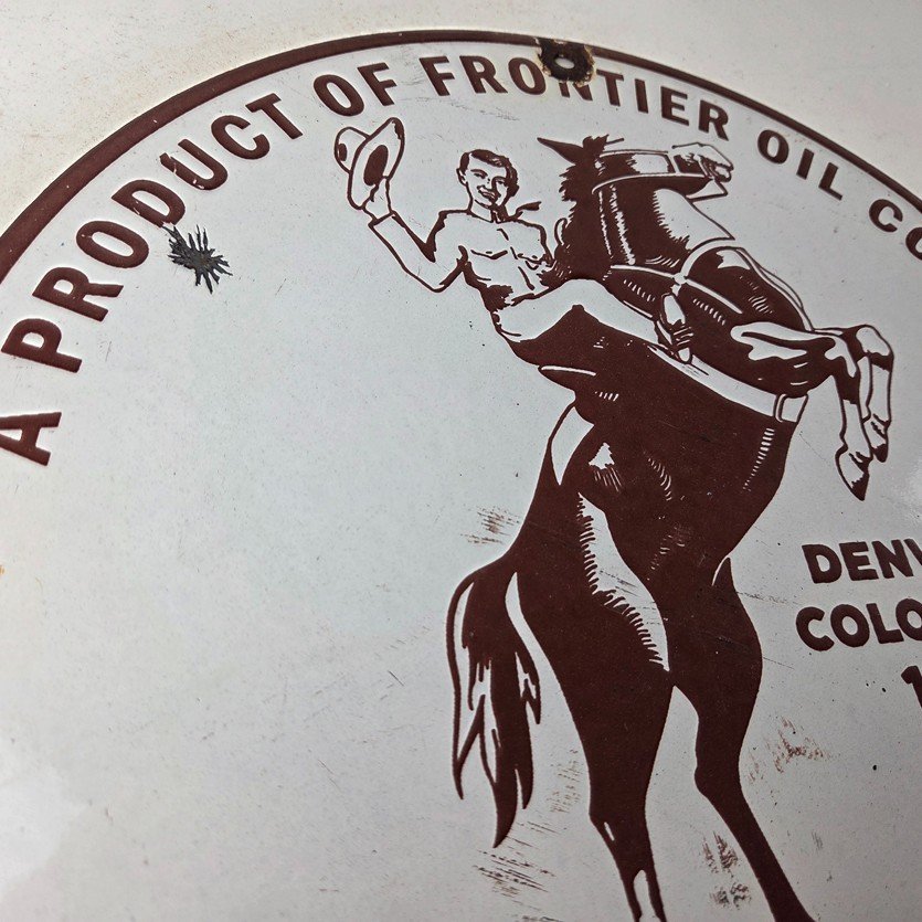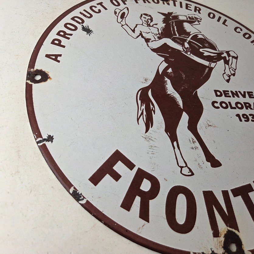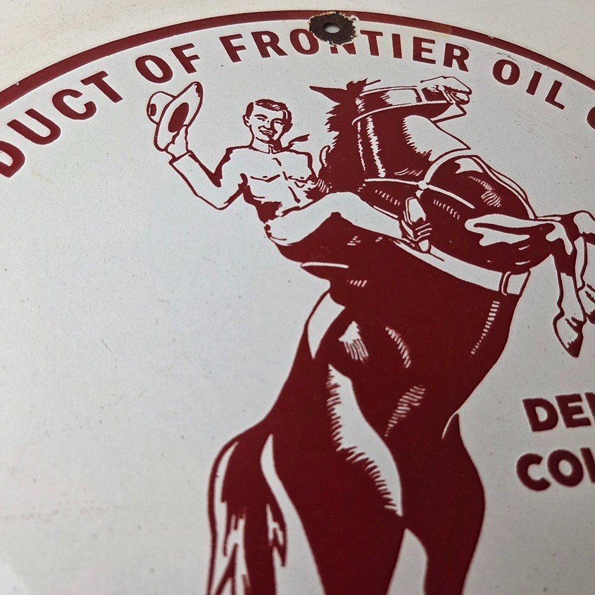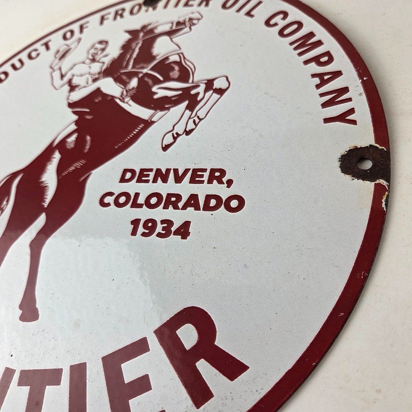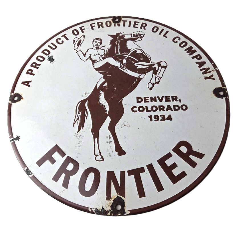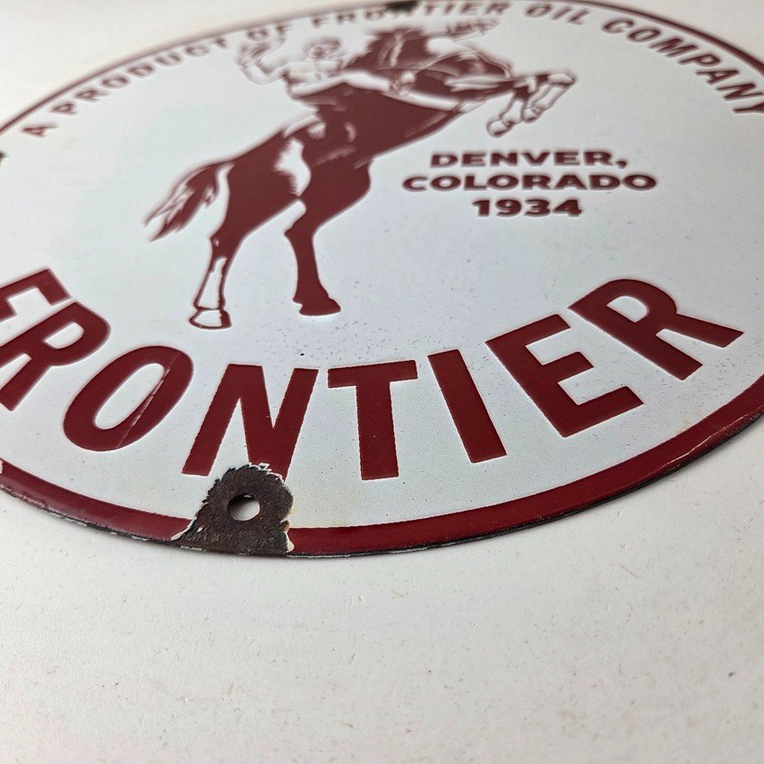 This vintage Frontier Gasoline porcelain sign features a striking design with bold red colors and is made of porcelain material. It is perfect for display in a garage, shop, or man cave. The sign measures 12″ and is in excellent condition, with no major chips or cracks.