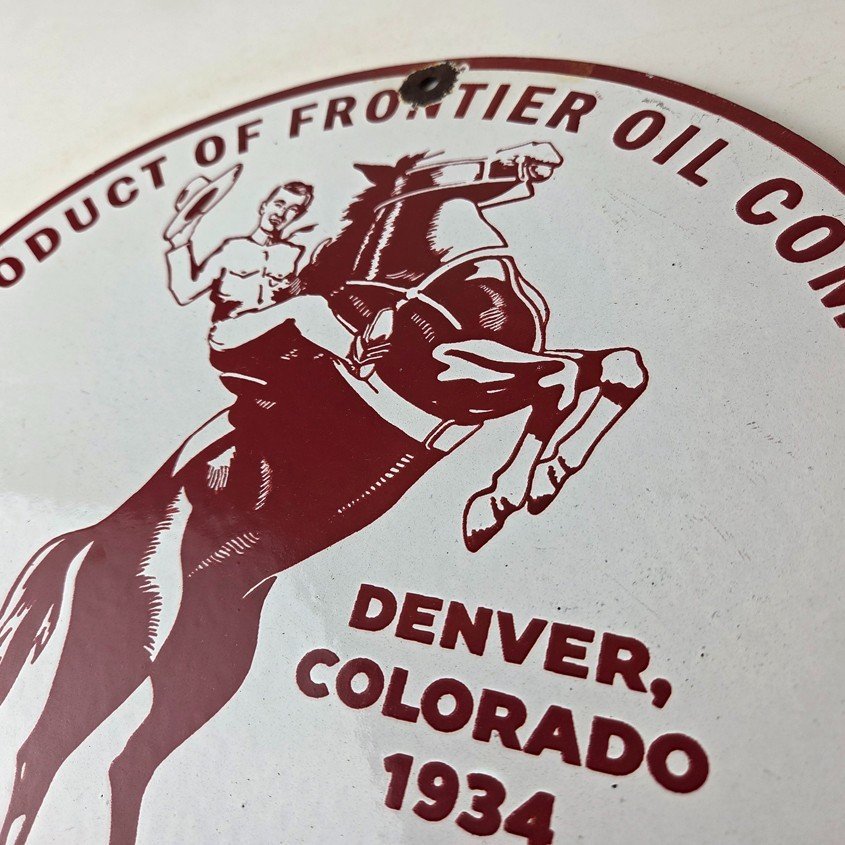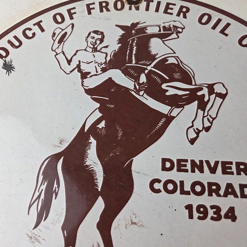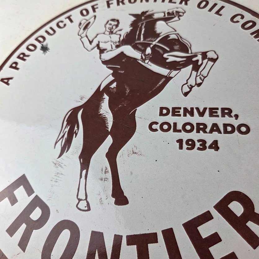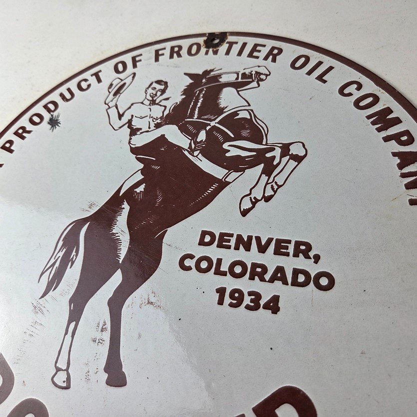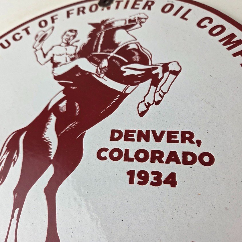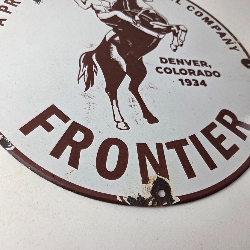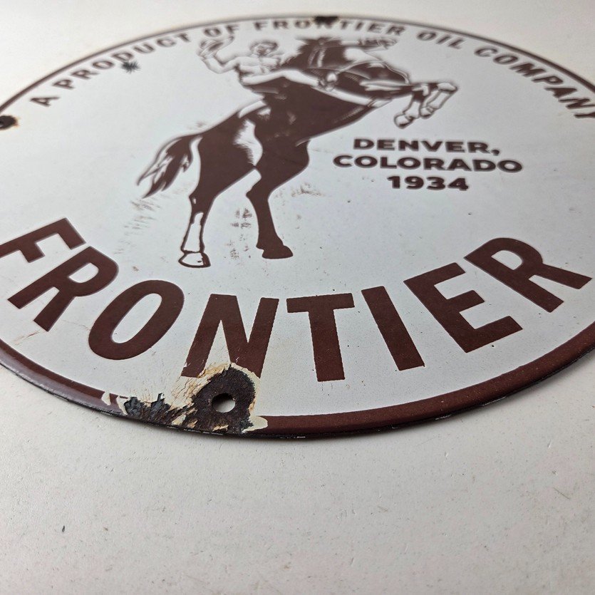 This vintage Frontier Gasoline porcelain sign features a striking design with bold red colors and is made of porcelain material. It is perfect for display in a garage, shop, or man cave. The sign measures 12″ and is in excellent condition, with no major chips or cracks.