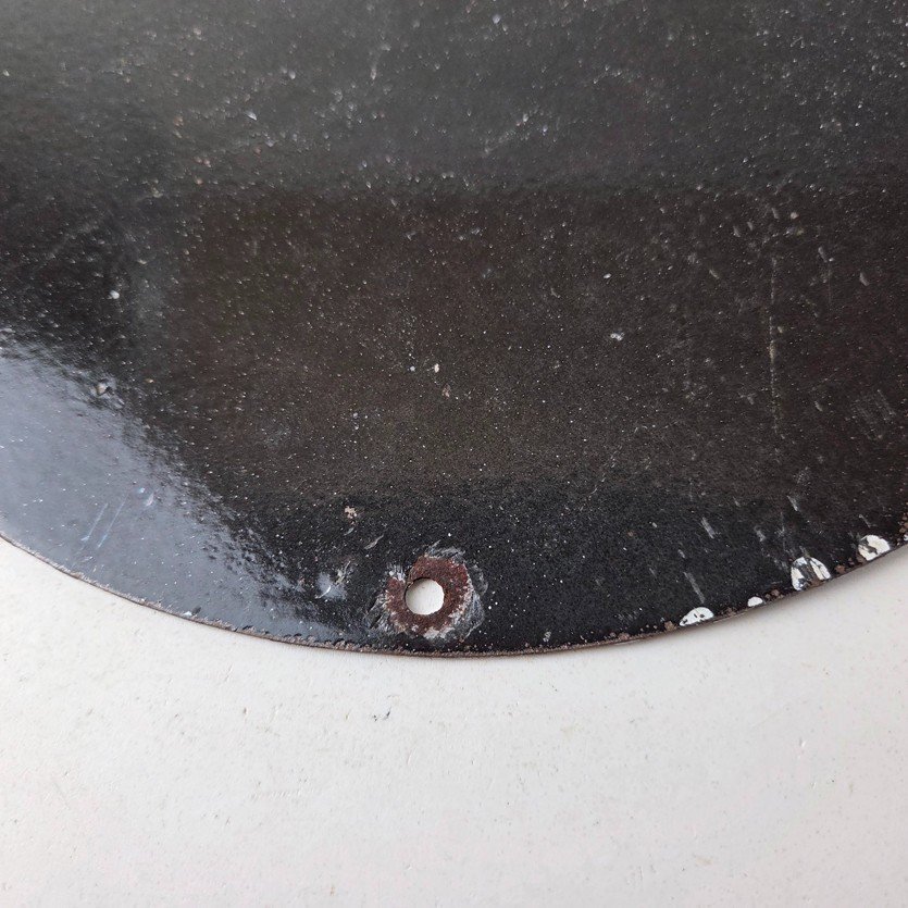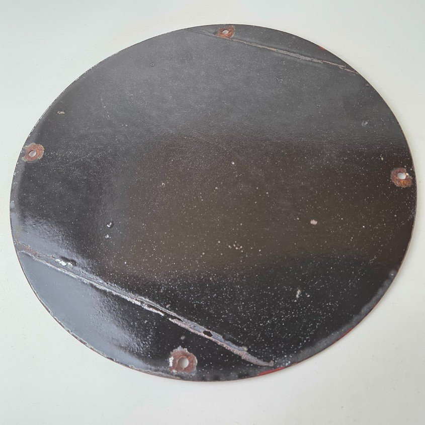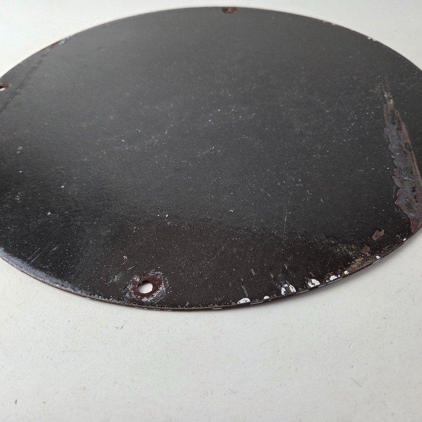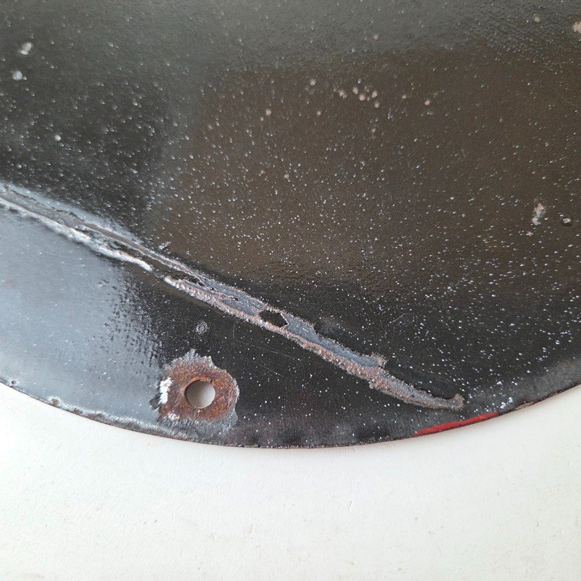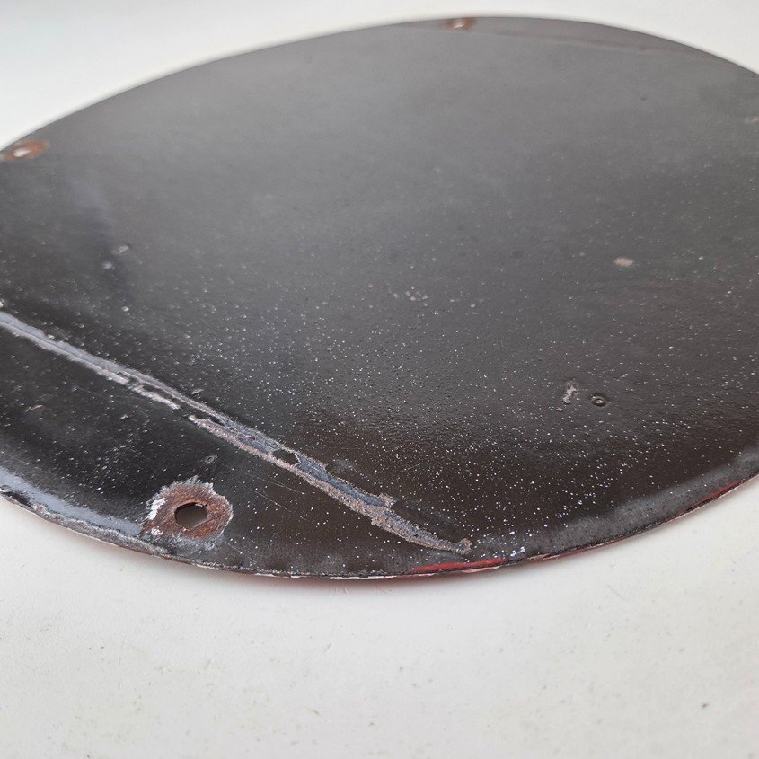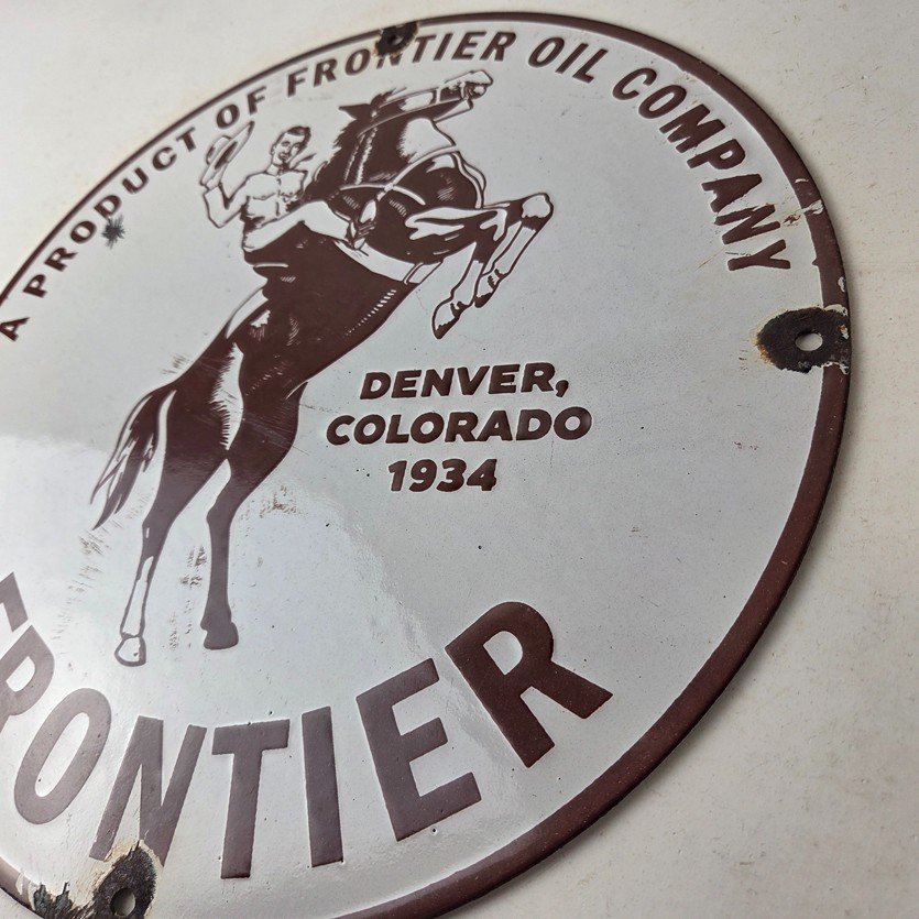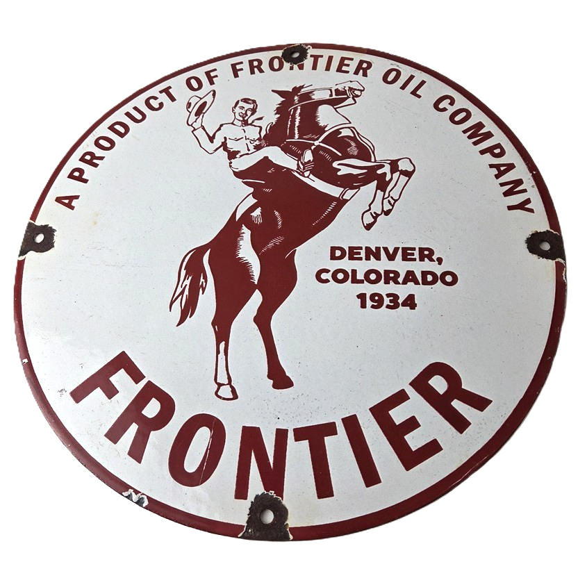 This vintage Frontier Gasoline porcelain sign features a striking design with bold red colors and is made of porcelain material. It is perfect for display in a garage, shop, or man cave. The sign measures 12″ and is in excellent condition, with no major chips or cracks.