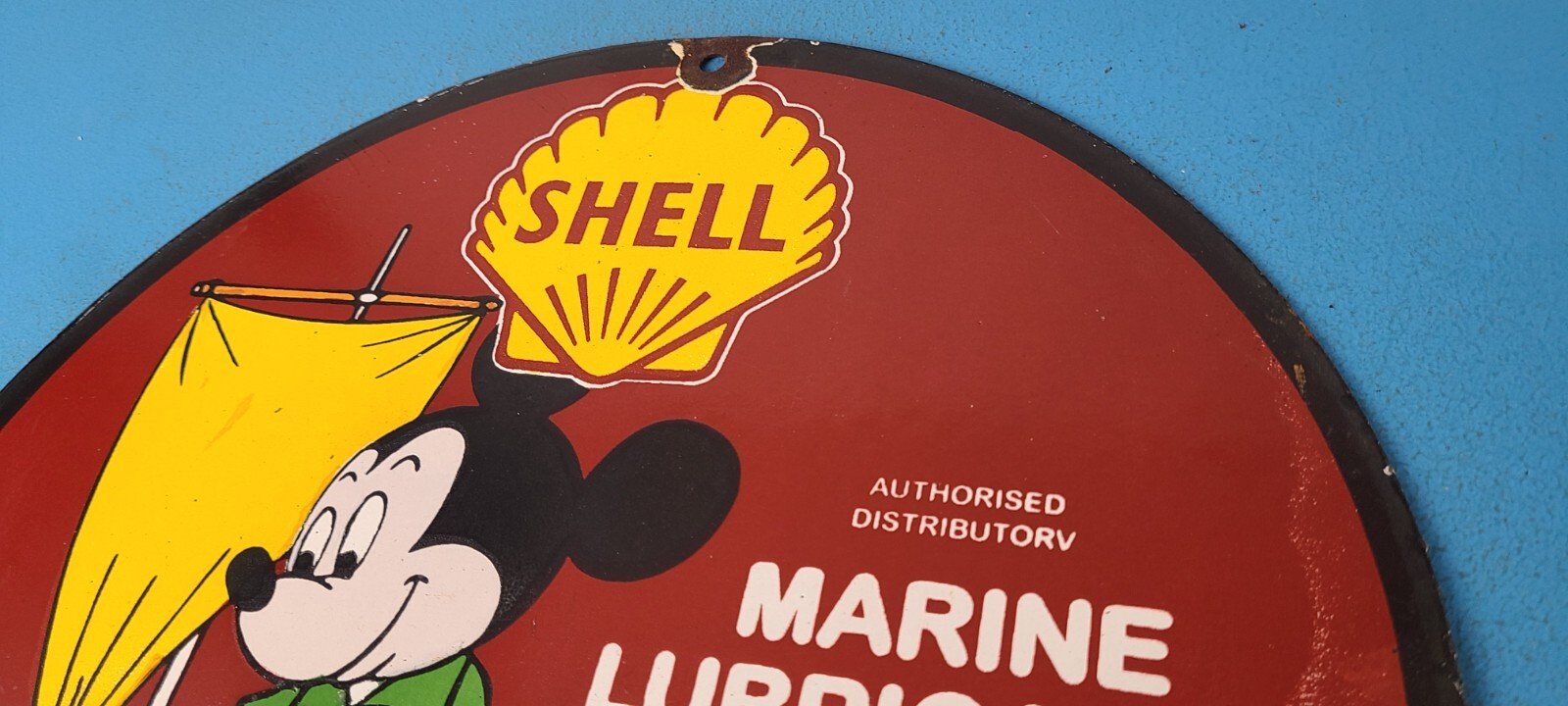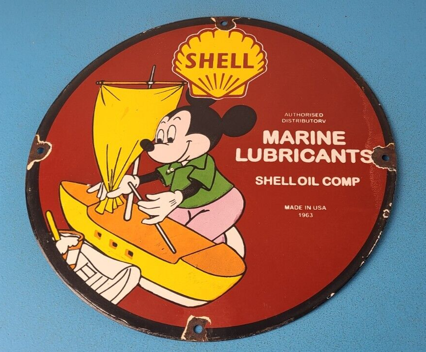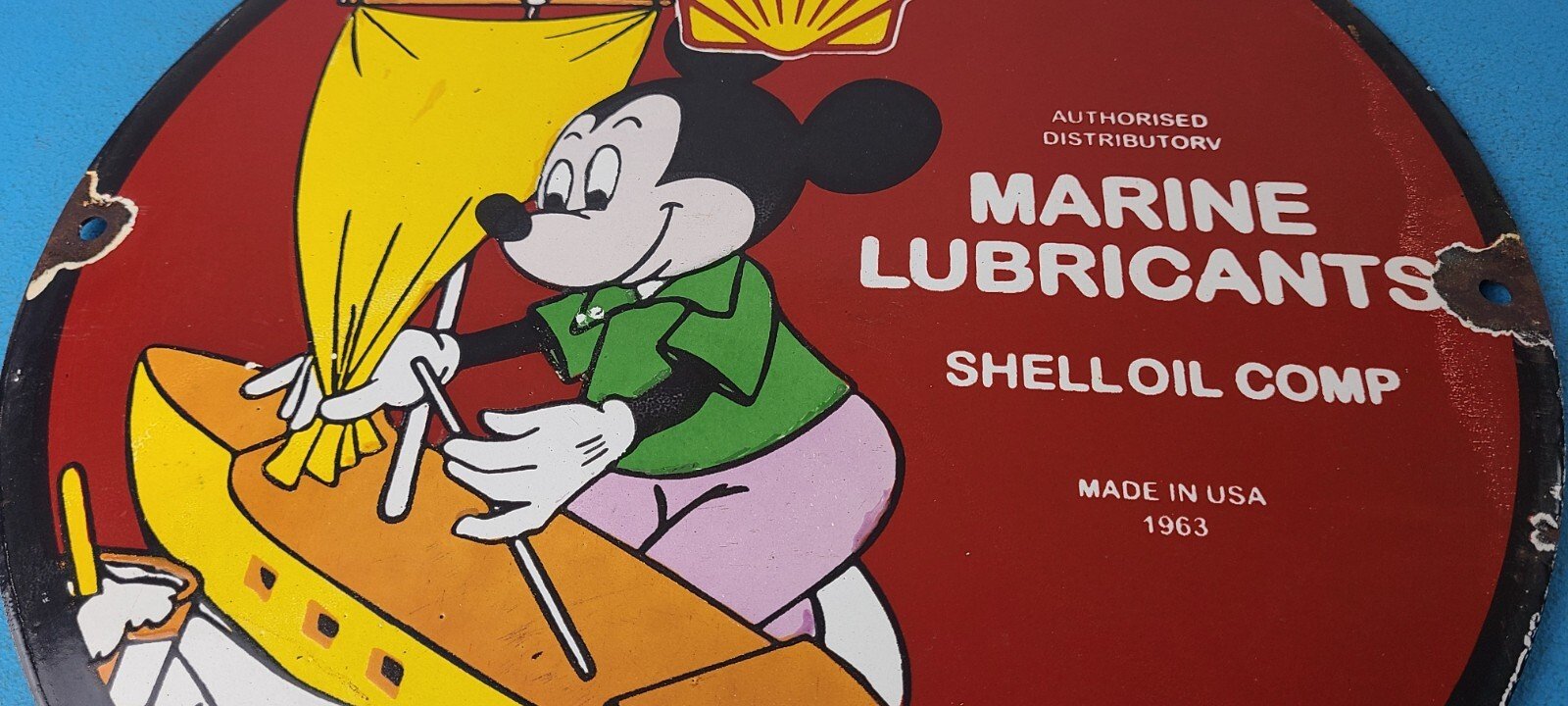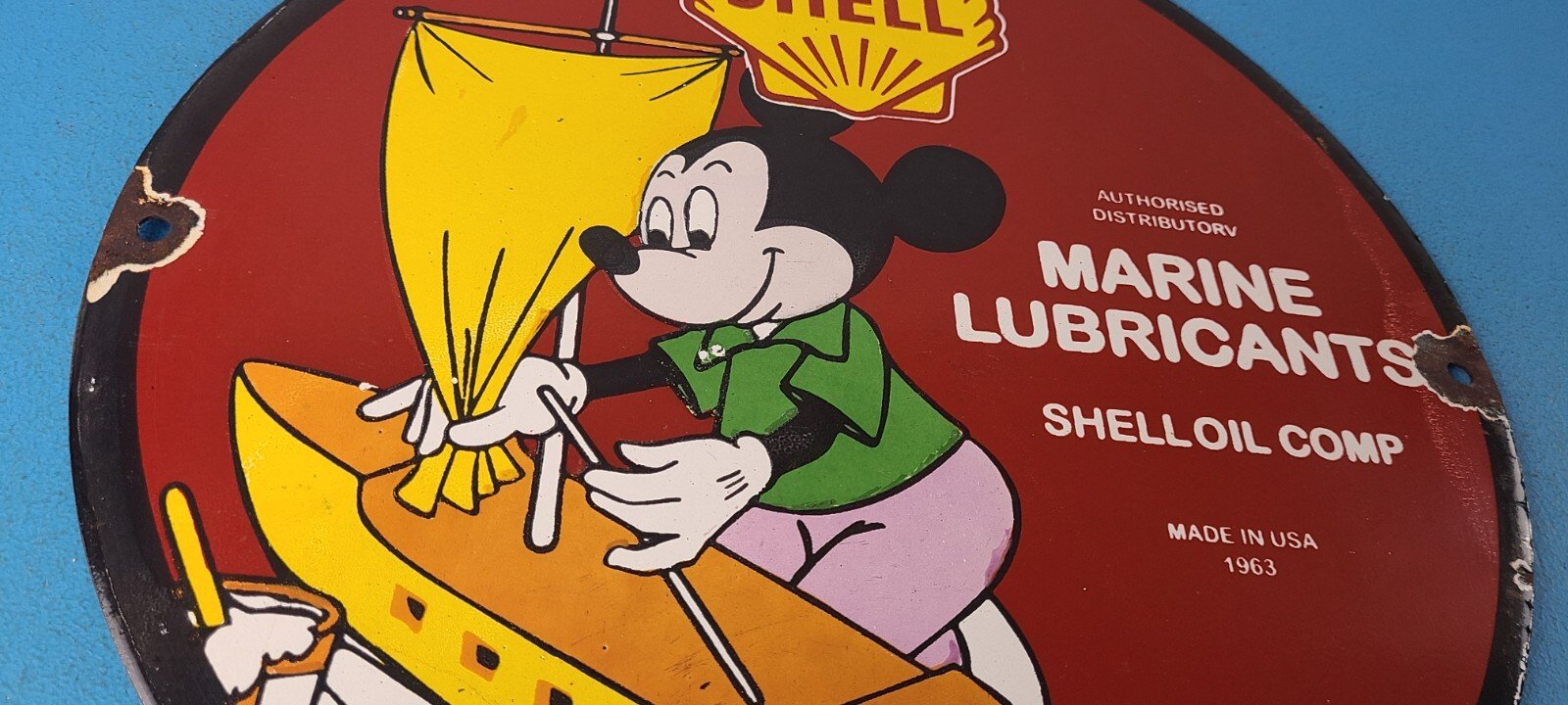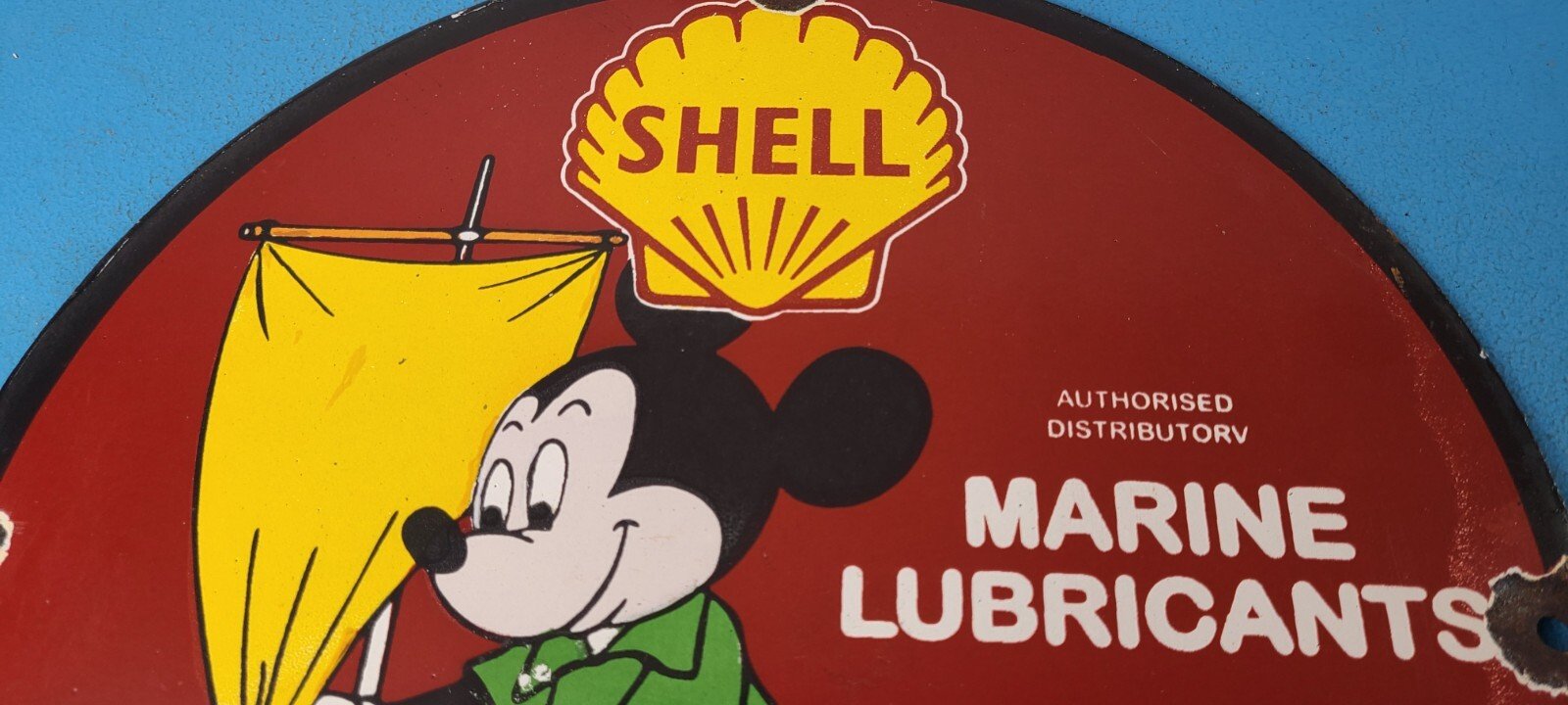 This vintage Shell Gasoline porcelain sign features the beloved character Mickey Mouse. Measuring 12 inches in size, this porcelain is in excellent condition with amazing gloss.