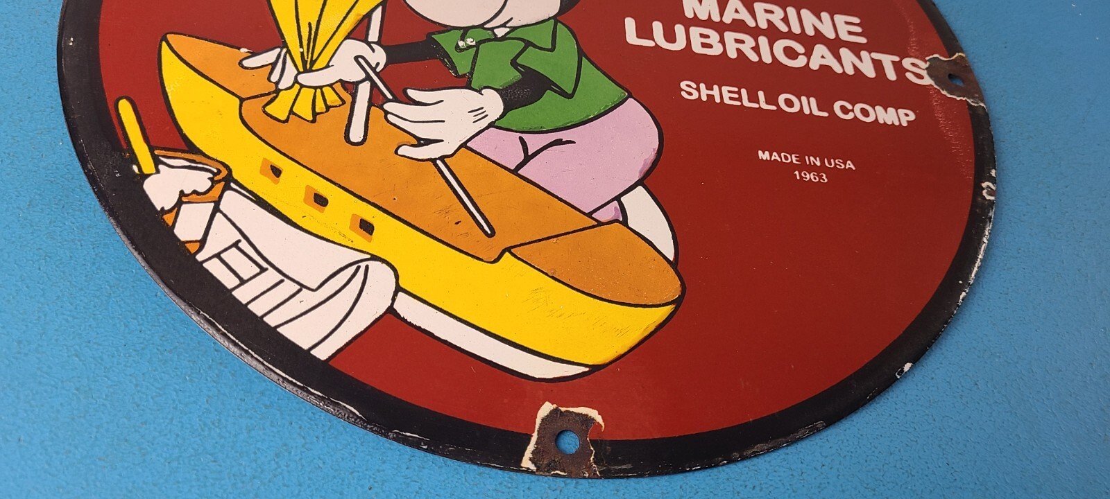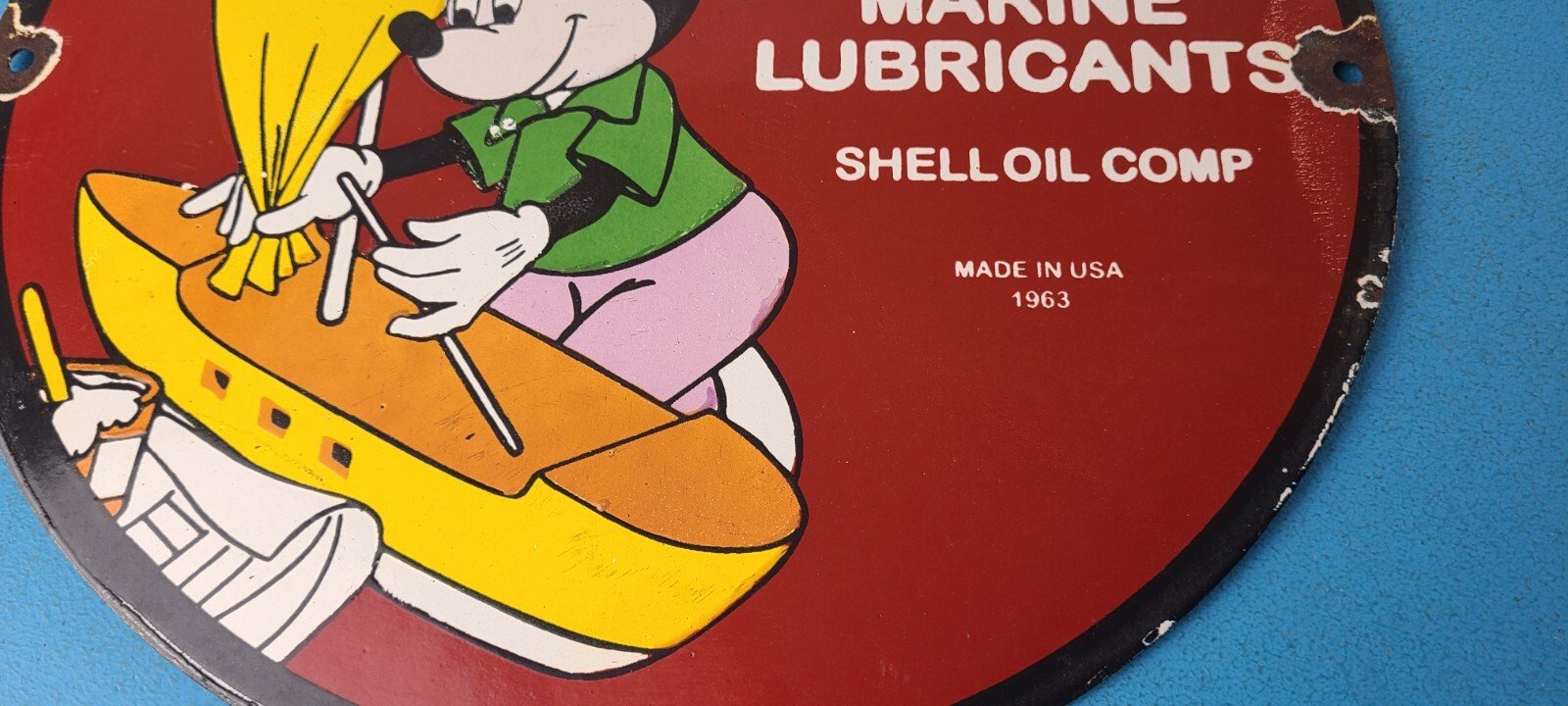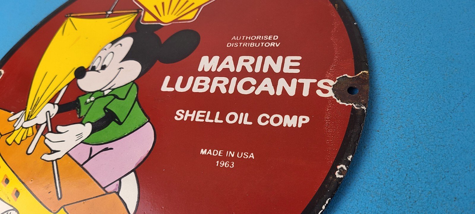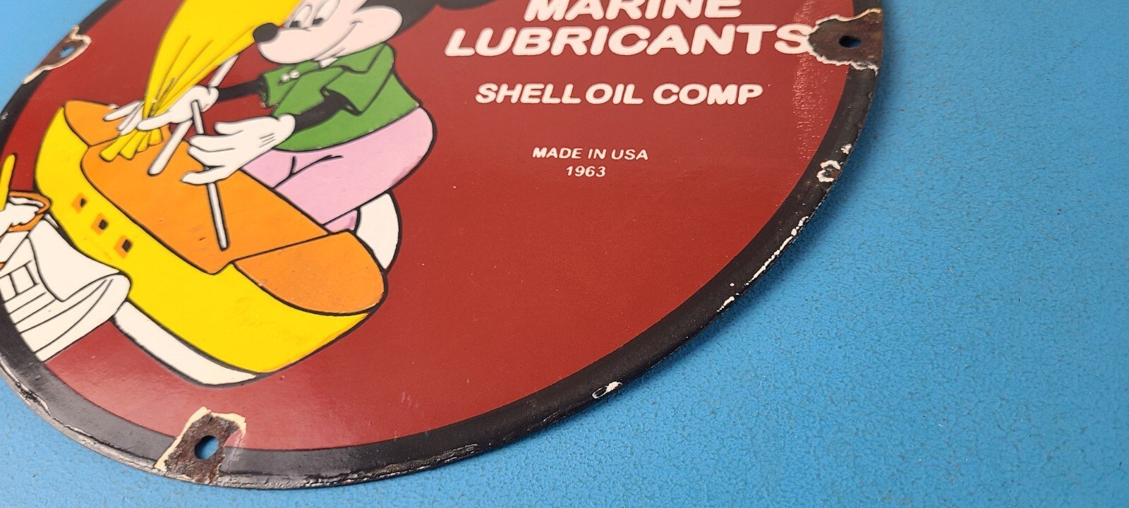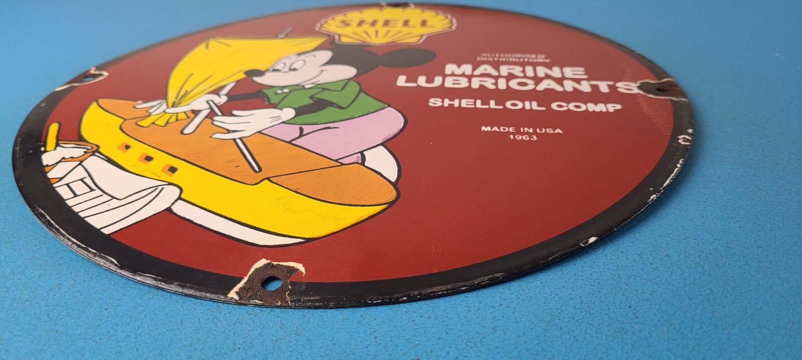 This vintage Shell Gasoline porcelain sign features the beloved character Mickey Mouse. Measuring 12 inches in size, this porcelain is in excellent condition with amazing gloss.