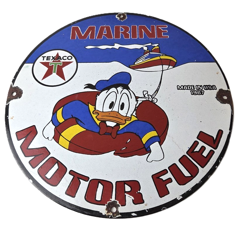 This vintage Texaco Gasoline porcelain sign features Texaco Gasoline and the iconic character of Walt Disney Donald Duck. The sign boasts vibrant colors, making it perfect for any collector of gas and oil advertising memorabilia. The sign is made of porcelain and is in excellent shape, showcasing the durability and craftsmanship of vintage gas pump signs.