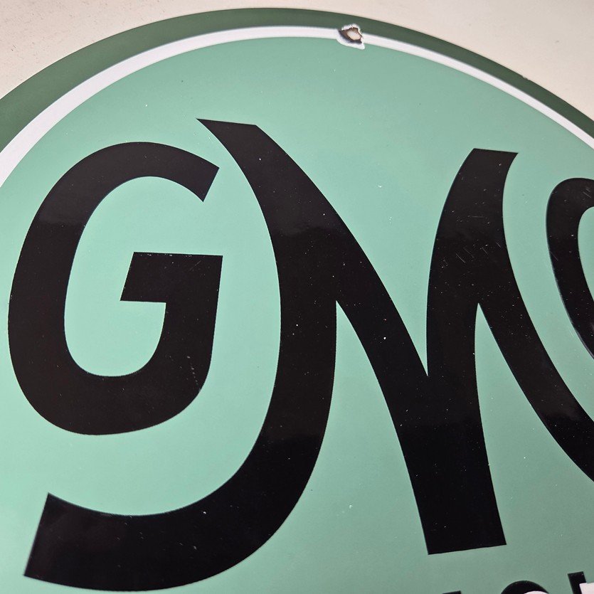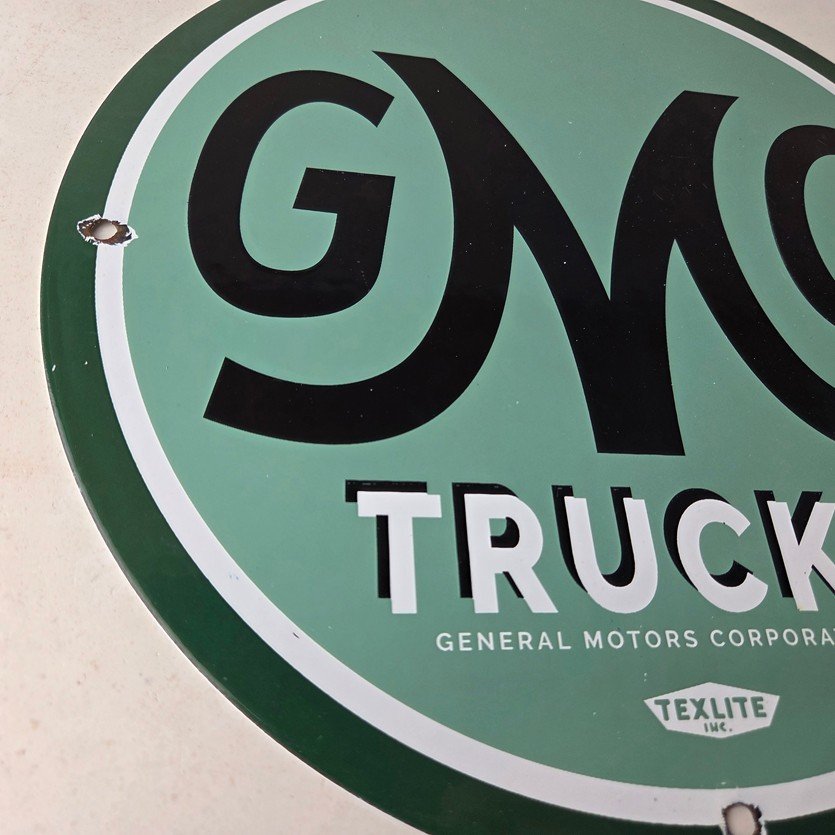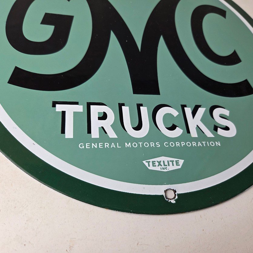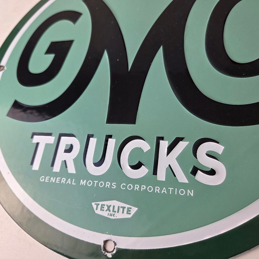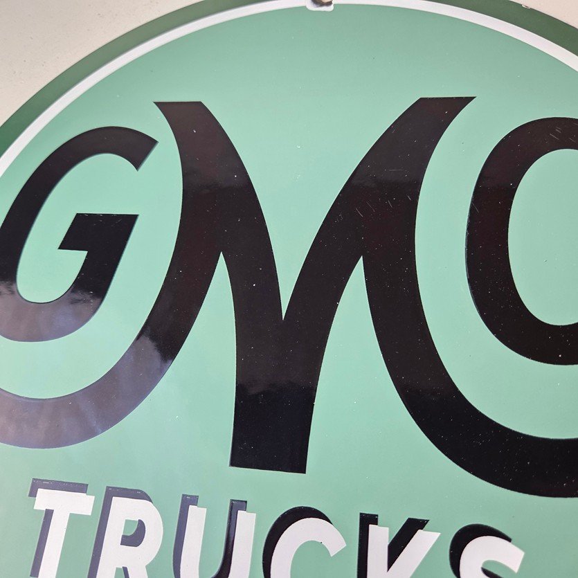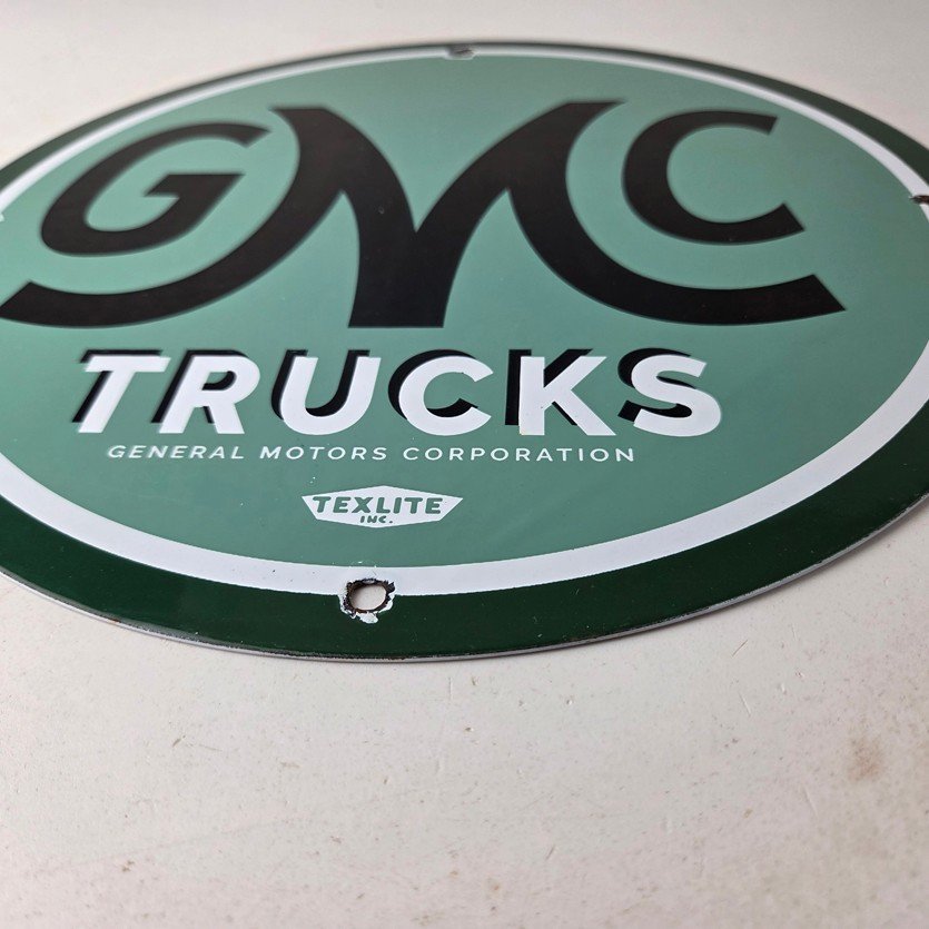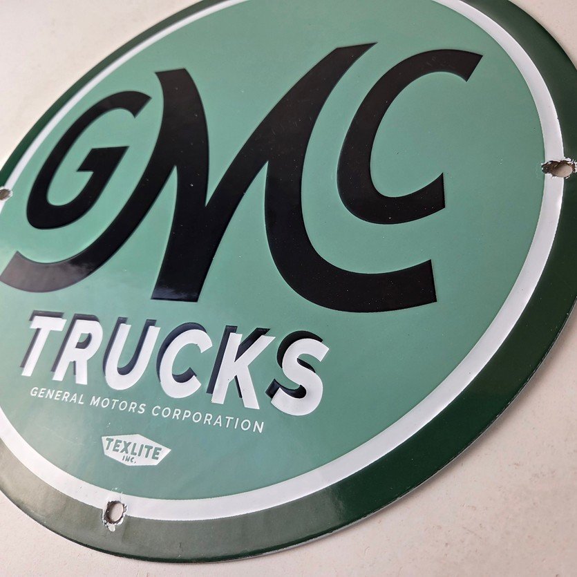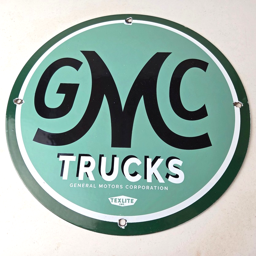 This vintage GMC Trucks porcelain sign is a must-have for any collector of automobile advertising especially gas and oil memorabilia. It features the recognizable GMC lettering on a 11 3/4-inch porcelain surface.
