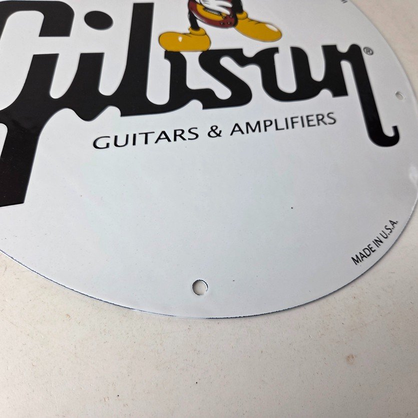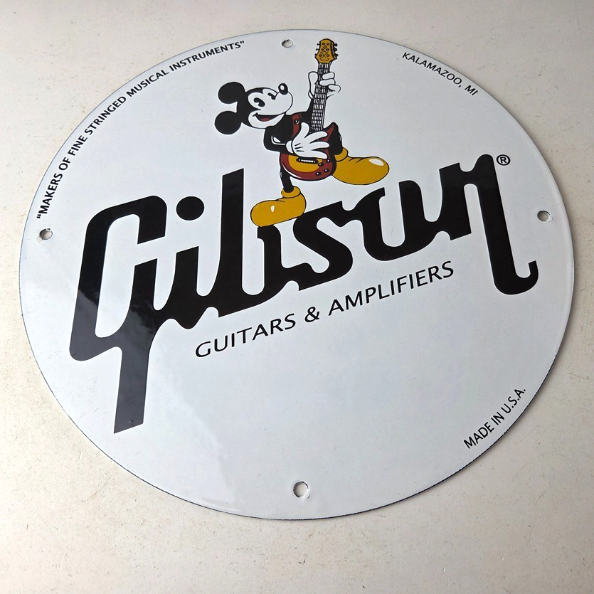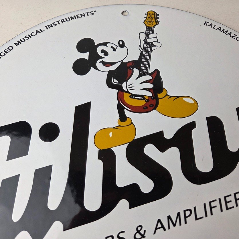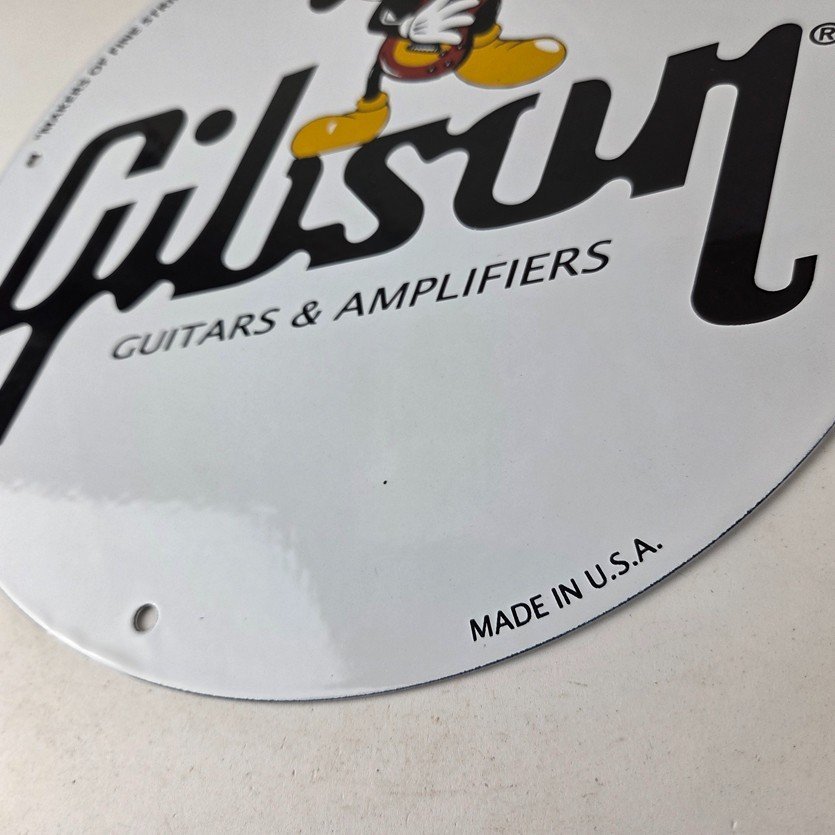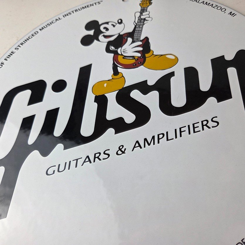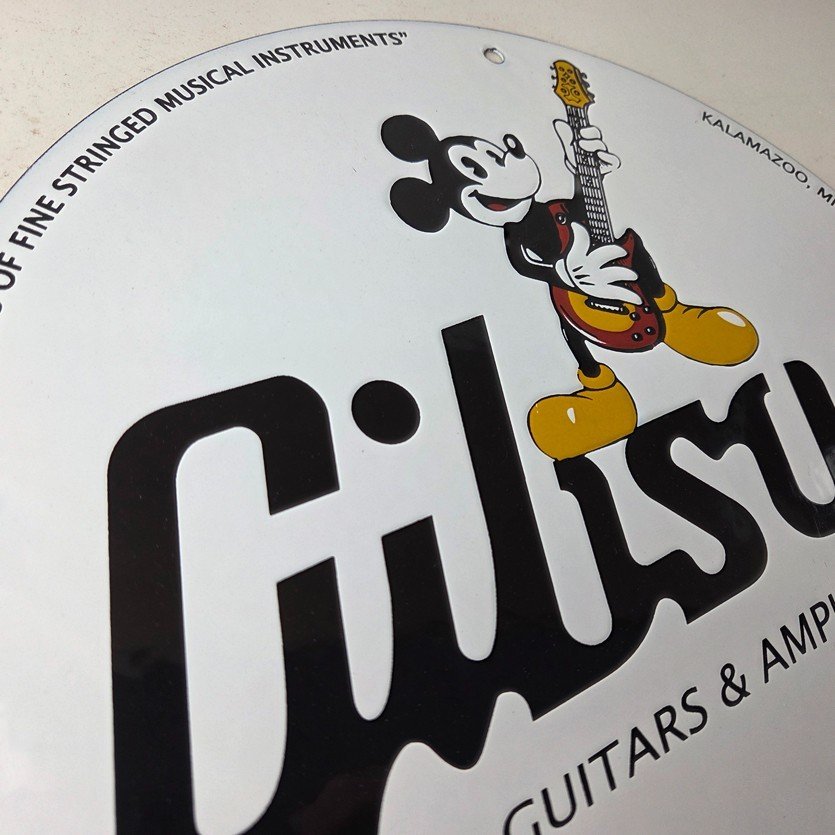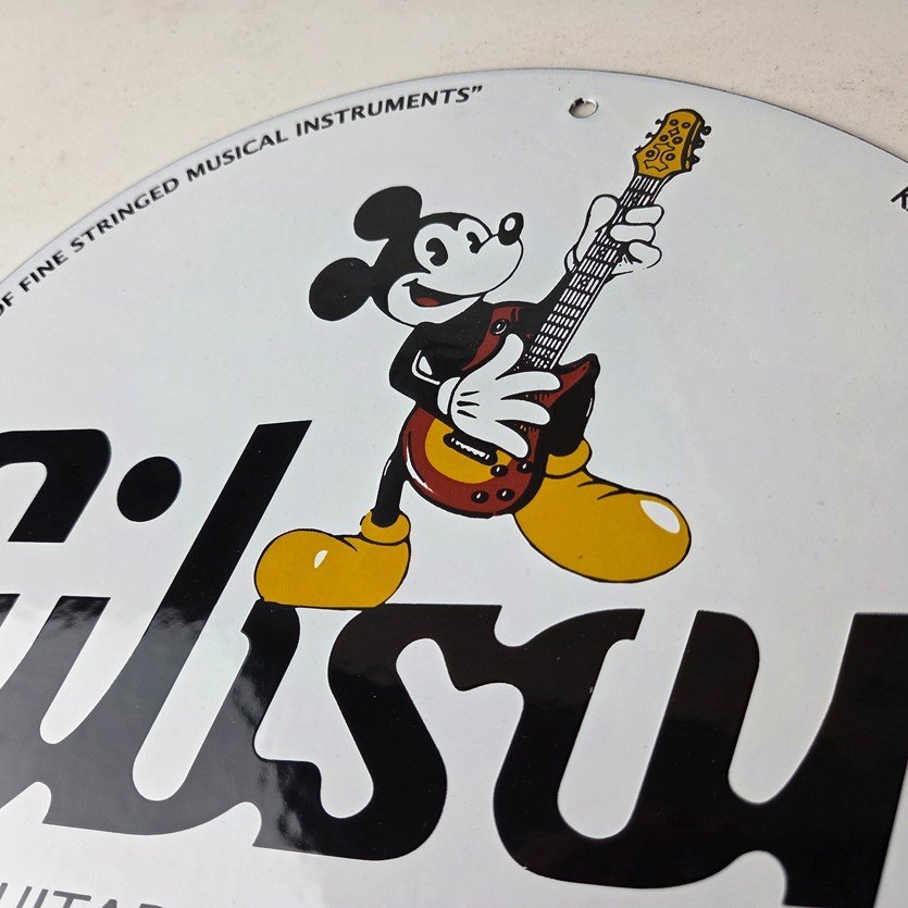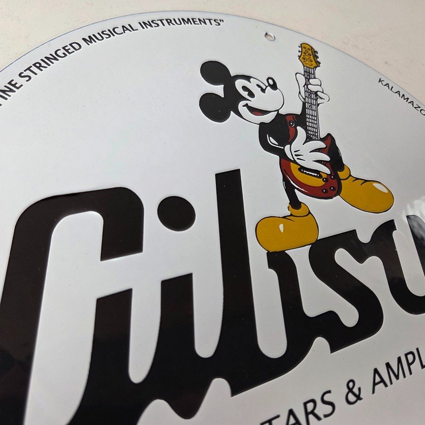This vintage porcelain sign features Mickey Mouse holding a Guibson Guitar and is a must-have for any collector of gas and oil memorabilia. The sign is 11 3/4″ in size and boasts vibrant colors and gloss. It is a perfect addition to any collection of gas and oil advertising and showcases a unique Walt Disney character theme. This sign will make a great addition to any collection and is sure to be a conversation starter. This sign will enhance your mancave, collection, shop, or garage.