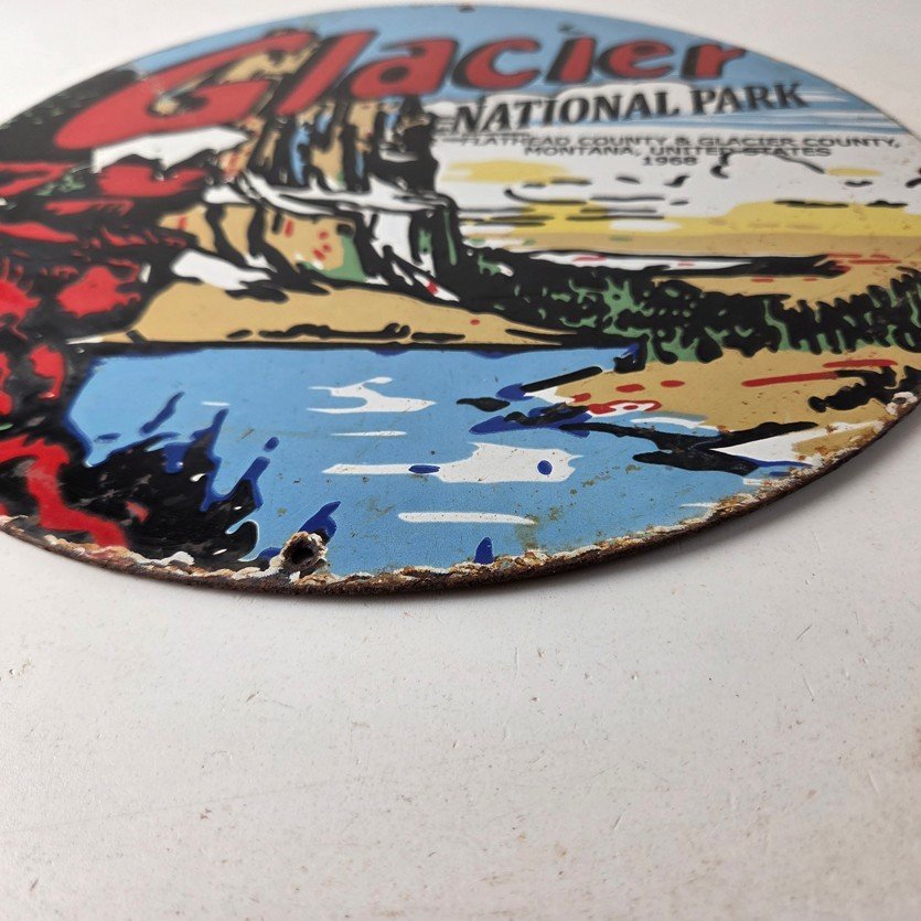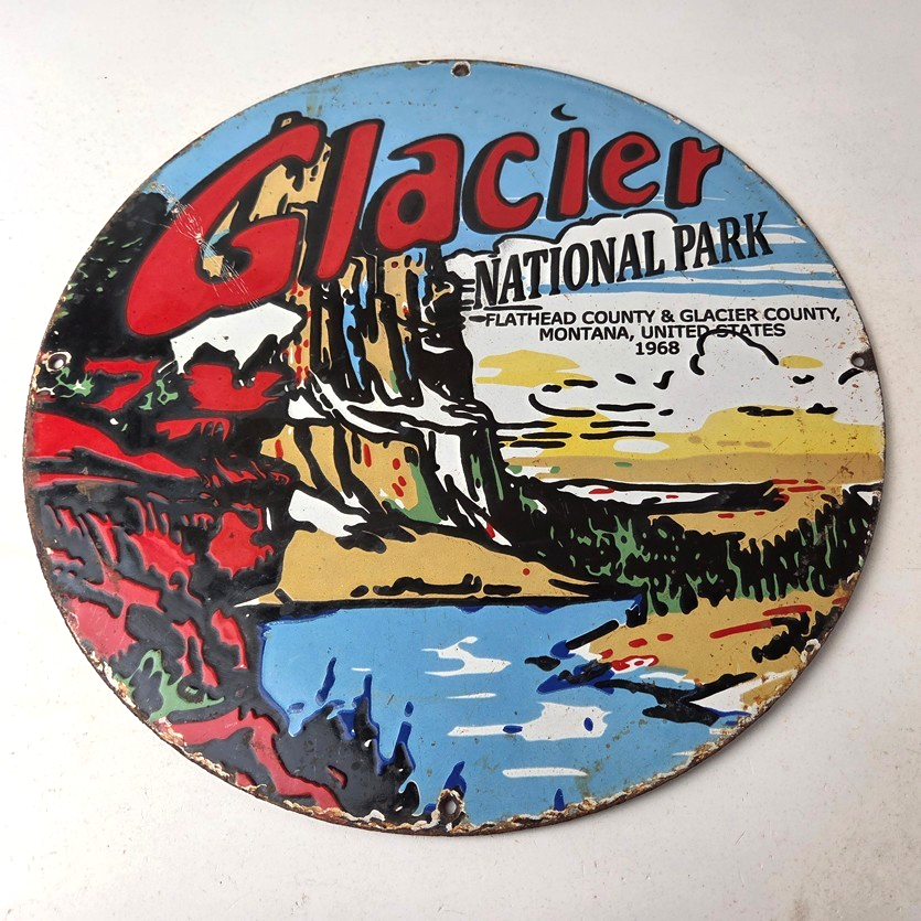 This is a vintage Glacier National Park Great Northern Railway porcelain sign (also known as a Glacier National Park gas station pump plate), measuring 12 inches round. It features the classic promotional design: “GLACIER NATIONAL PARK” shown at the top in red.