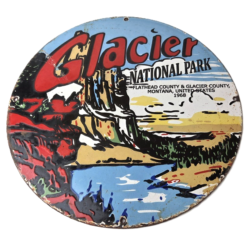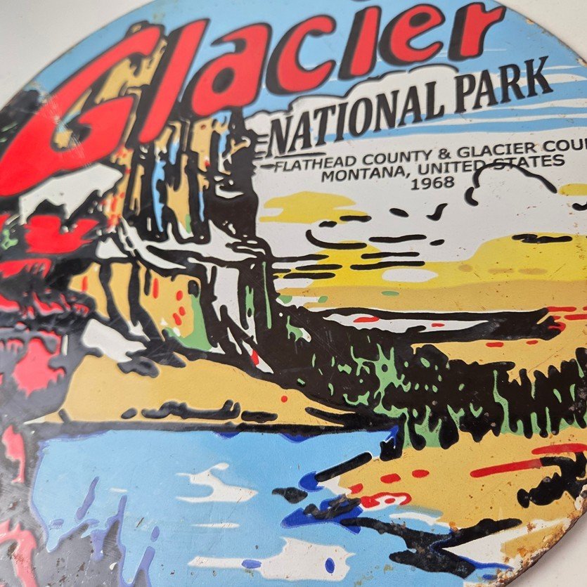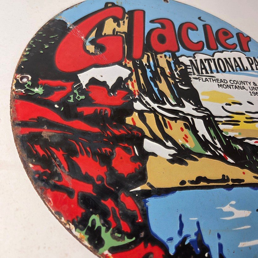 This vintage Glacier National Park goat sign makes a great addition to a garage, shop display, man cave, cabin, or any Glacier National Park memorabilia collection, vintage railroad advertising collection, Great Northern Railway sign collection, or Americana national park sign collection.