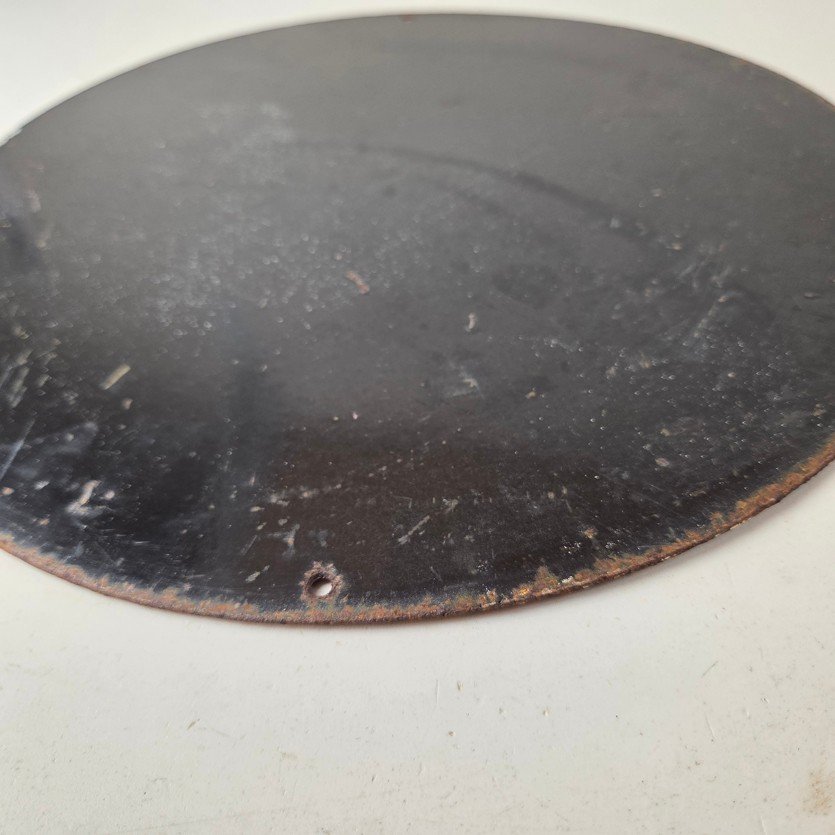 Made of porcelain enamel on steel with patina and wear: rust spotting around the mounting holes, minor edge chips, light surface scratches, and minimal discoloration. This is a porcelain enamel advertising sign in excellent condition, exactly as shown in the photos.
