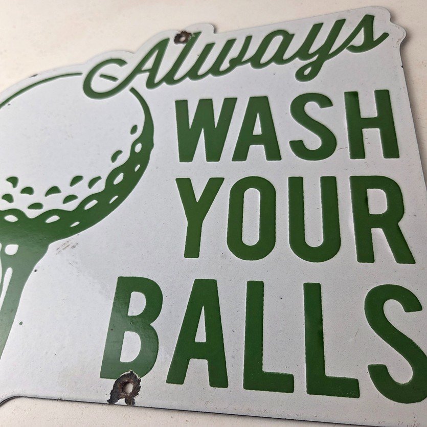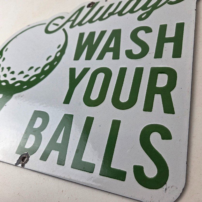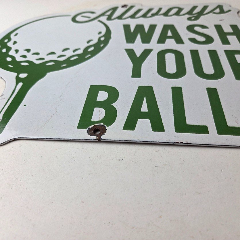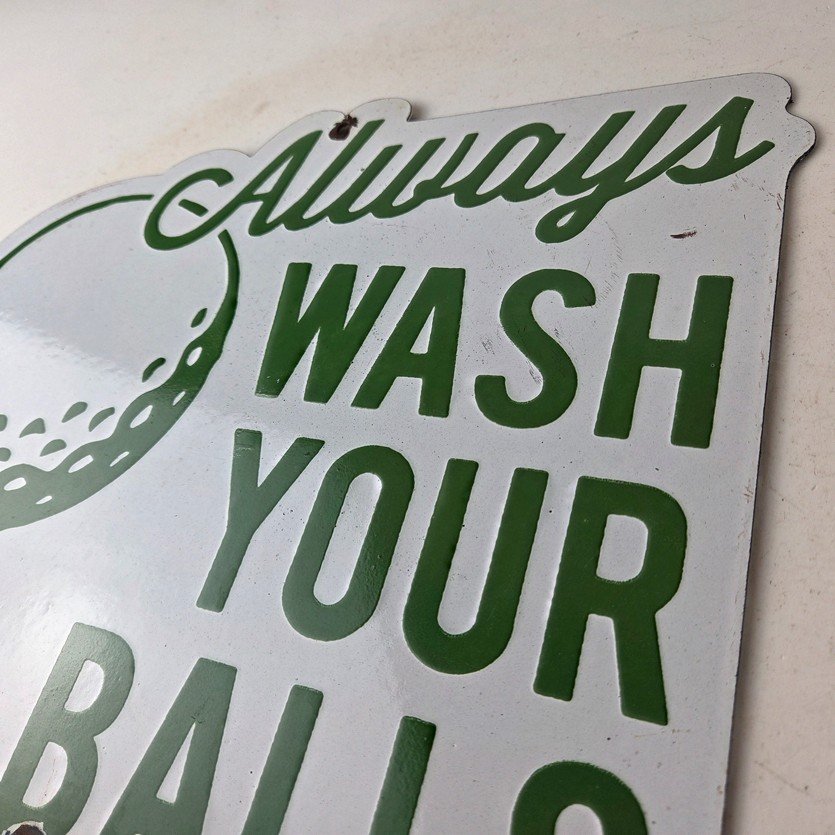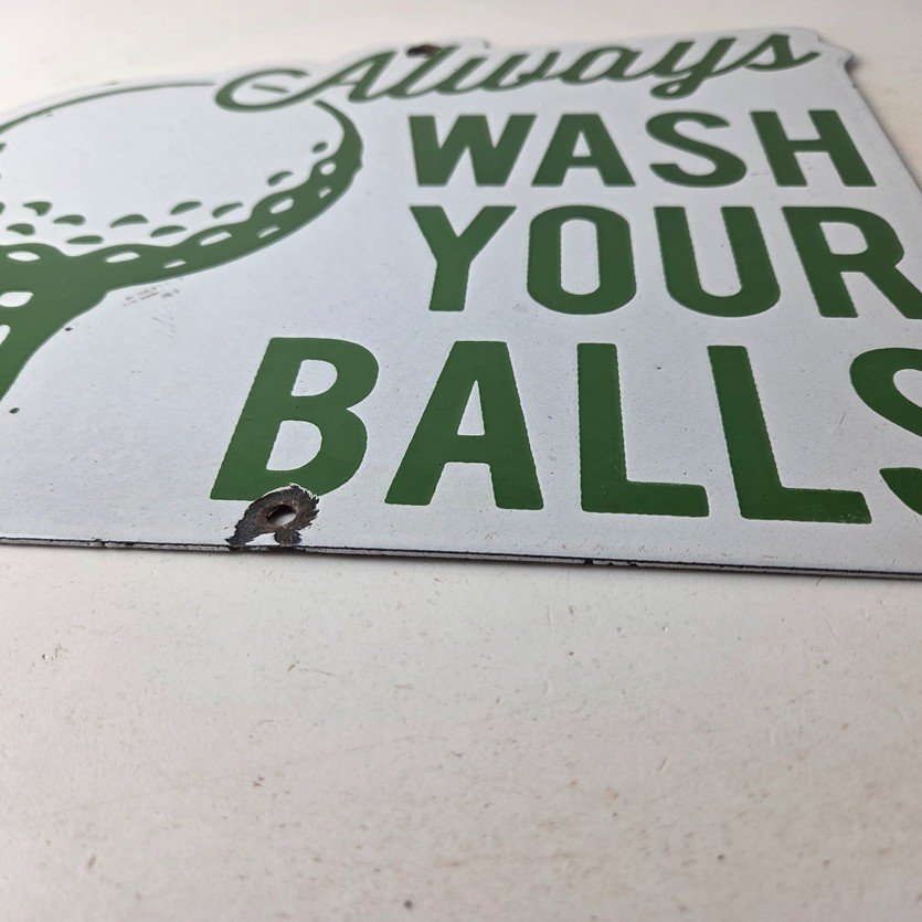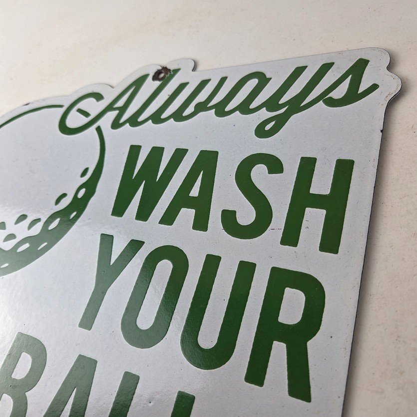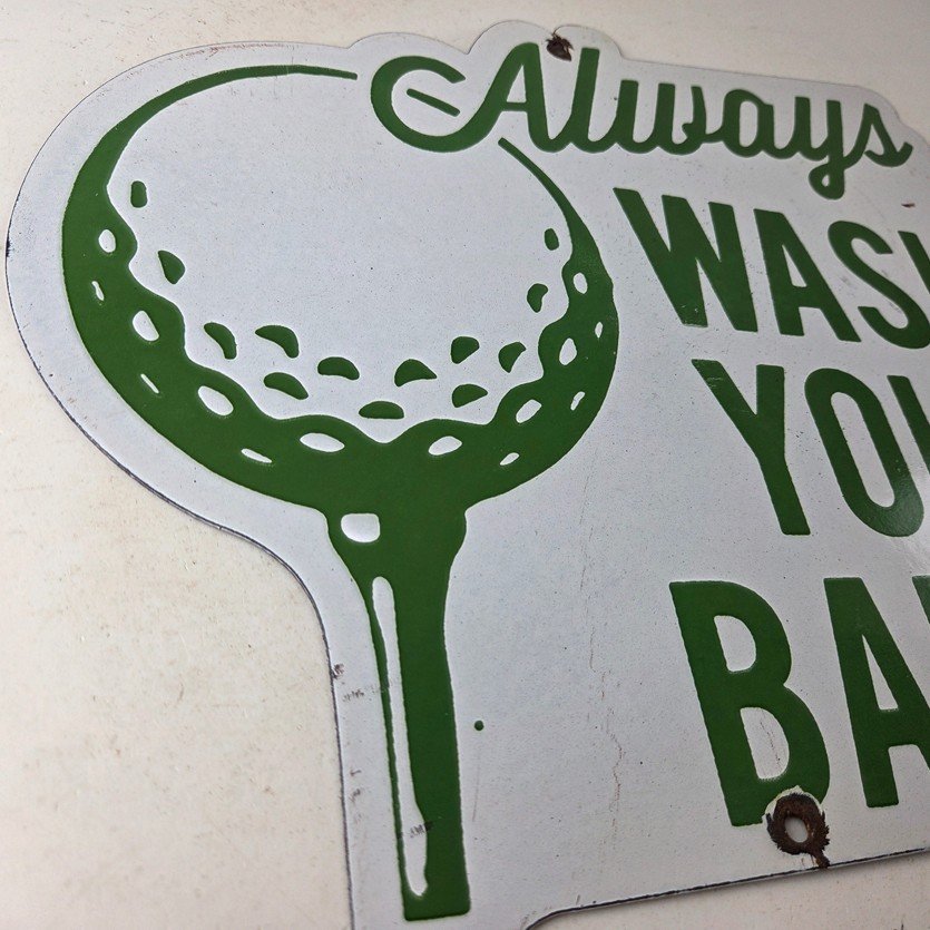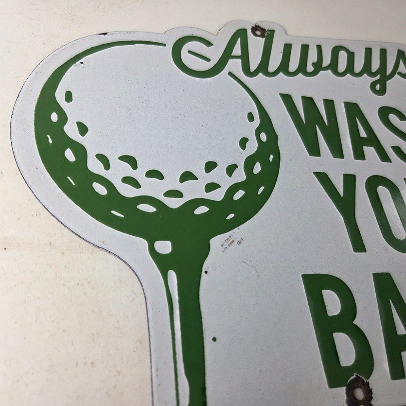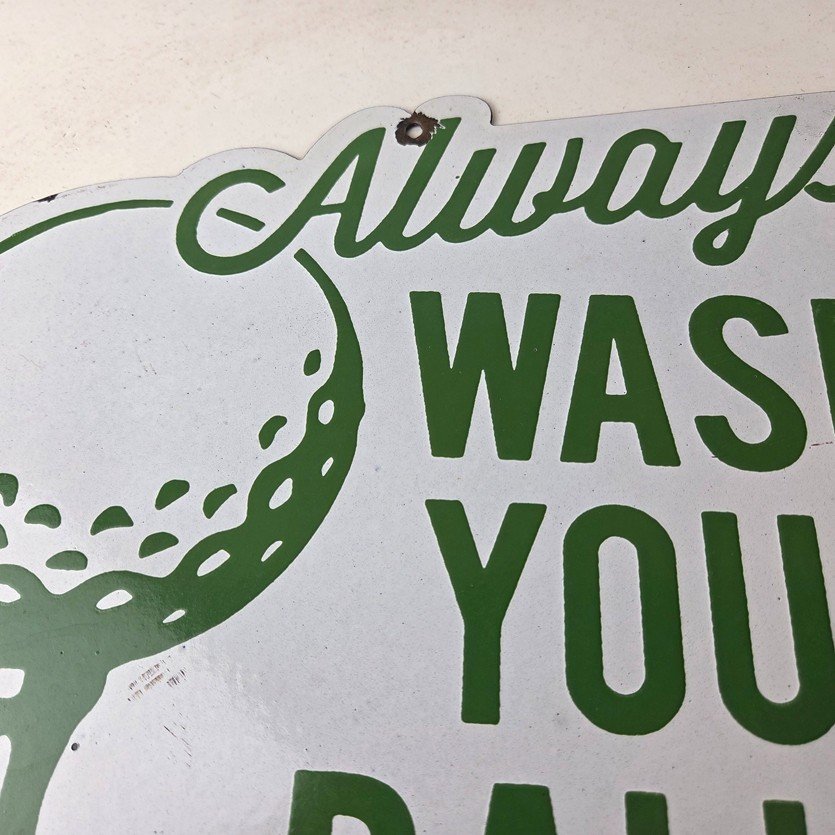 This vintage Golf porcelain sign features the large lettering that says Always Wash your Balls. This sign is perfect for any golf fan or collector of sports memorabilia. This sign has high-quality porcelain on both sides and measures at 12″ by 10.5″ tall.