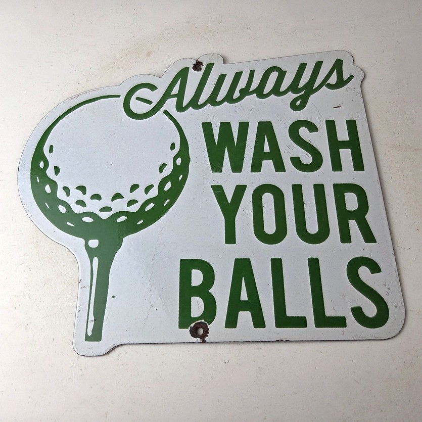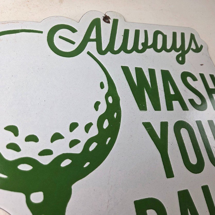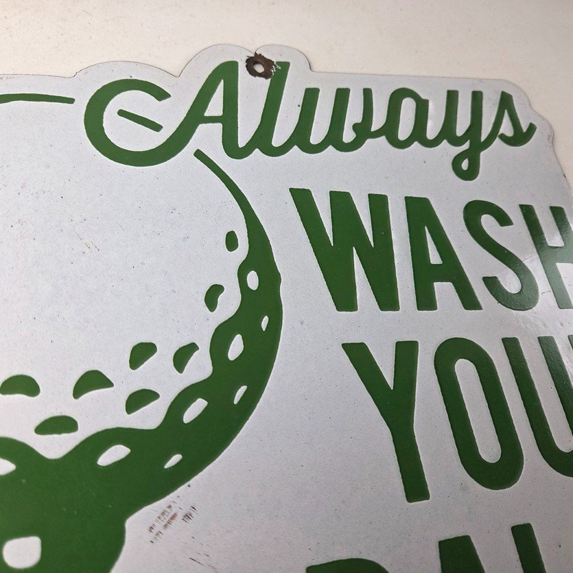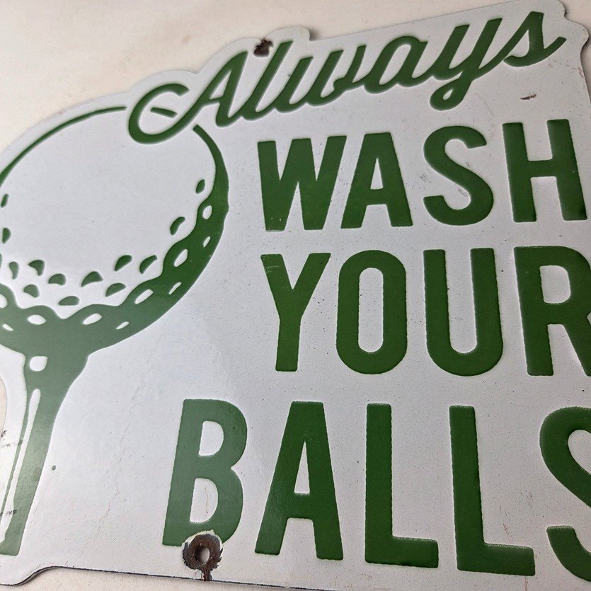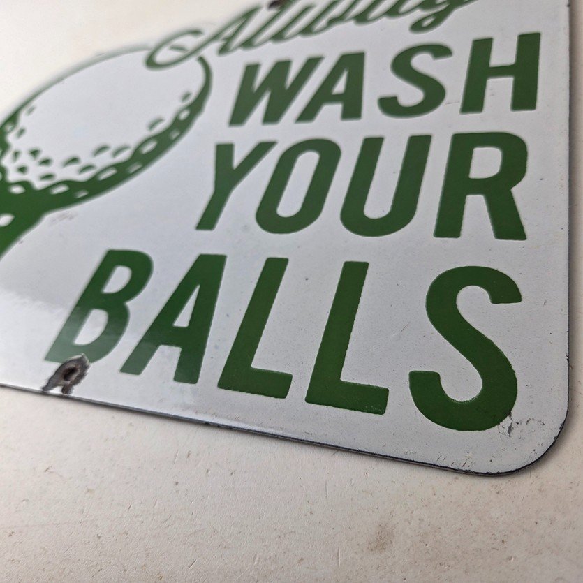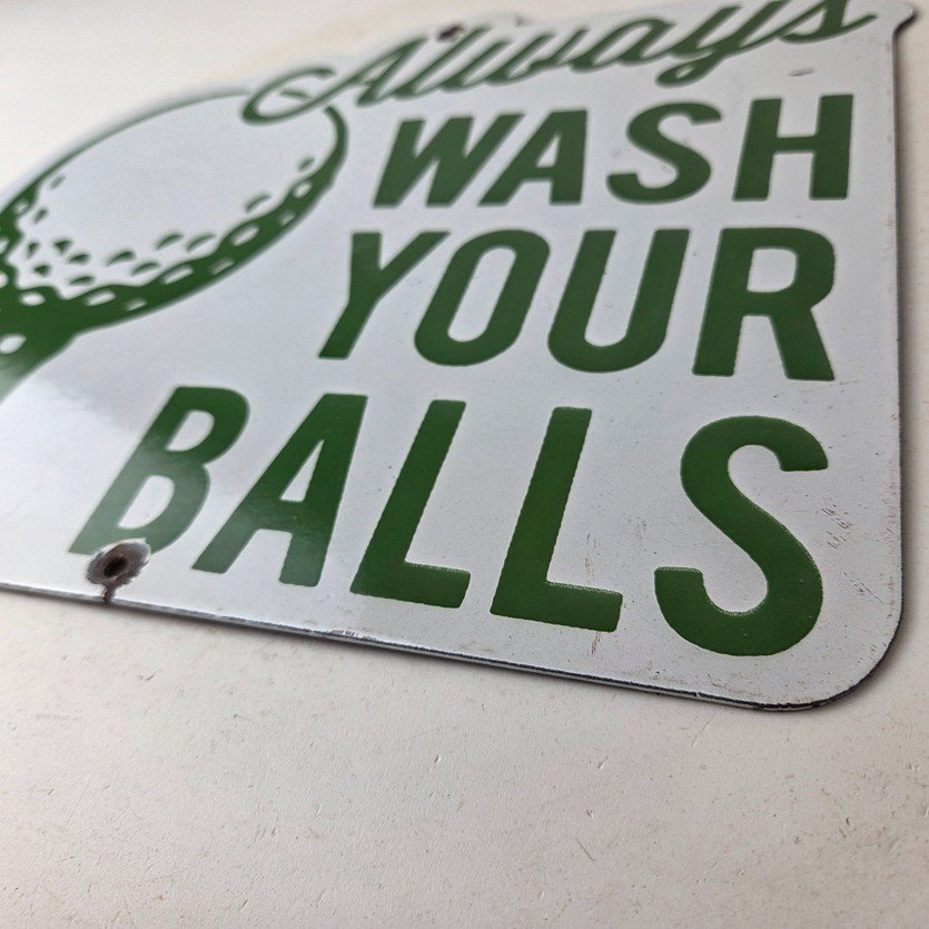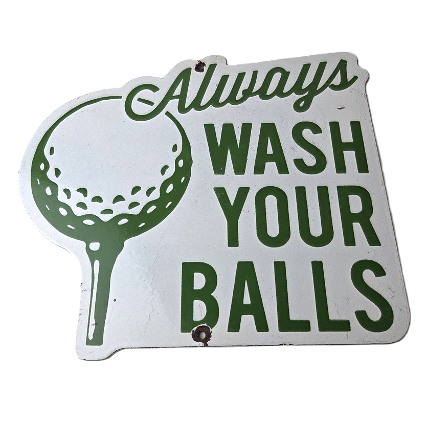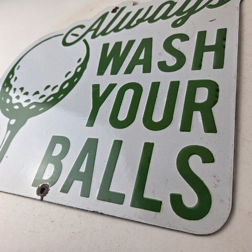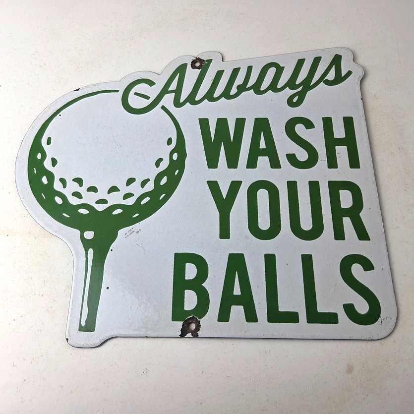 This vintage Golf porcelain sign features the large lettering that says Always Wash your Balls. This sign is perfect for any golf fan or collector of sports memorabilia. This sign has high-quality porcelain on both sides and measures at 12″ by 10.5″ tall.