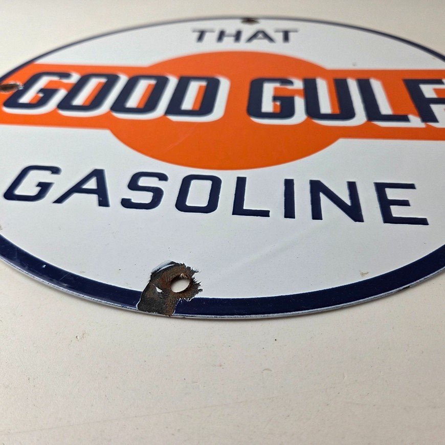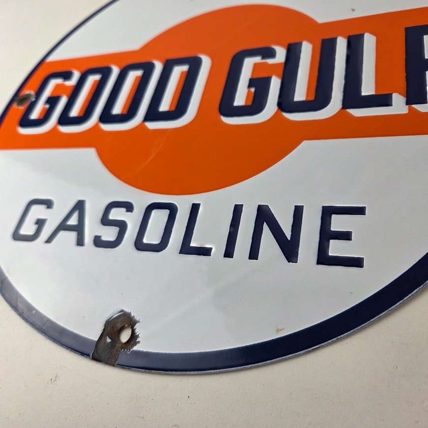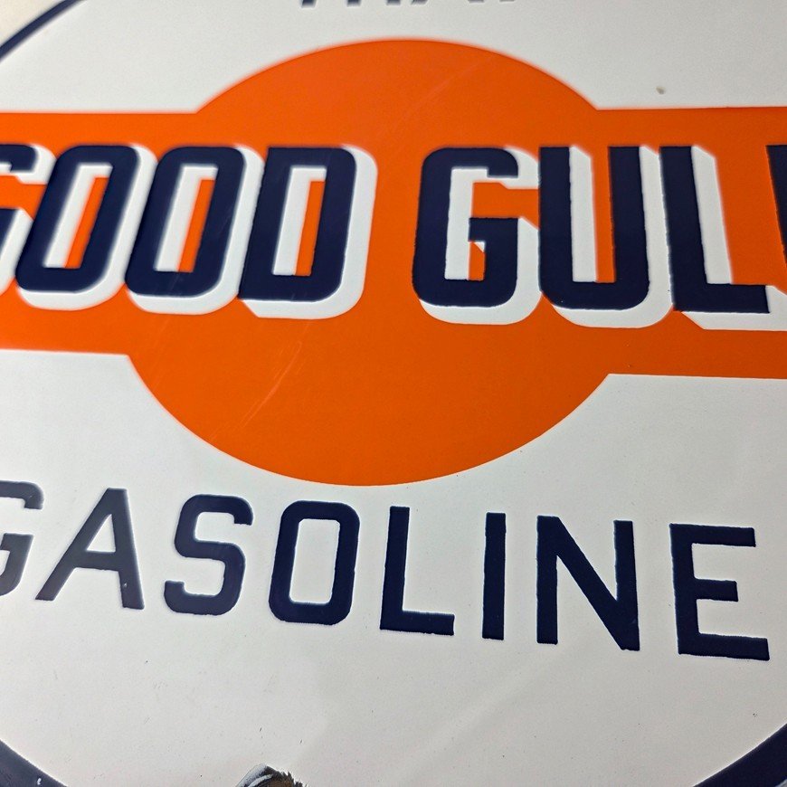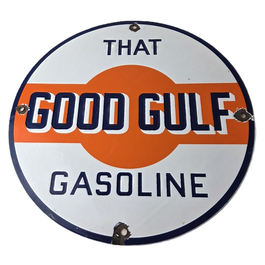 Measuring 11 3/4″, this Gulf Gasoline sign features the iconic orange Good Gulf branding and is perfect for display in a garage, man cave, or garage shop. The sign is made of high-quality porcelain and has been well-preserved over the years. With its vibrant colors and classic design, this Gulf Gasoline sign is sure to be a conversation starter.