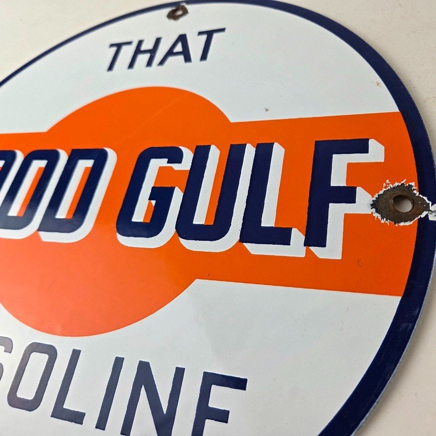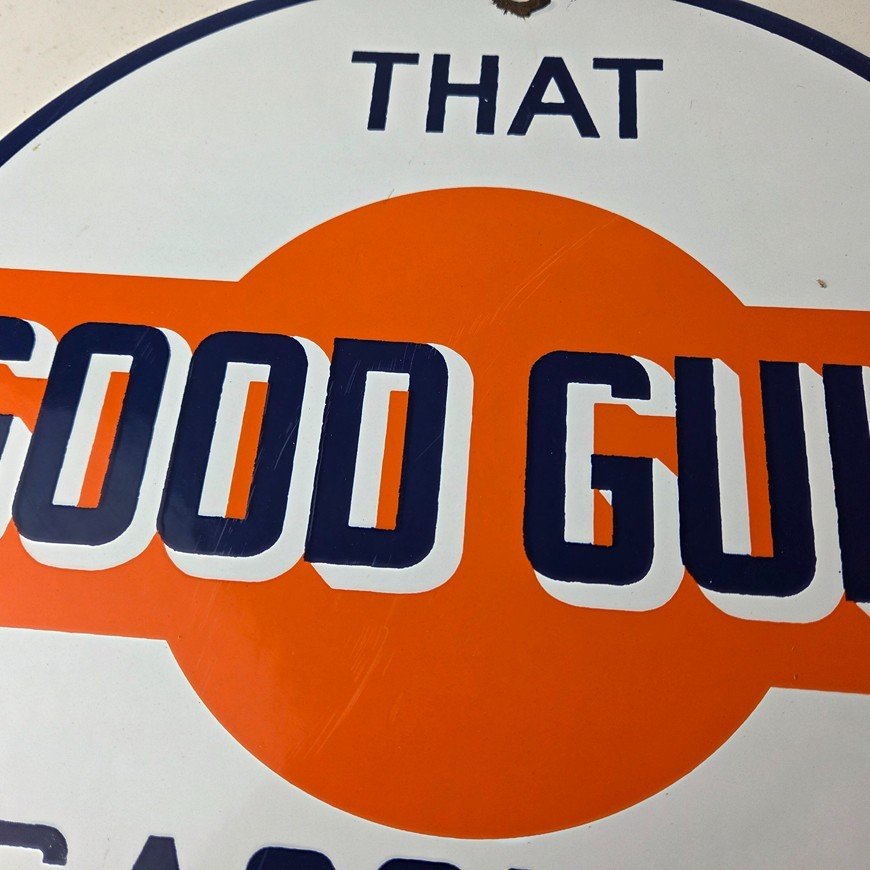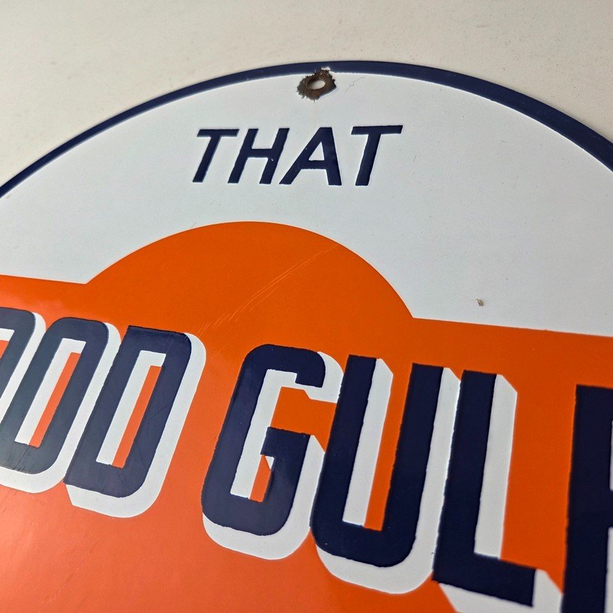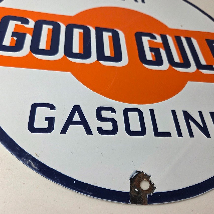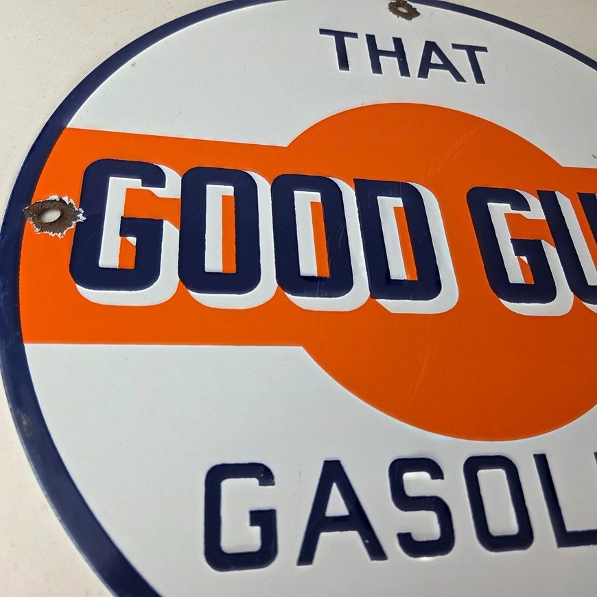 Measuring 11 3/4″, this Gulf Gasoline sign features the iconic orange Good Gulf branding and is perfect for display in a garage, man cave, or garage shop. The sign is made of high-quality porcelain and has been well-preserved over the years. With its vibrant colors and classic design, this Gulf Gasoline sign is sure to be a conversation starter.