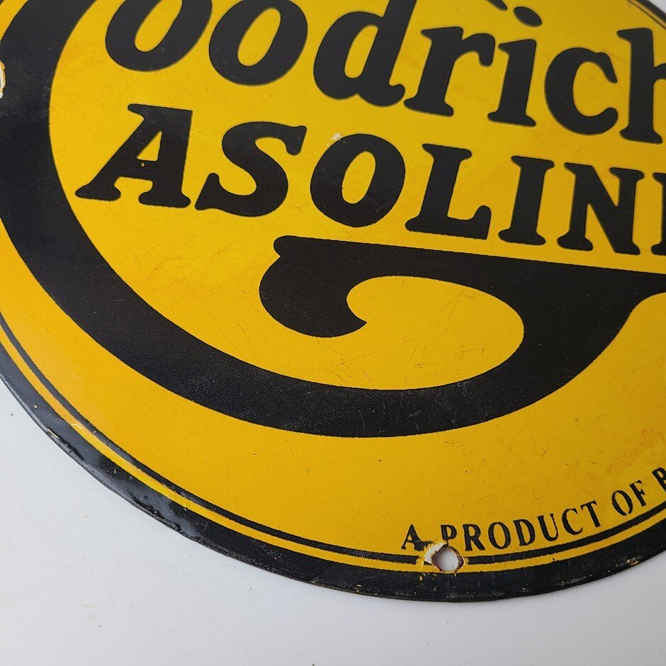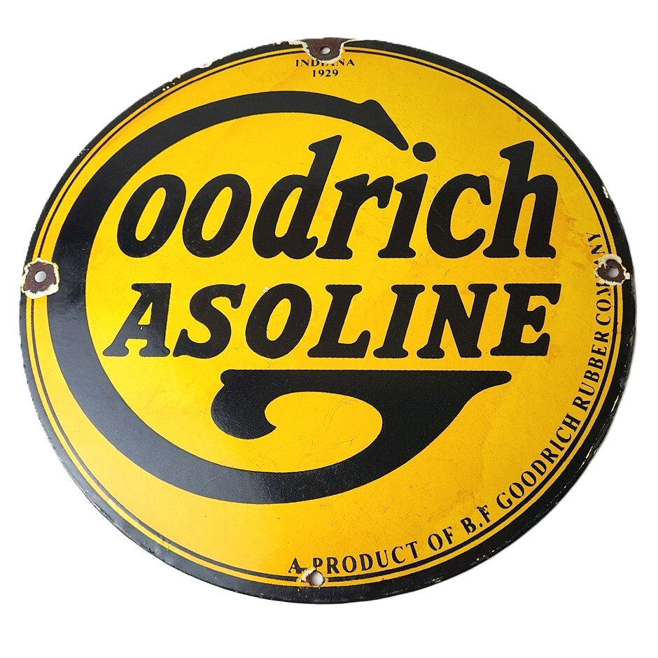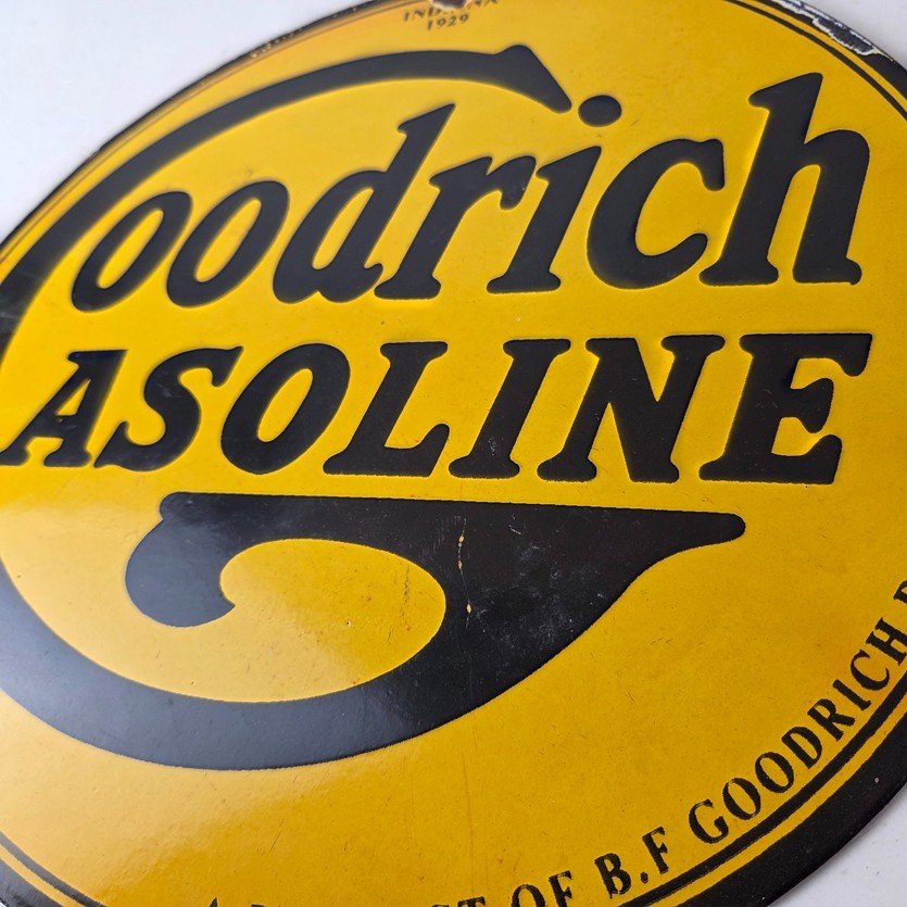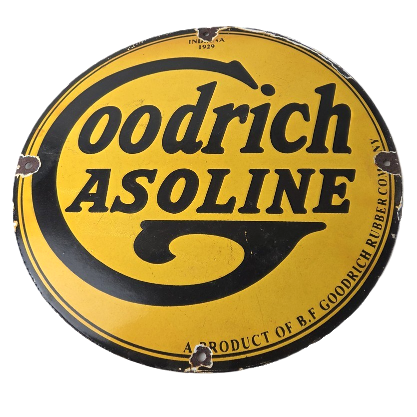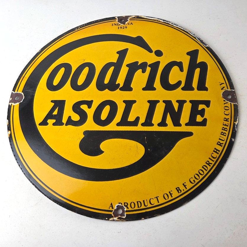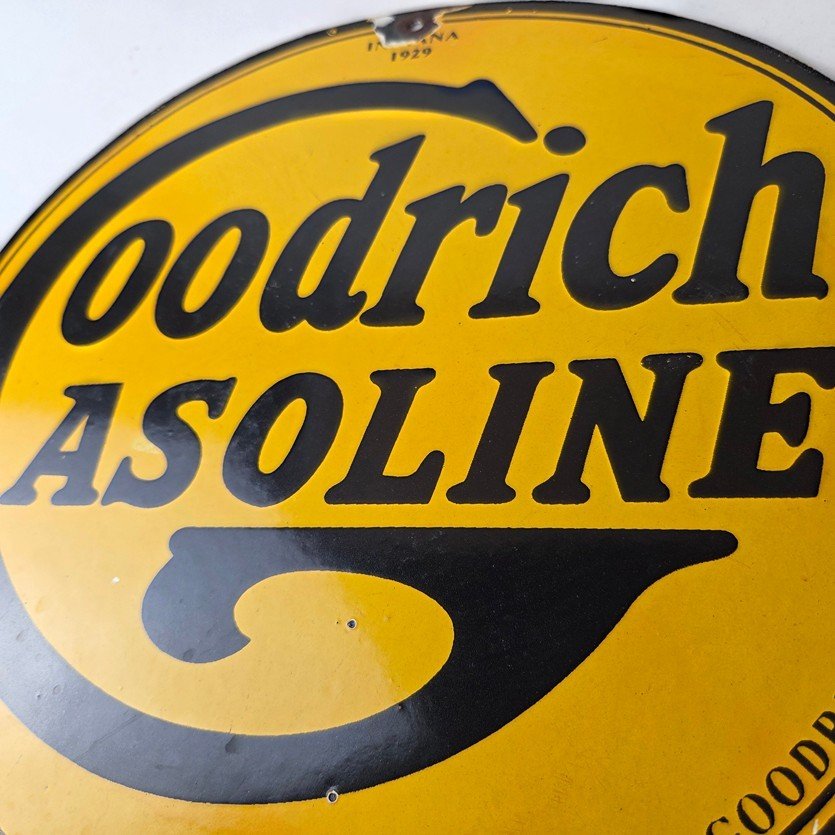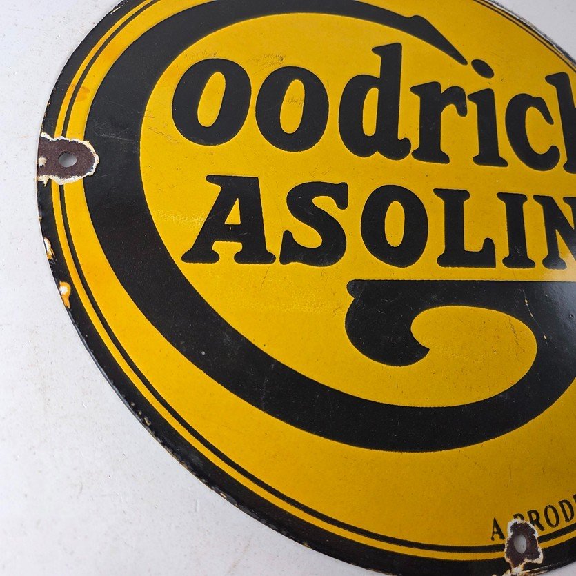 Vintage porcelain sign featuring Goodrich Gasoline.