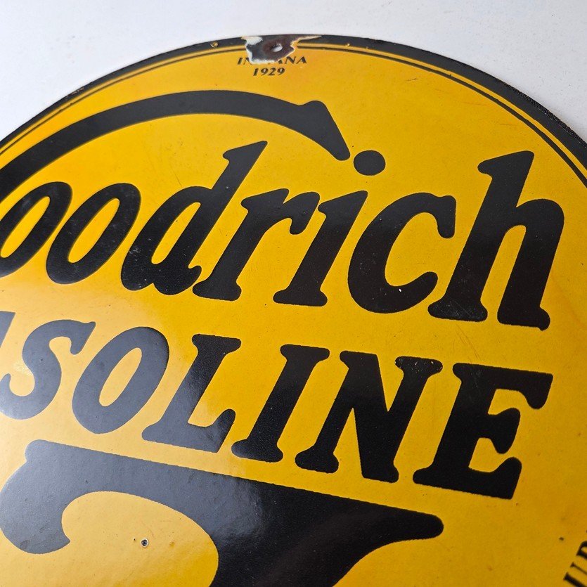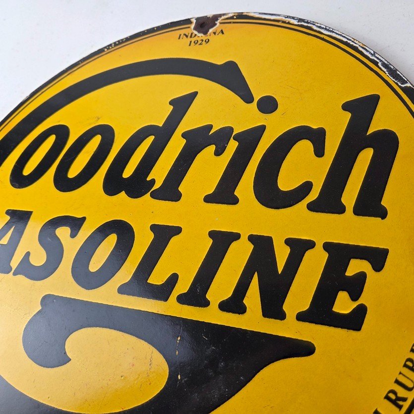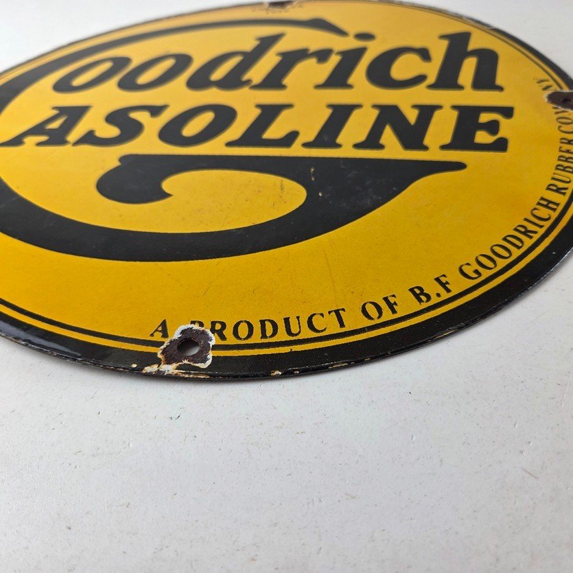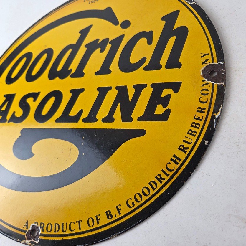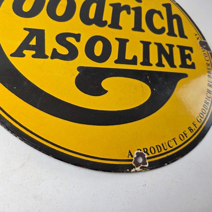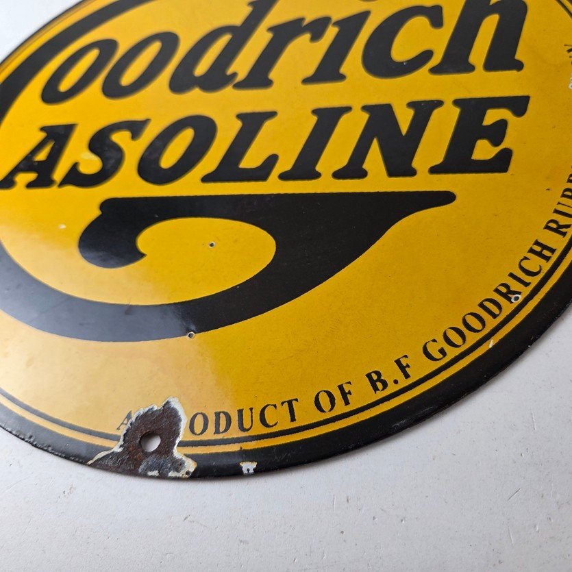 Vintage porcelain sign featuring Goodrich Gasoline.