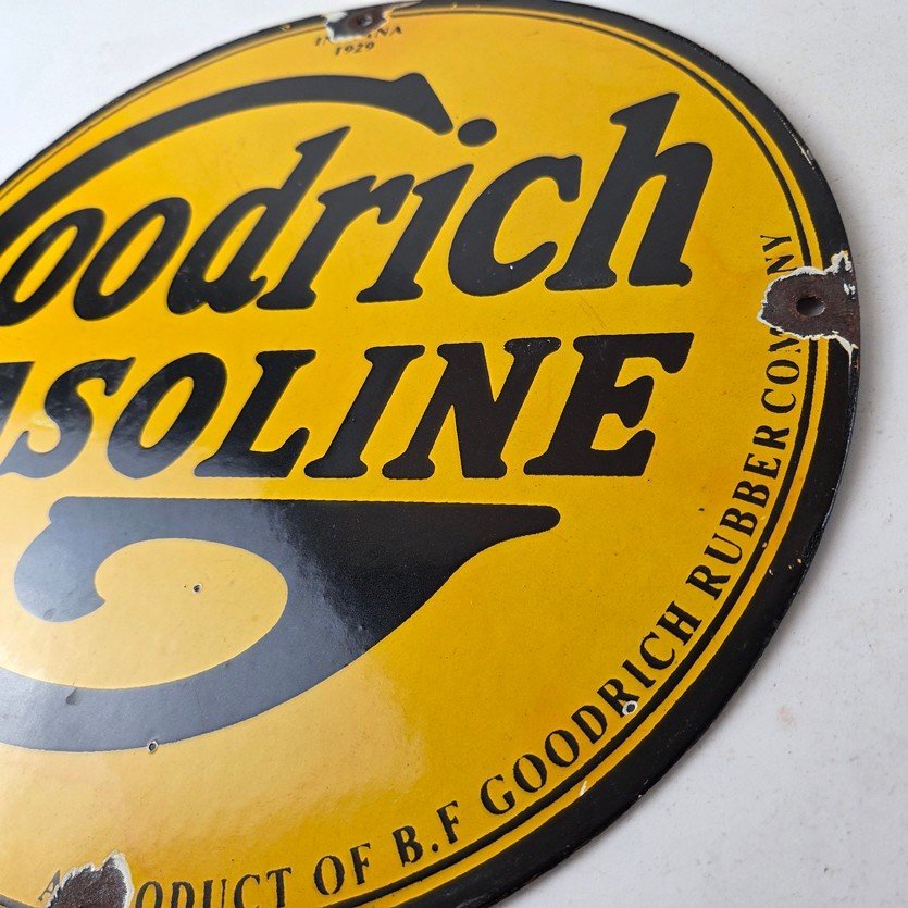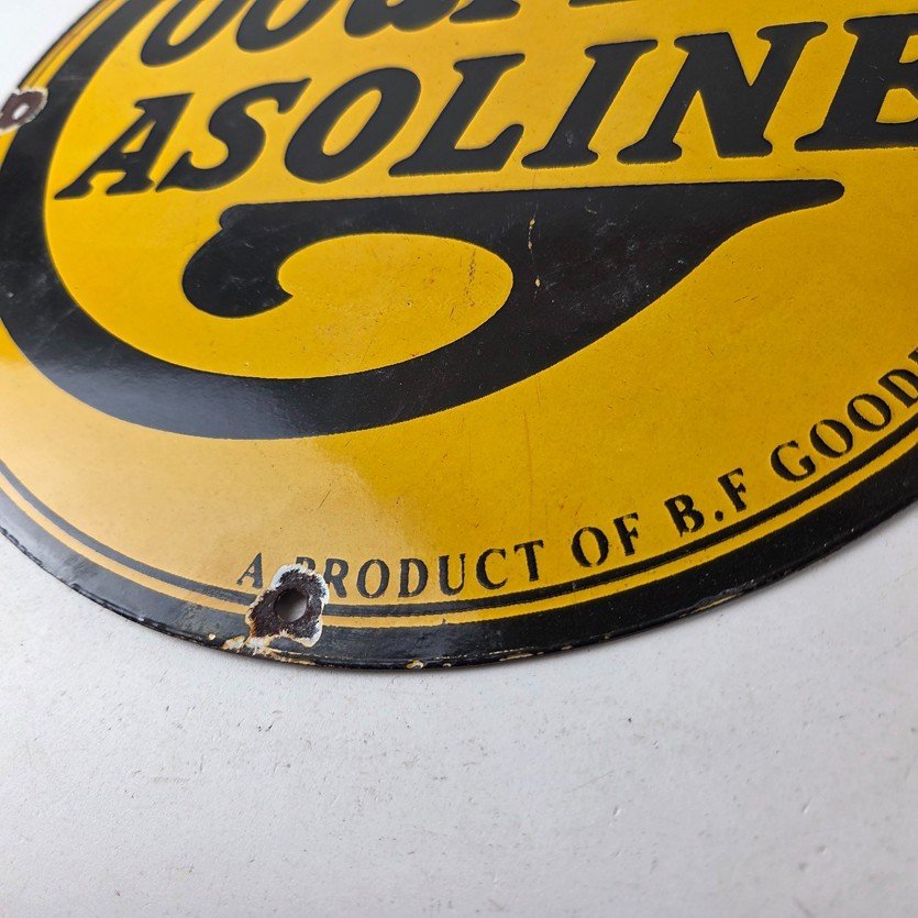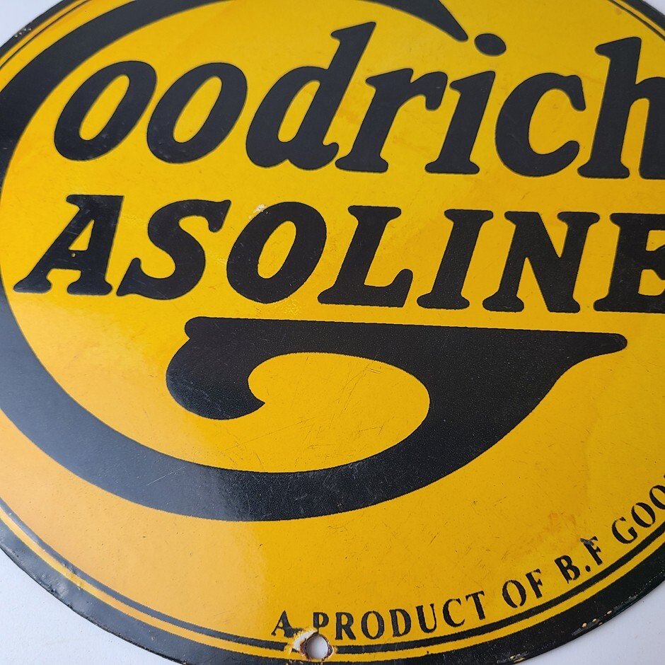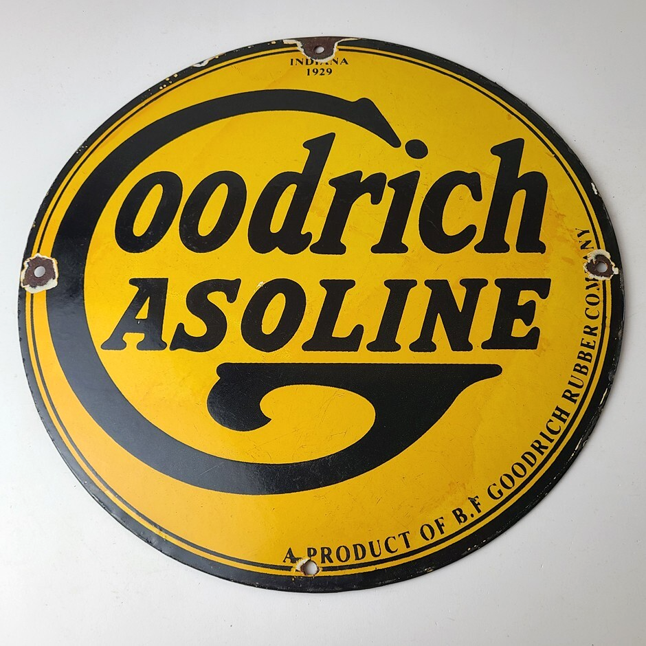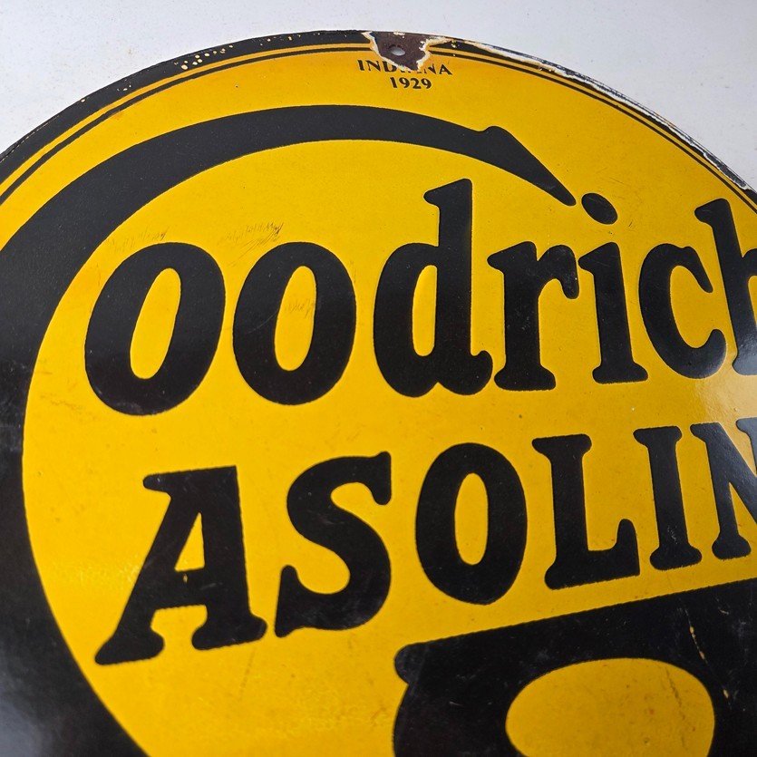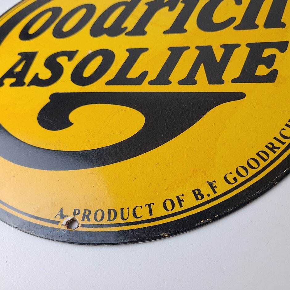 Vintage porcelain sign featuring Goodrich Gasoline.