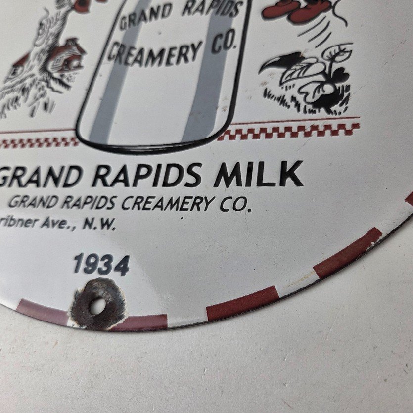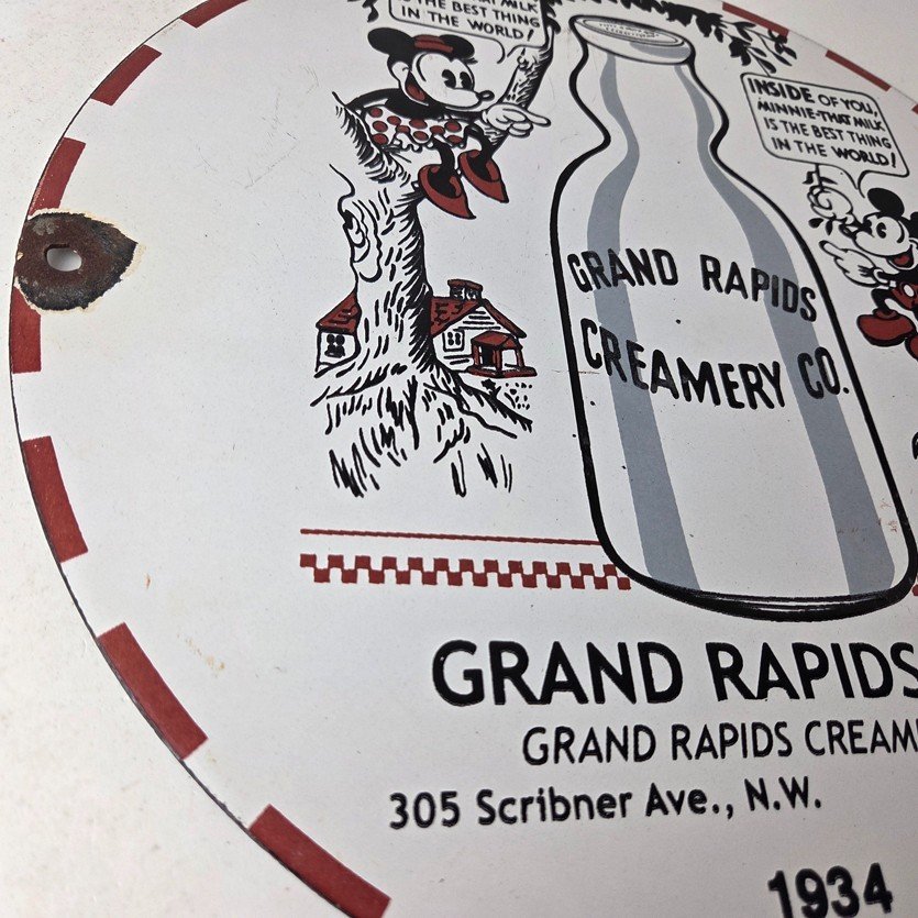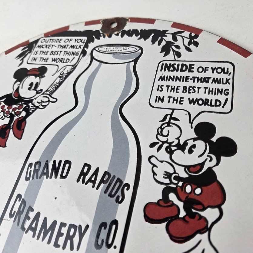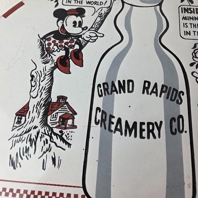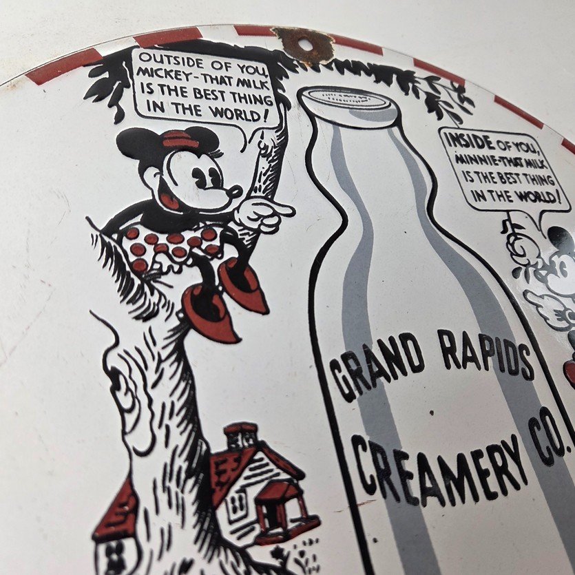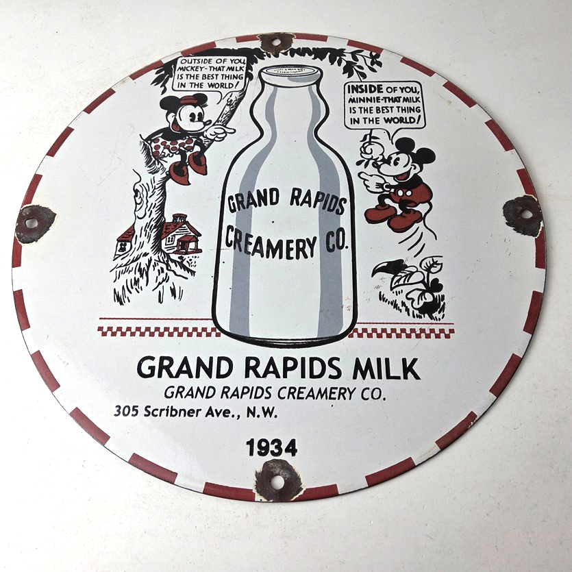 This vintage Grand Rapids Creamery porcelain sign features the iconic glass milk bottle in the center and the Walt Disney characters, Minnie Mouse & Mickey Mouse. It is made of porcelain and measures 12″ across.