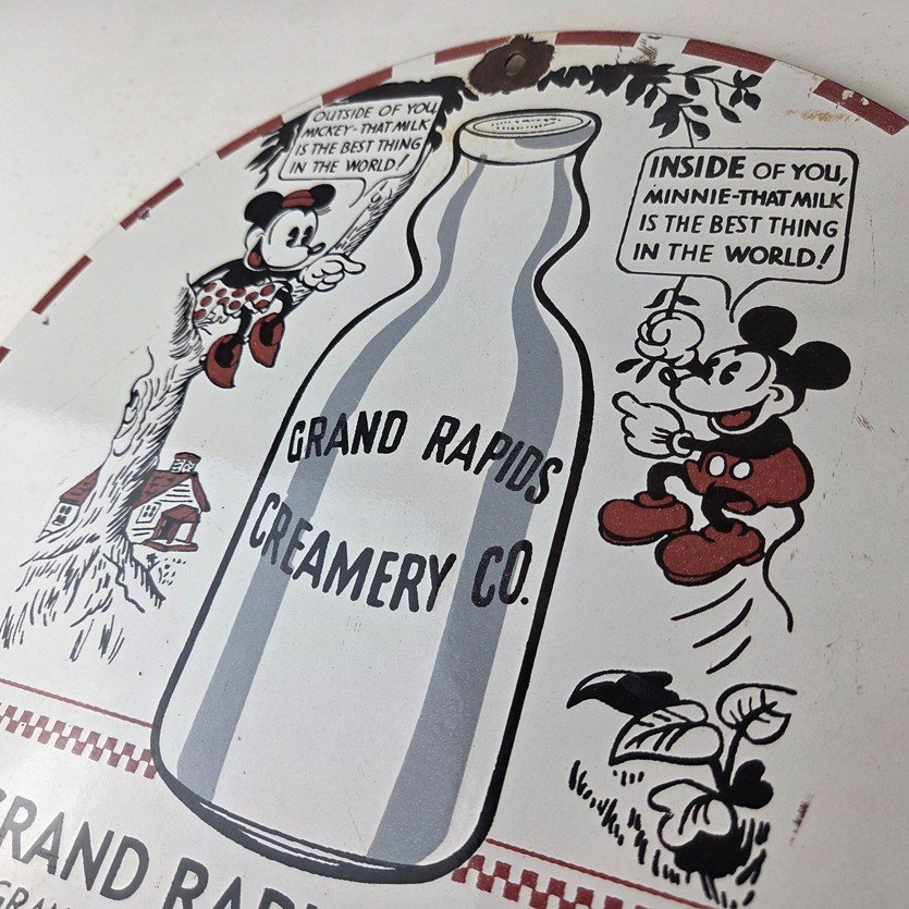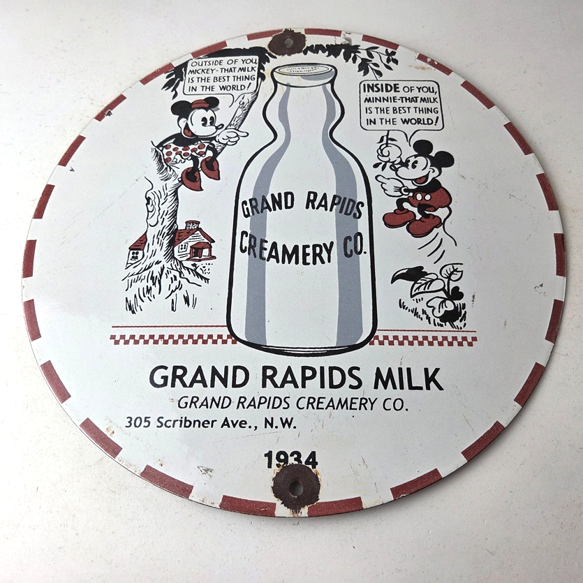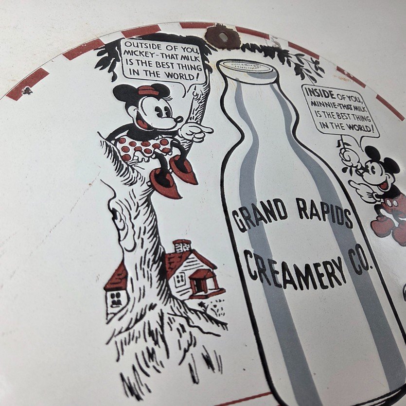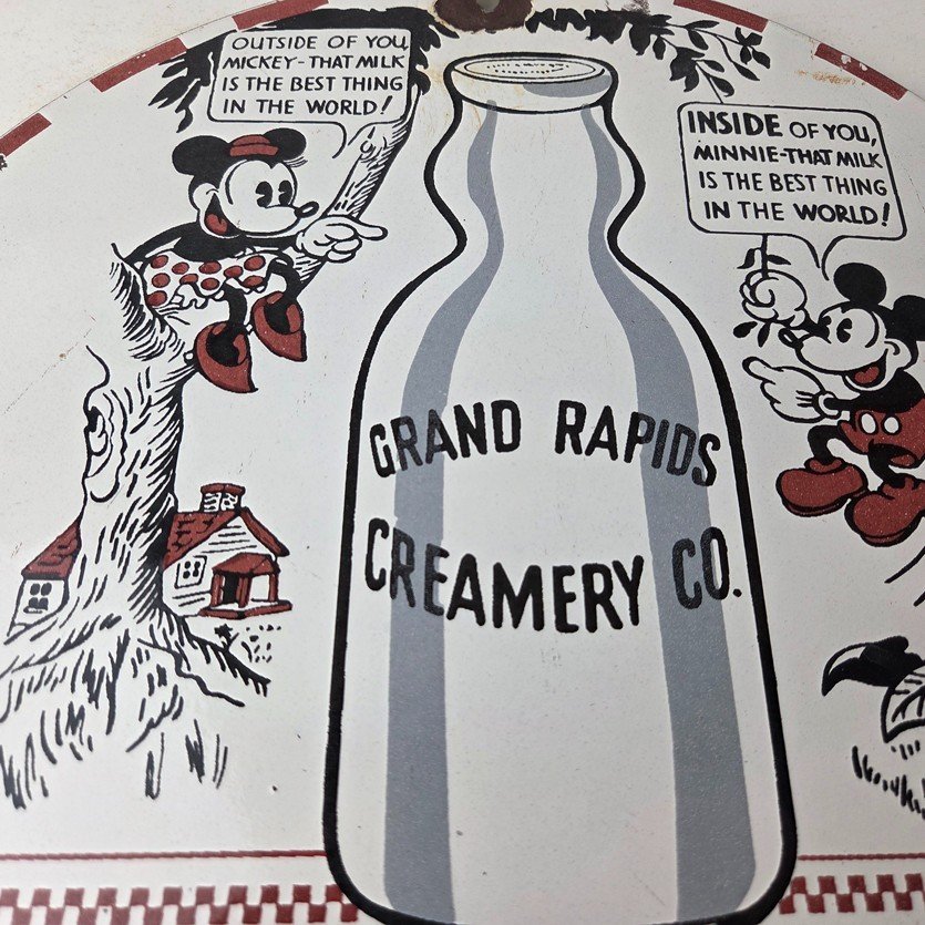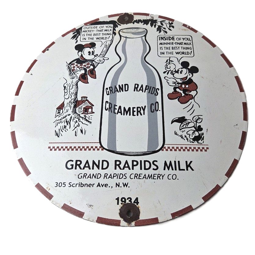 This vintage Grand Rapids Creamery porcelain sign features the iconic glass milk bottle in the center and the Walt Disney characters, Minnie Mouse & Mickey Mouse. It is made of porcelain and measures 12″ across.