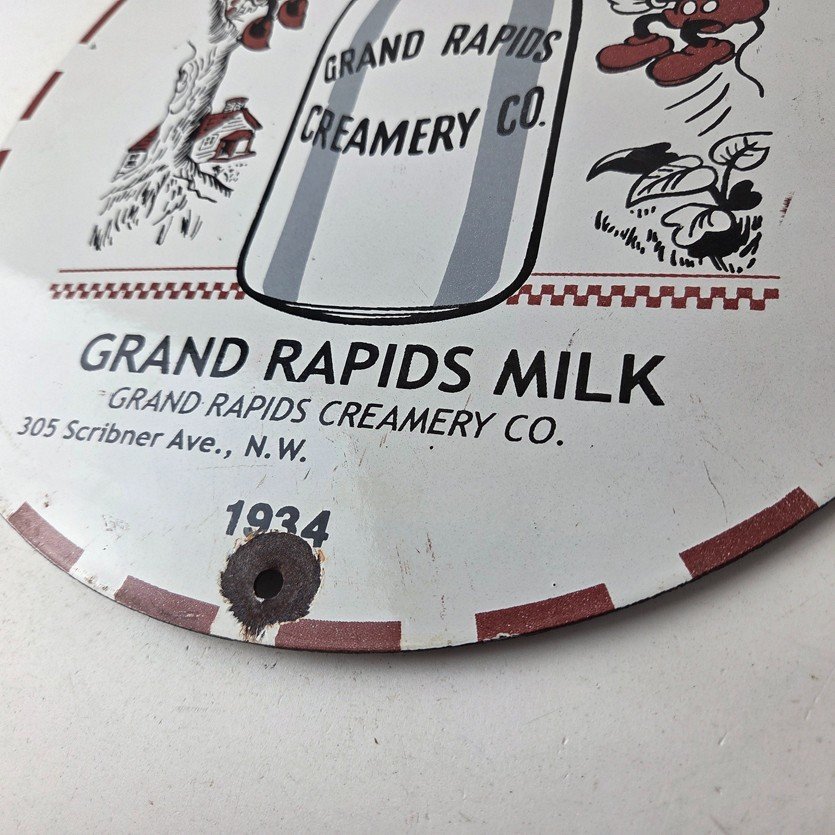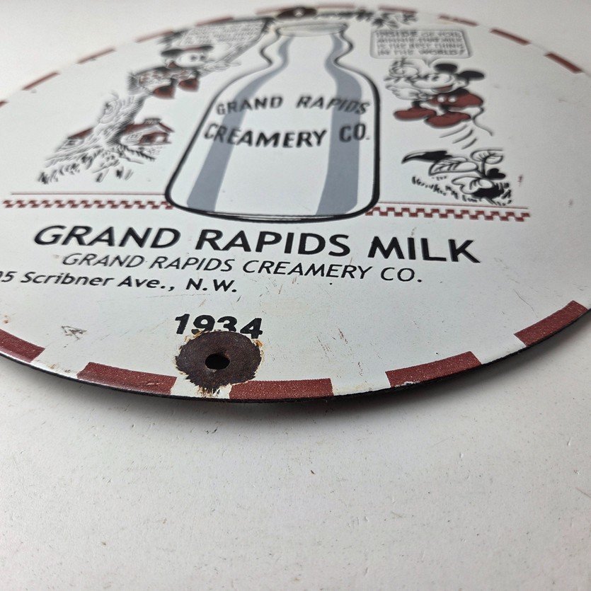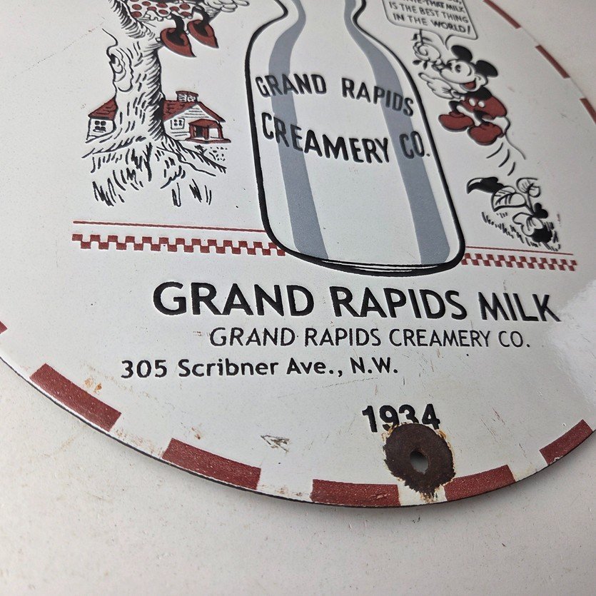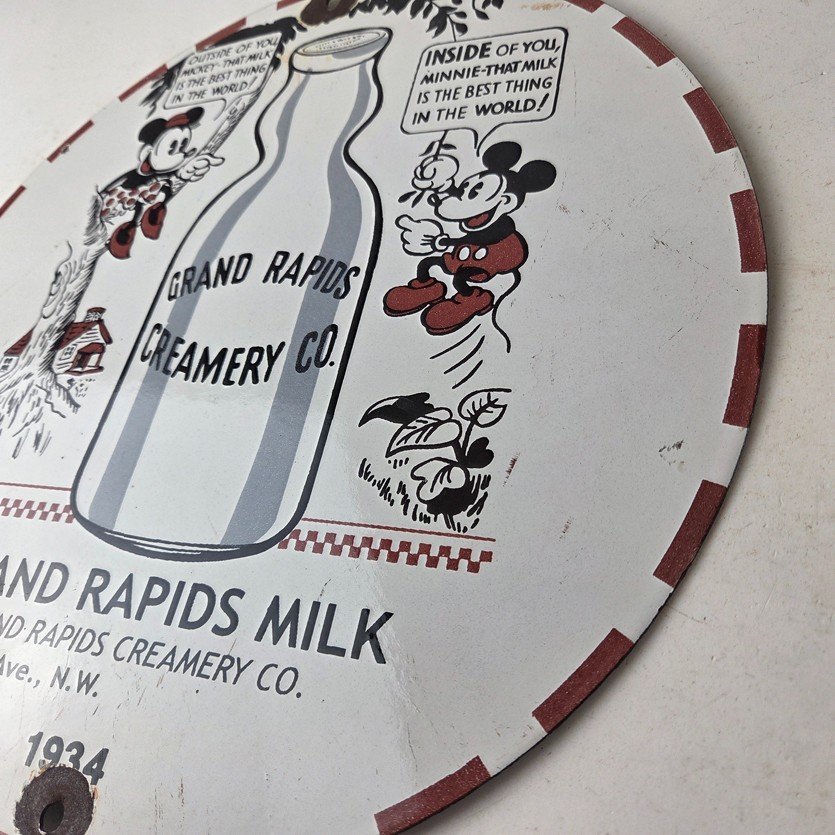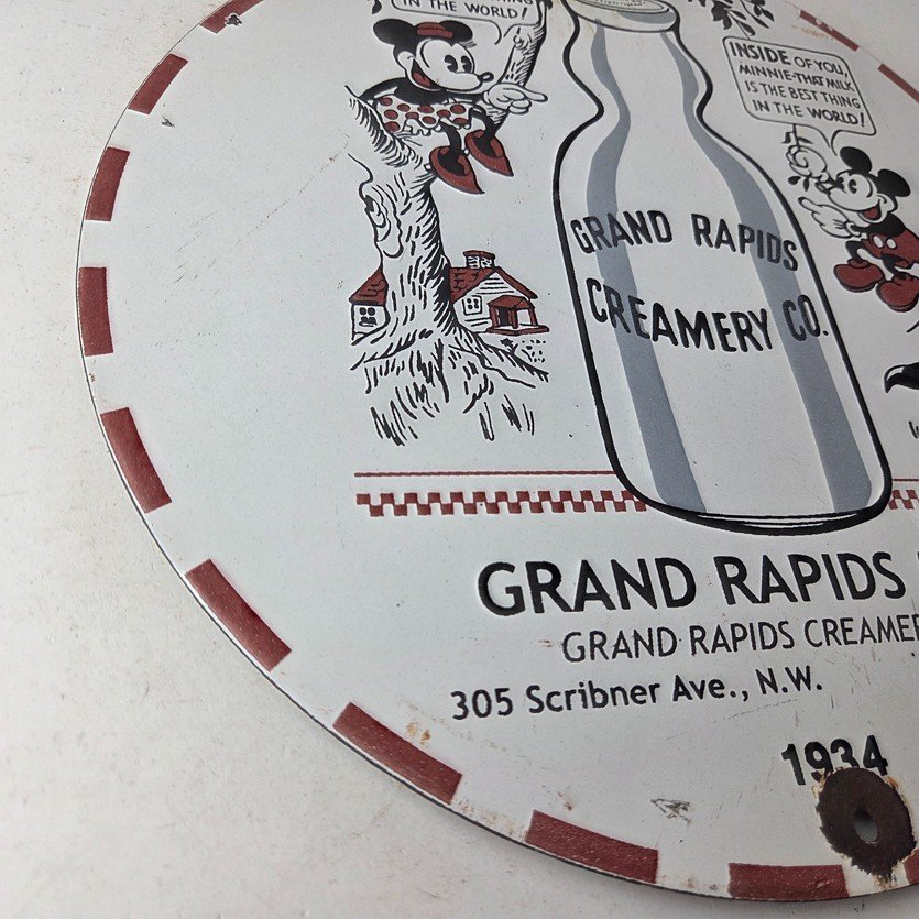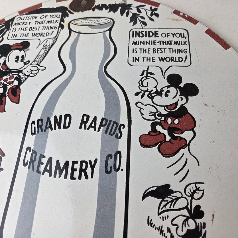 This vintage Grand Rapids Creamery porcelain sign features the iconic glass milk bottle in the center and the Walt Disney characters, Minnie Mouse & Mickey Mouse. It is made of porcelain and measures 12″ across.
