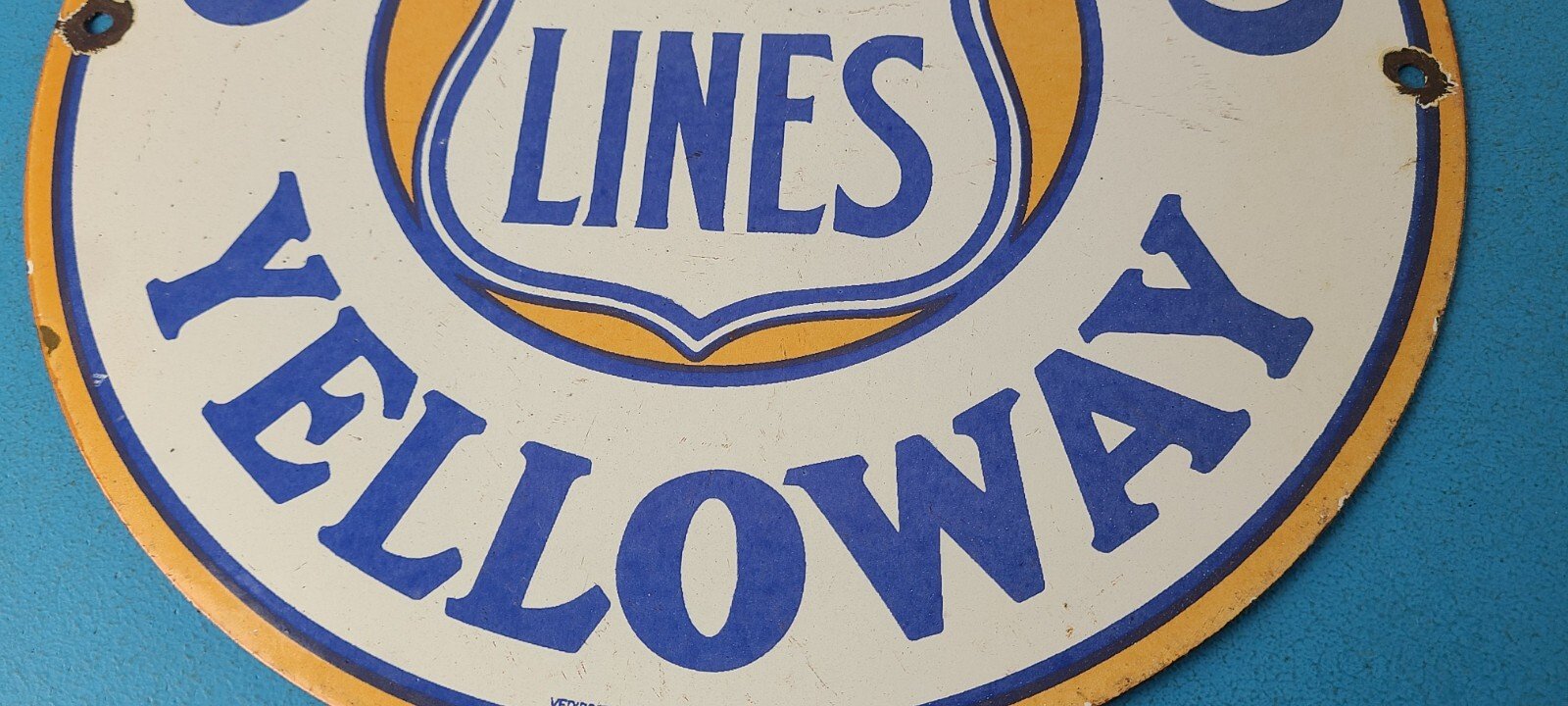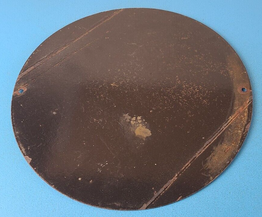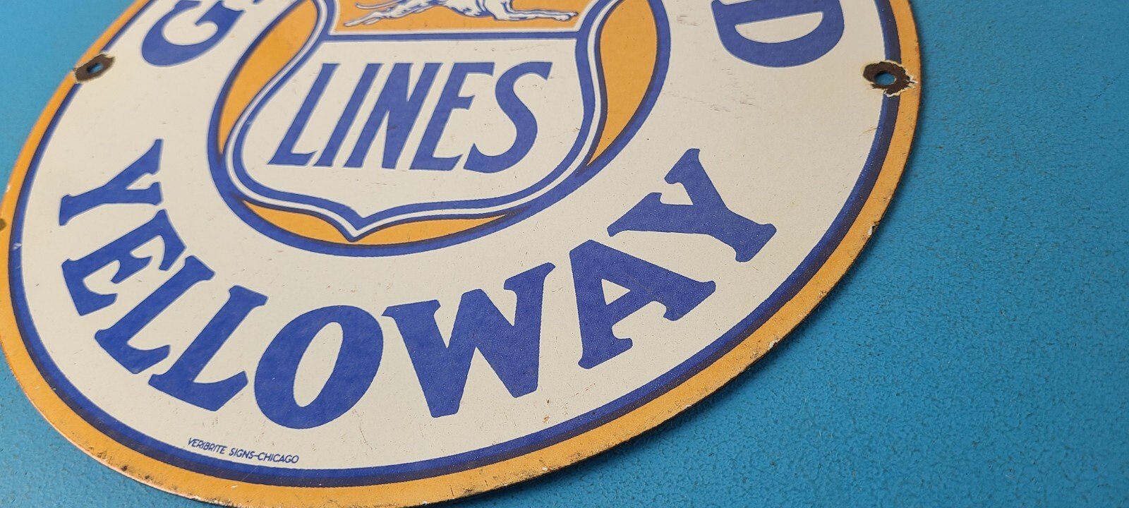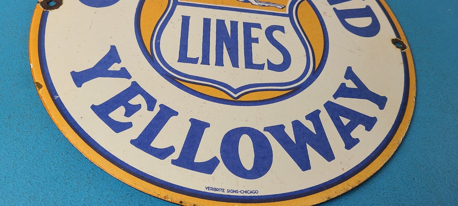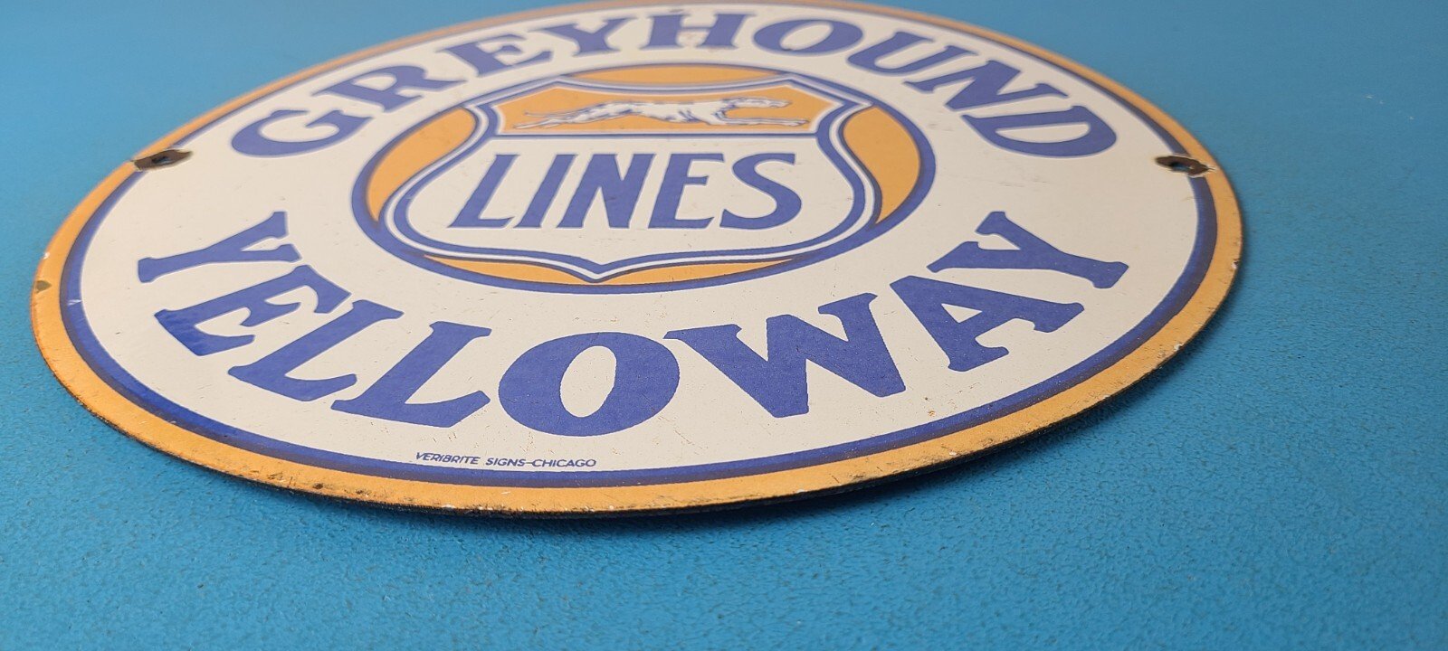 This vintage porcelain sign features the iconic Greyhound Bus Lines Yelloway graphic. Measuring 12 inches, this round sign is perfect for collectors of gas and oil memorabilia. The sign comes in black and blue colors, making it a great addition to any themed collection. The sign is made of high-quality materials and is in great condition, with no noticeable wear or tear. This sign is sure to make a statement in any collection or as a unique piece of decor. Add this piece to your collection today!