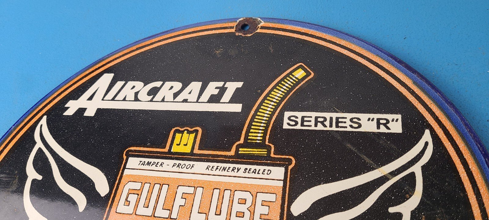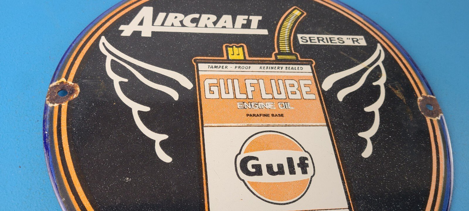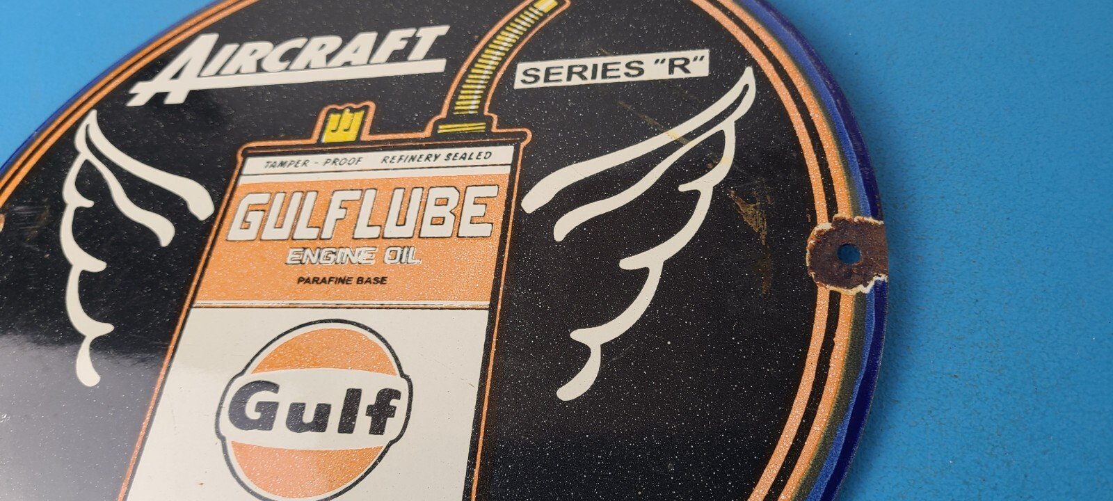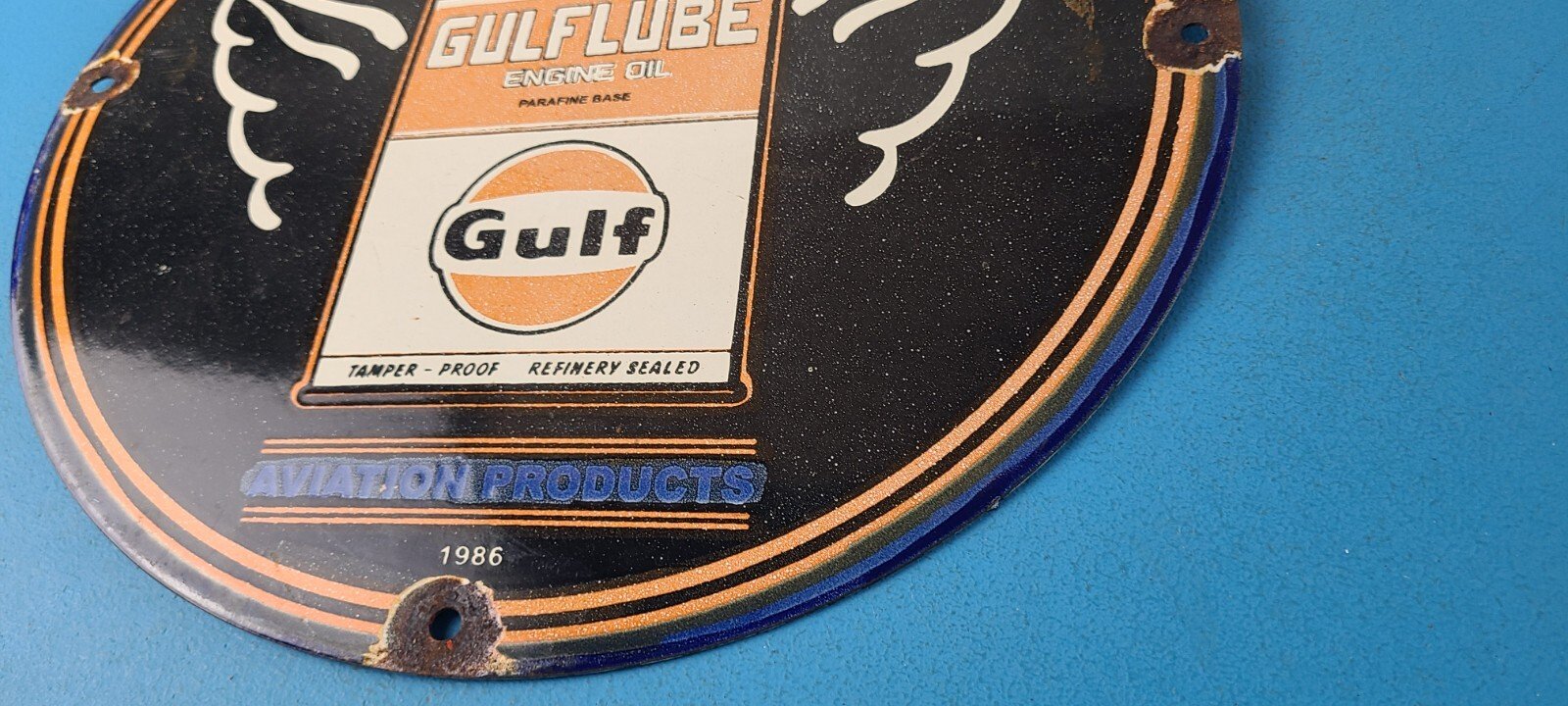 This vintage Gulf Gasoline porcelain sign features the iconic Gulf Gasoline with a can of Gulf Lube in the center on a porcelain enamel advertisement and measures 12″ across. This sign is in excellent condition and has vibrant colors.