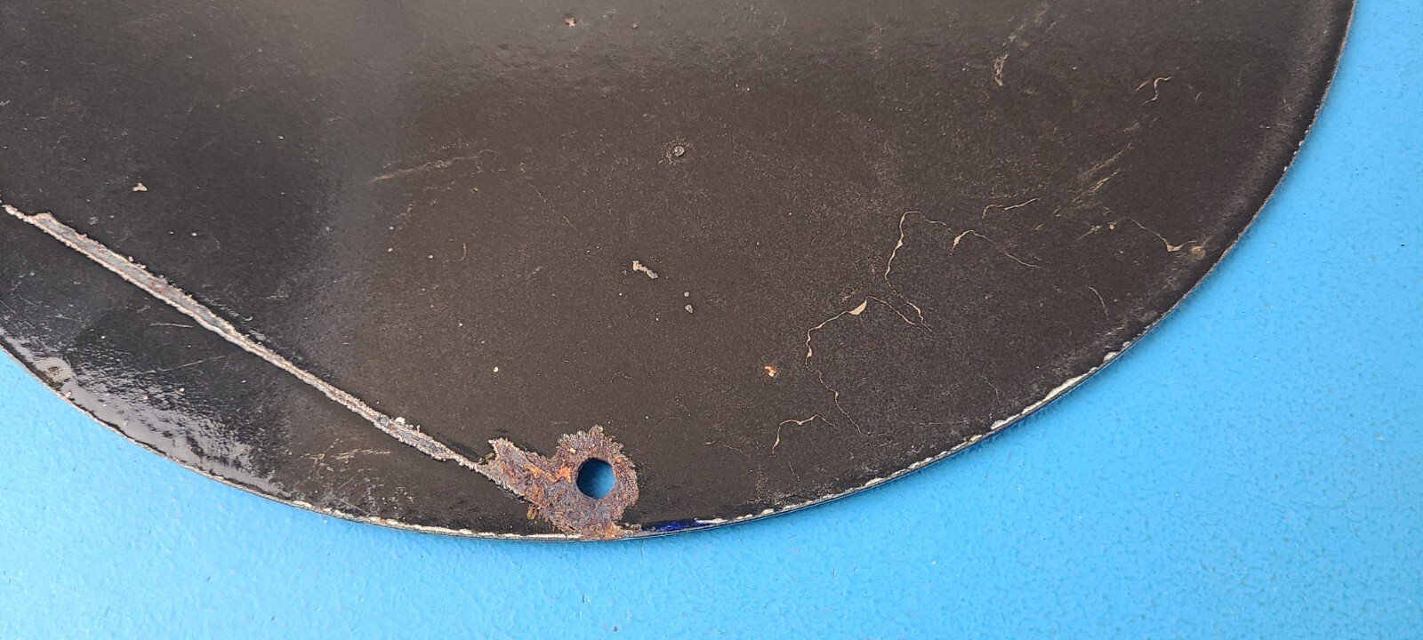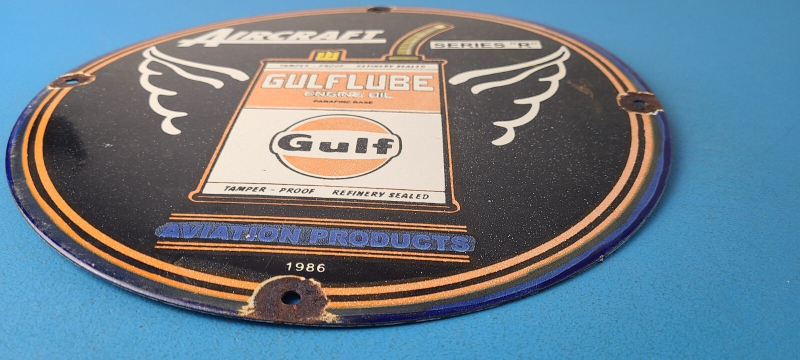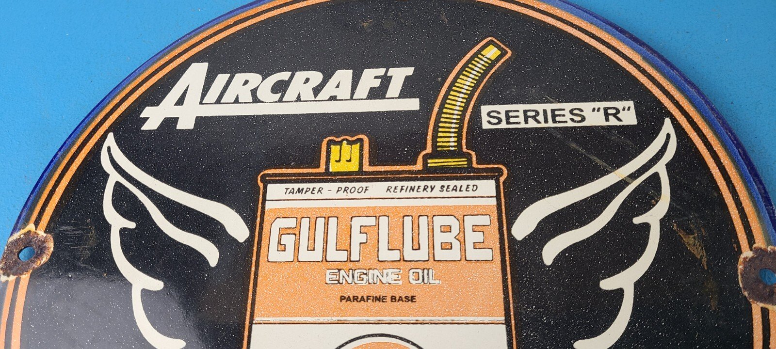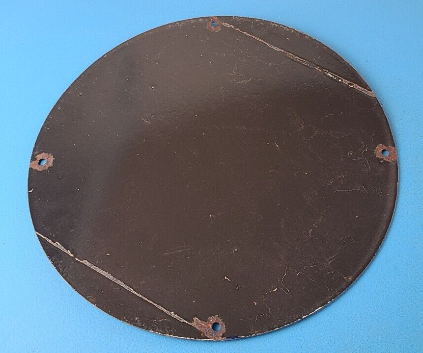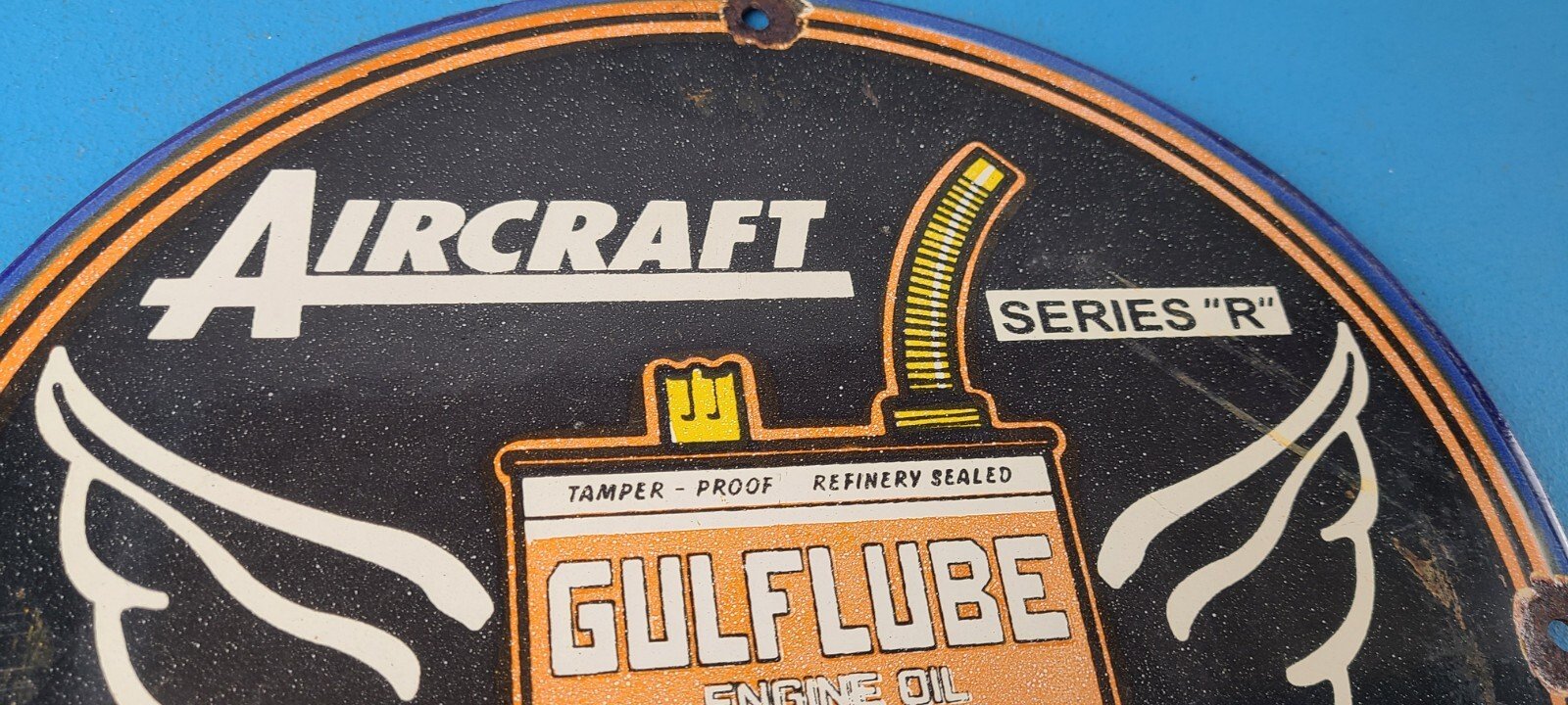 This vintage Gulf Gasoline porcelain sign features the iconic Gulf Gasoline with a can of Gulf Lube in the center on a porcelain enamel advertisement and measures 12″ across. This sign is in excellent condition and has vibrant colors.