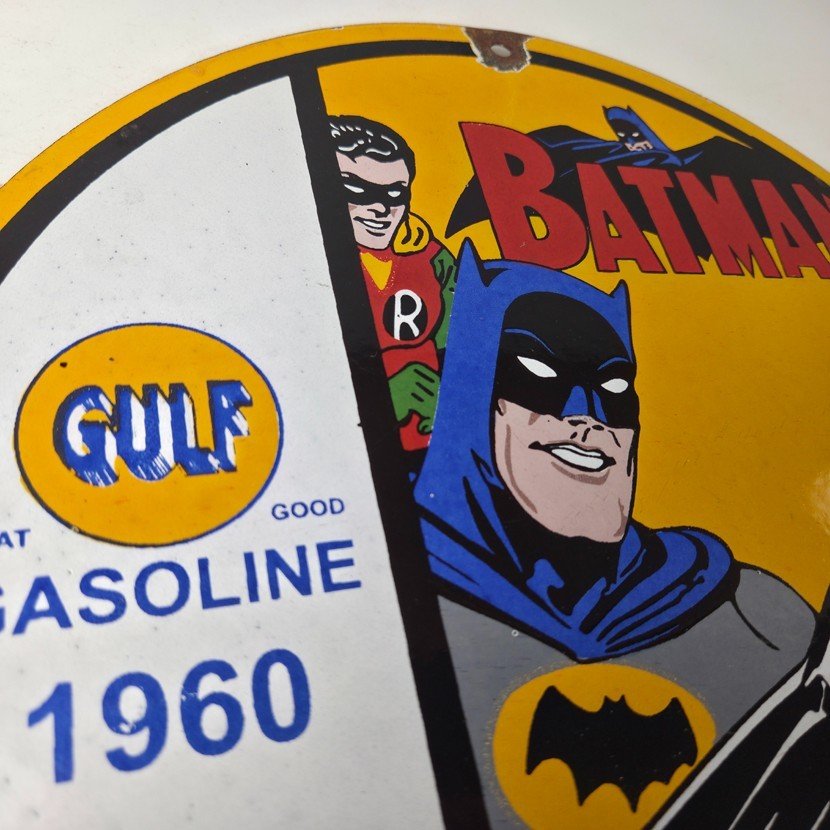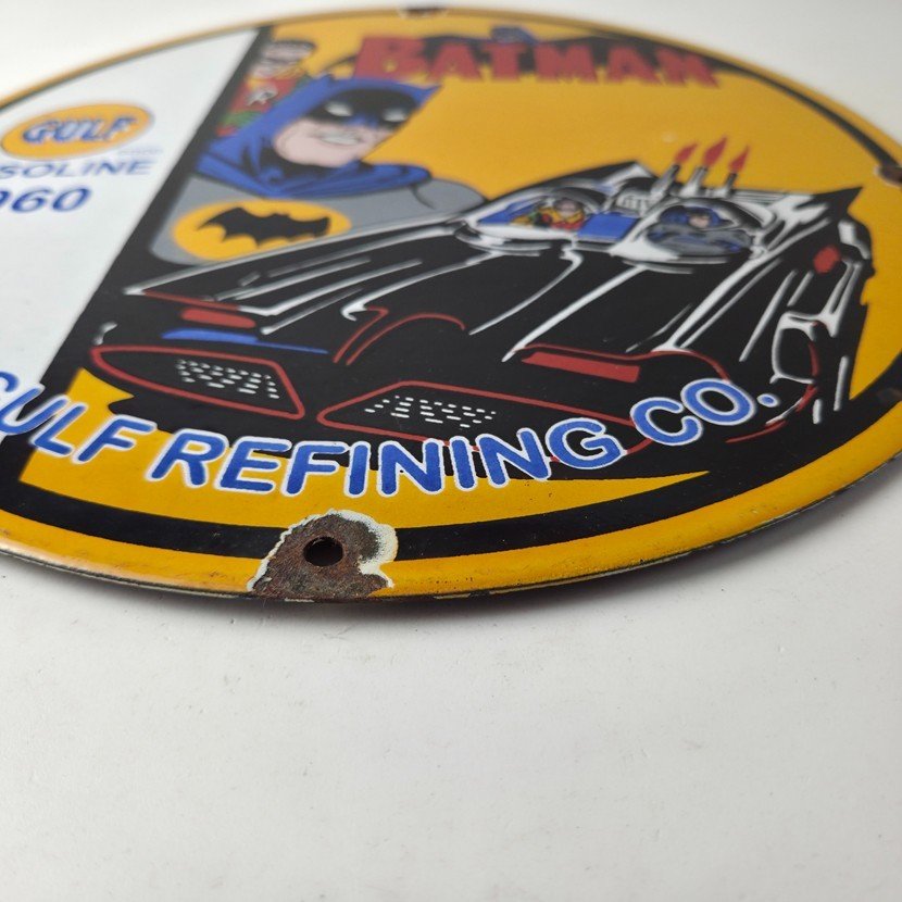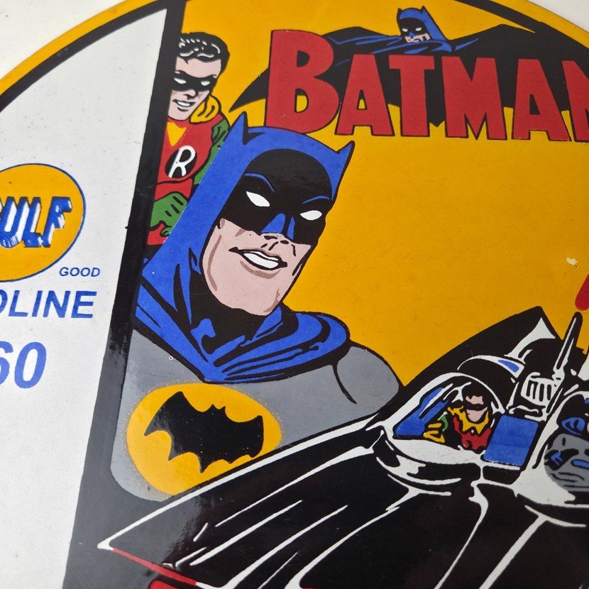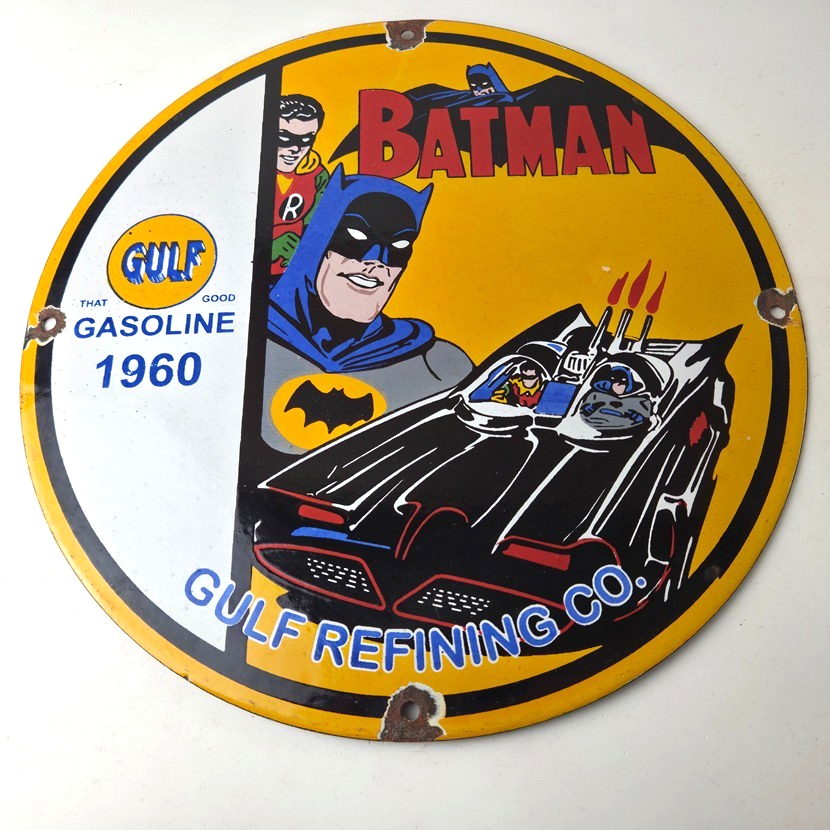This vintage Gulf Gasoline porcelain sign features the iconic Gulf Gasoline with Batman and Robin in the Bat Mobile and measures 12″ across. This sign is in excellent condition and has vibrant colors.