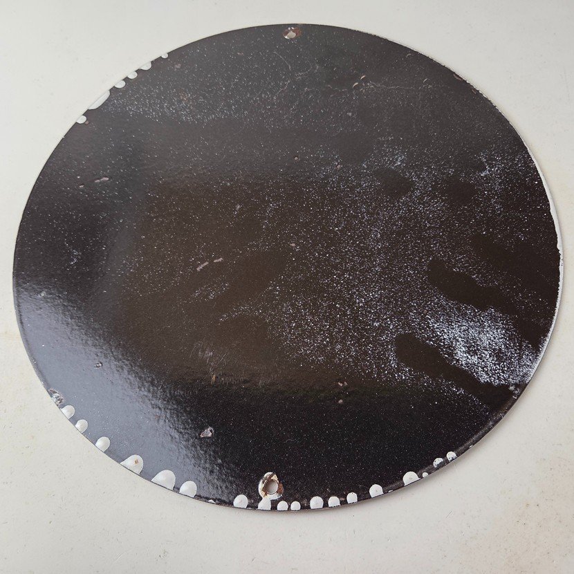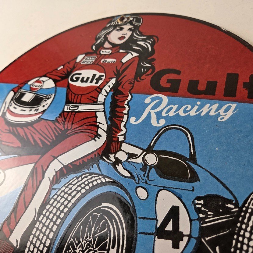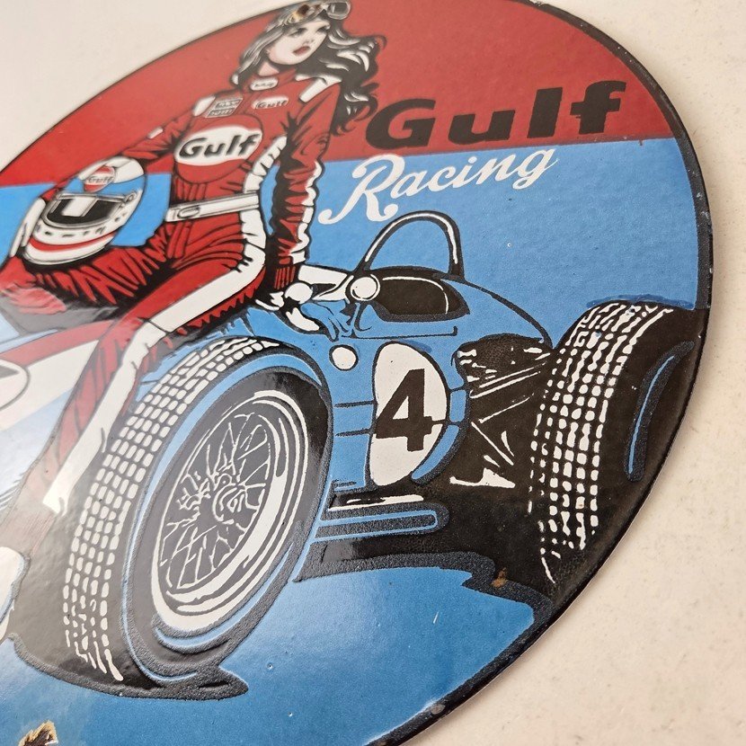 This vintage Gulf Gasoline porcelain sign features the iconic Gulf Gasoline with the pinup girl race car driver and measures 12″ across. This sign is in excellent condition and has vibrant colors.