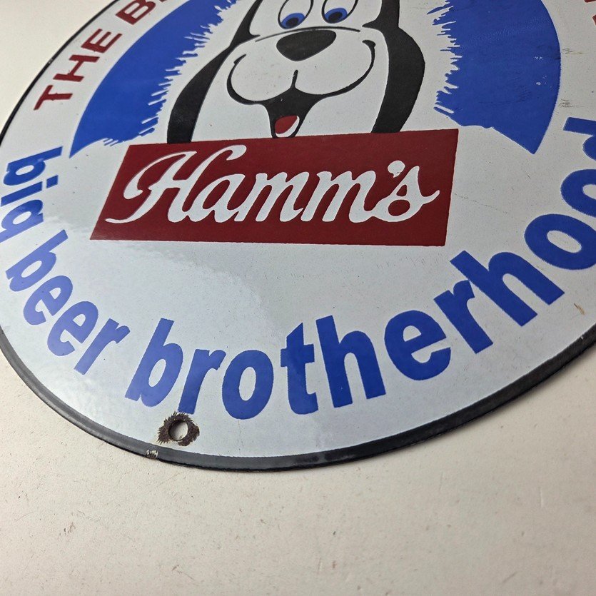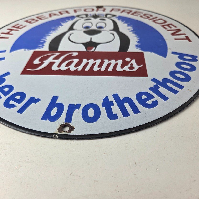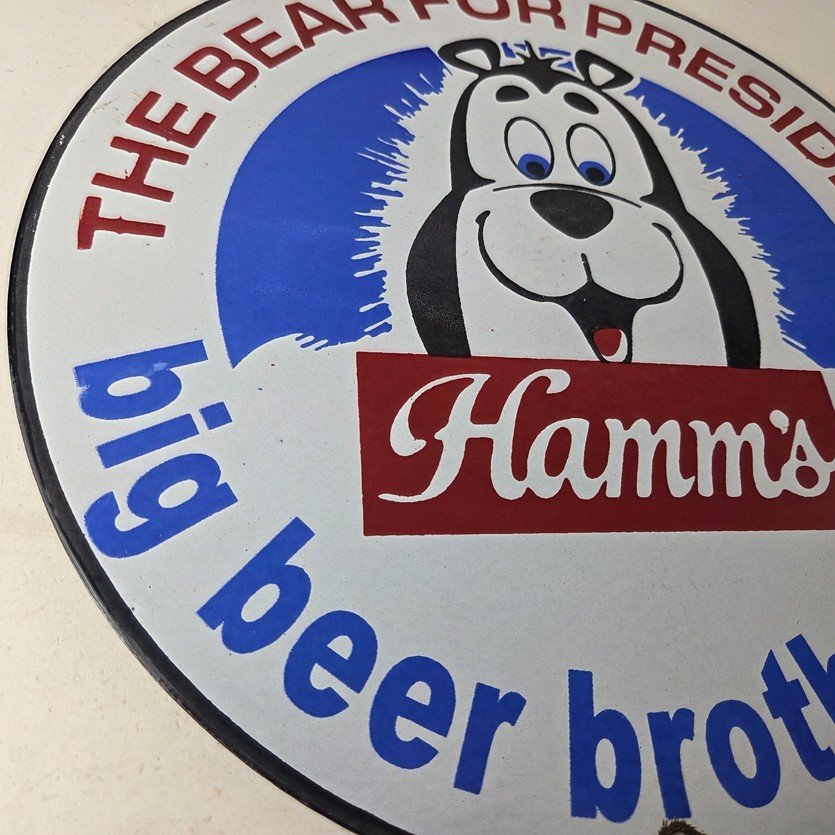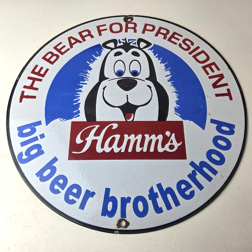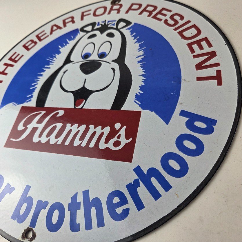 This vintage Hamm’s Beer porcelain sign features the iconic bear and says Big Beer Brotherhood around the bottom. Add a vintage touch to your gas station or soda beverage collection with this alcohol beer sign. Measuring 12 inches, this sign has excellent colors and porcelain.