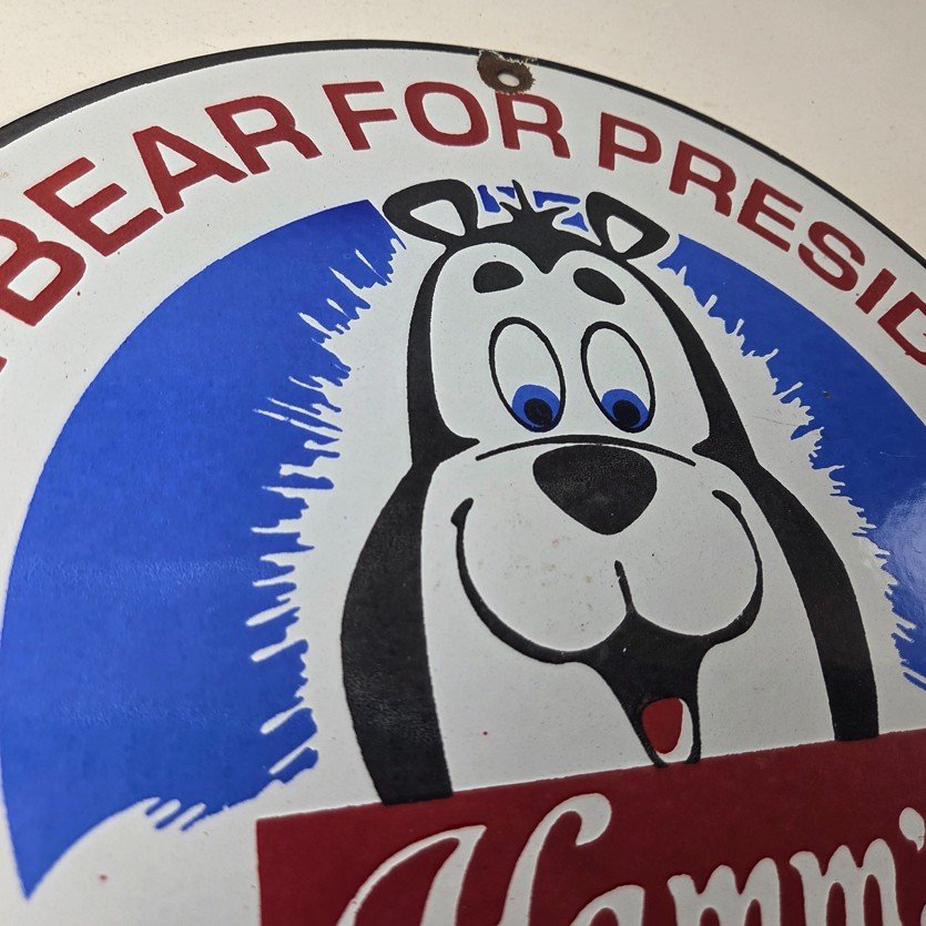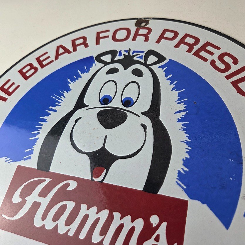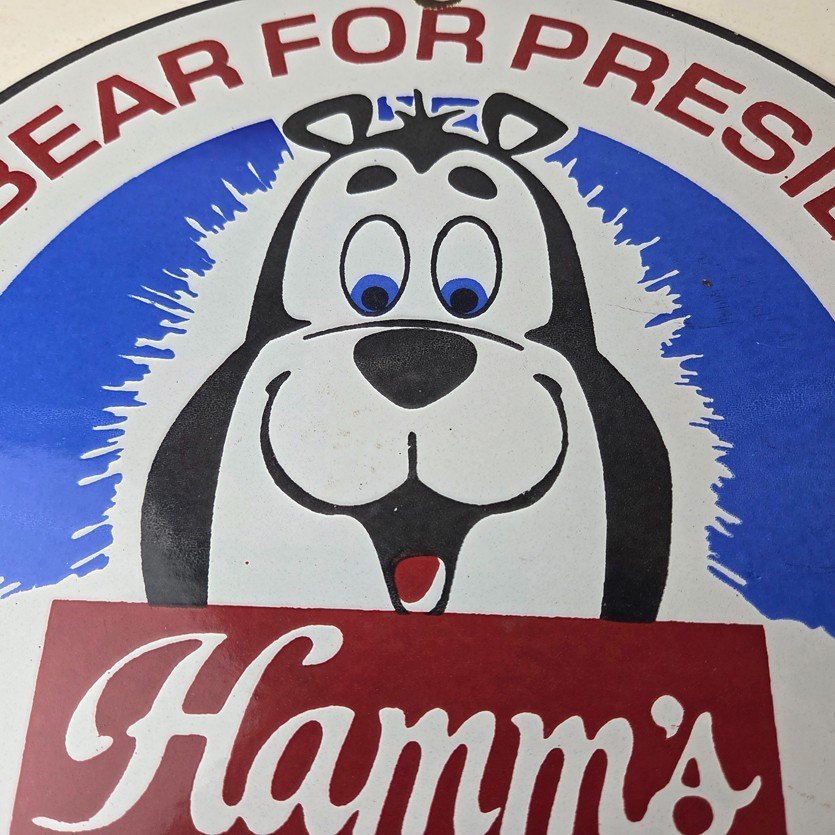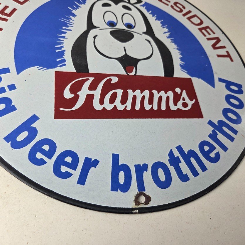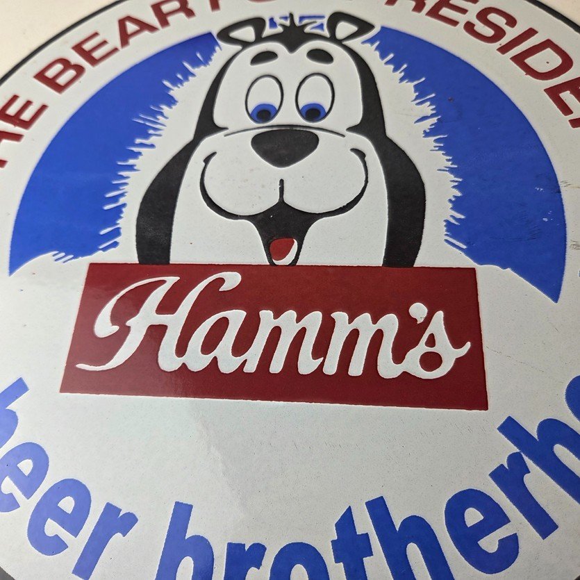 This vintage Hamm’s Beer porcelain sign features the iconic bear and says Big Beer Brotherhood around the bottom. Add a vintage touch to your gas station or soda beverage collection with this alcohol beer sign. Measuring 12 inches, this sign has excellent colors and porcelain.