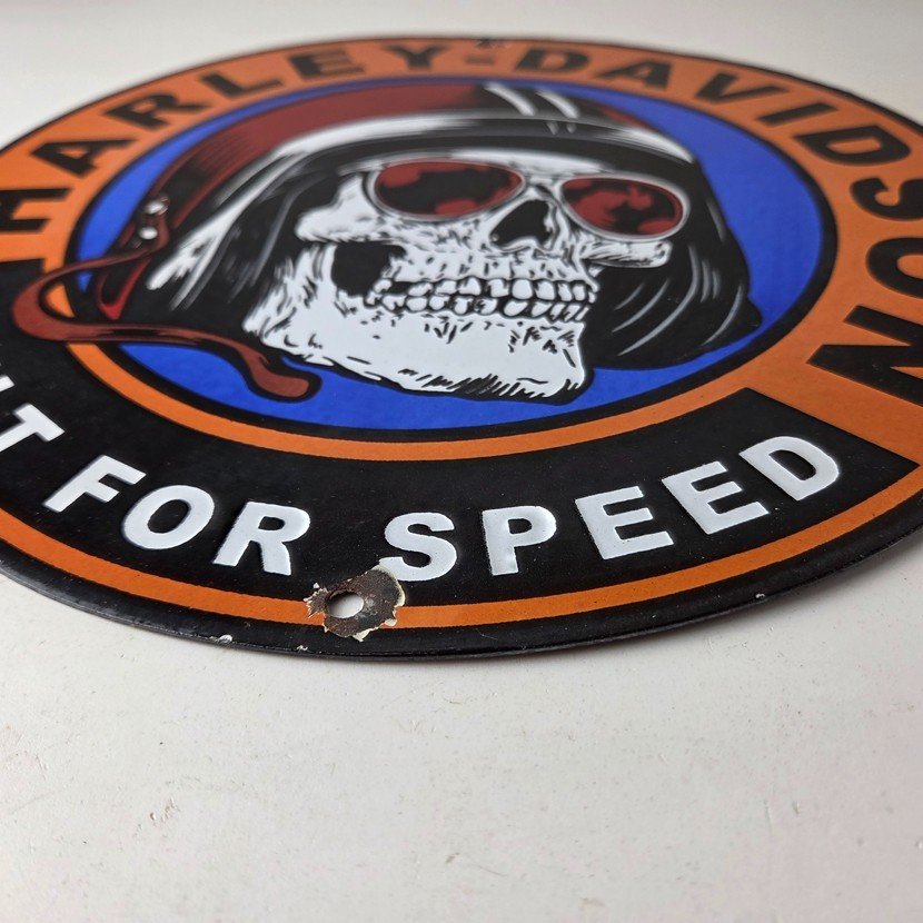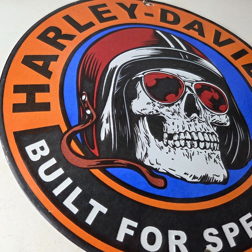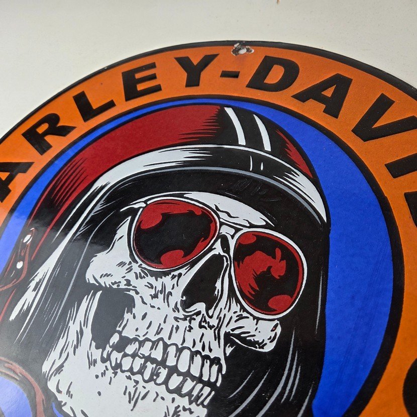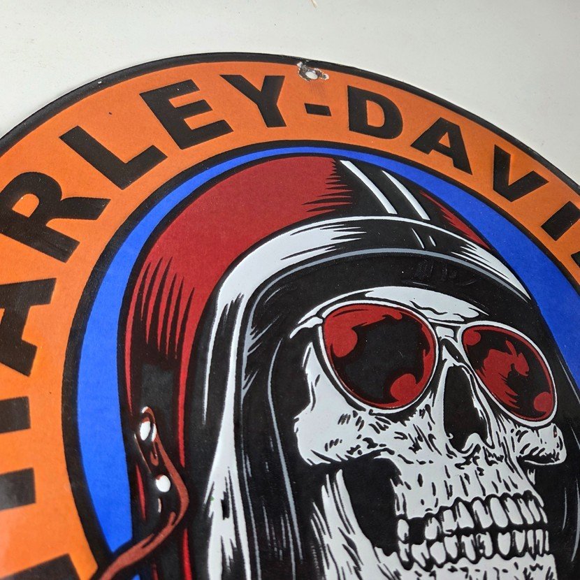 This vintage porcelain gas pump sign features the iconic Harley Davidson Motorcycles brand.