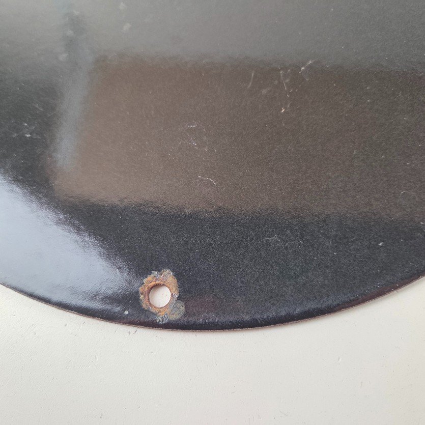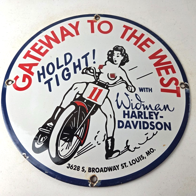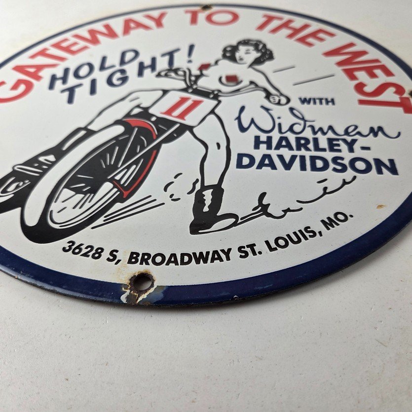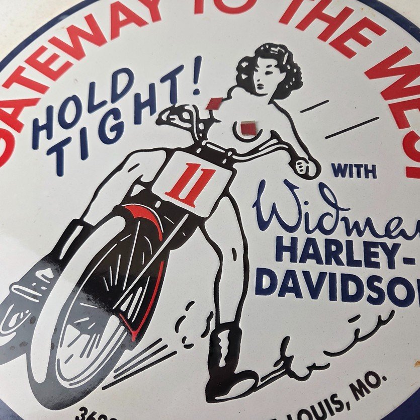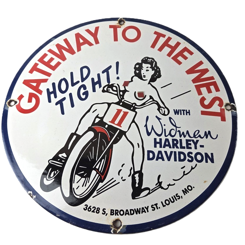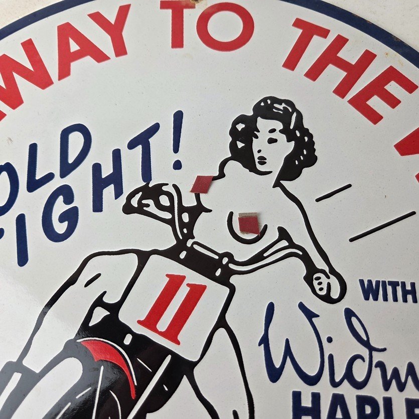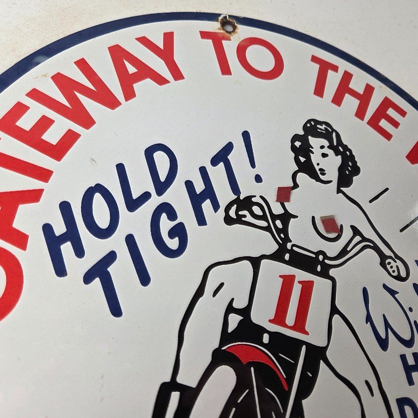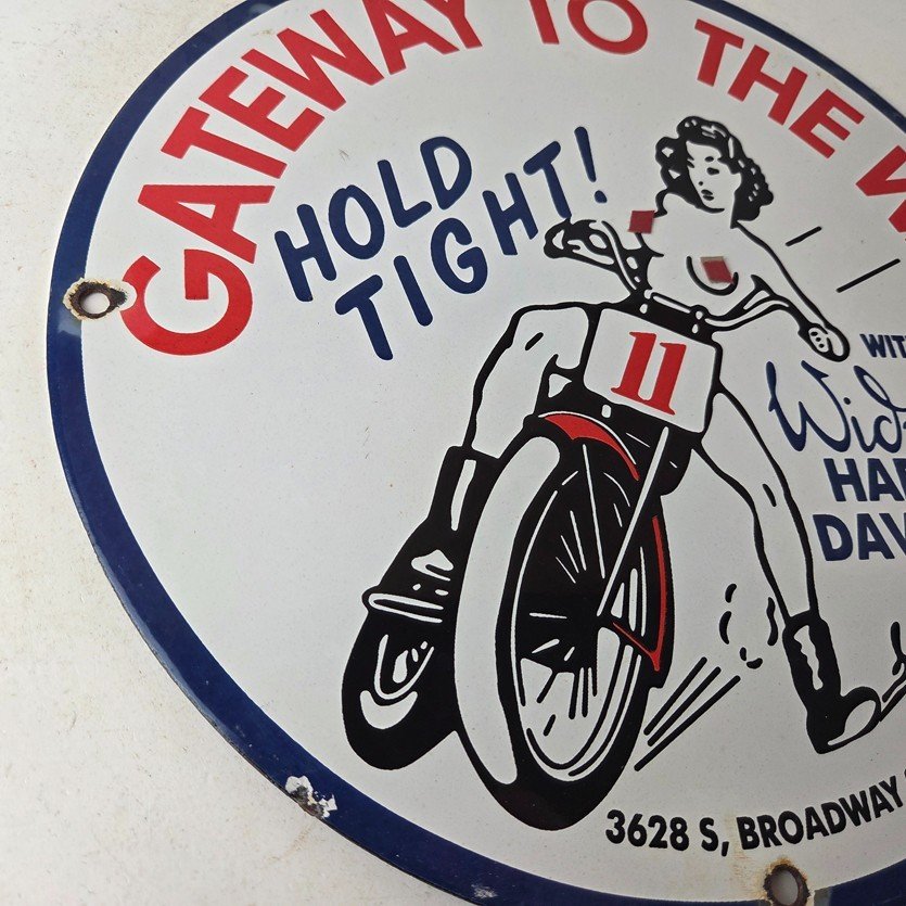 Measuring at 11 3/4″, this Porcelain sign is a perfect addition to any Gas & Oil themed memorabilia collection and featured the pinup girl riding a Harley topless. The sign is in excellent condition and can be mounted on your wall / man cave / garage with very little effort.