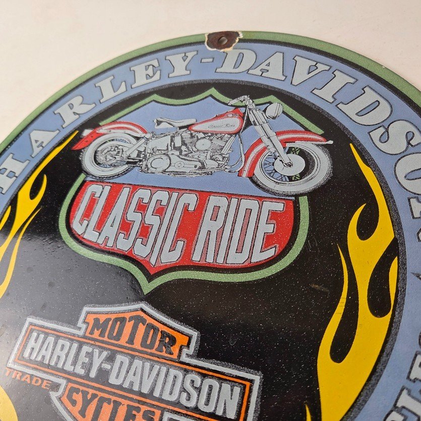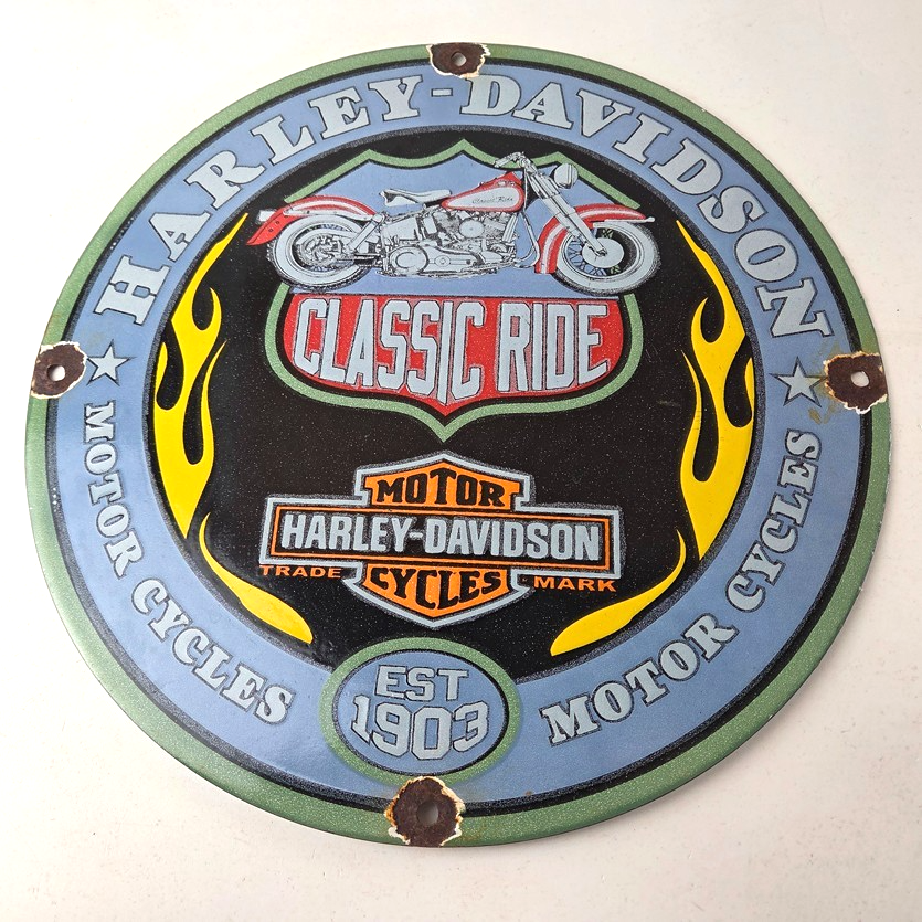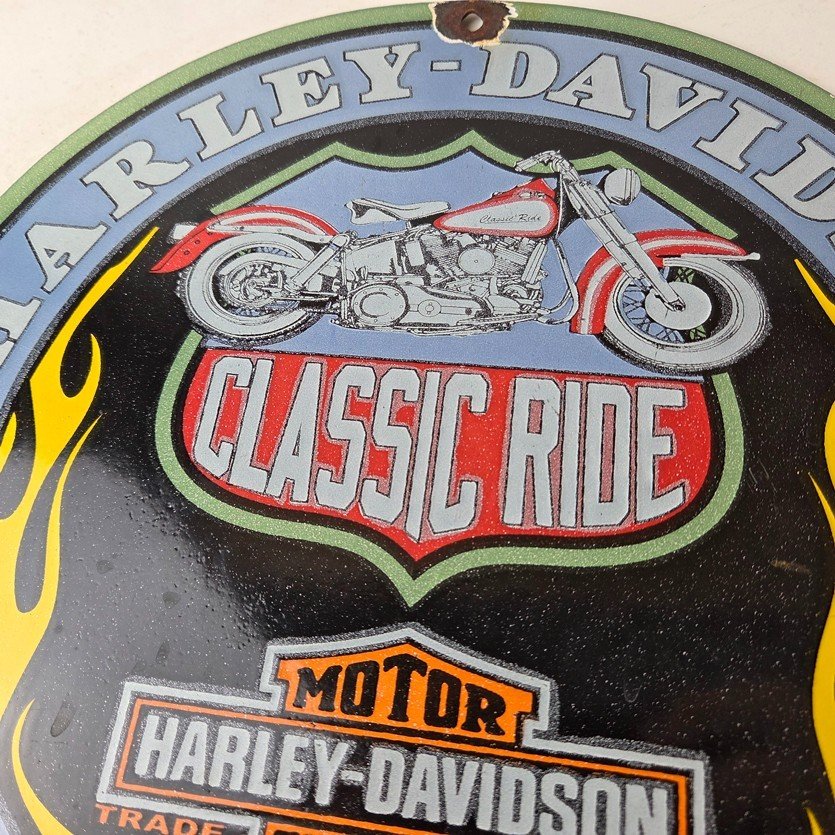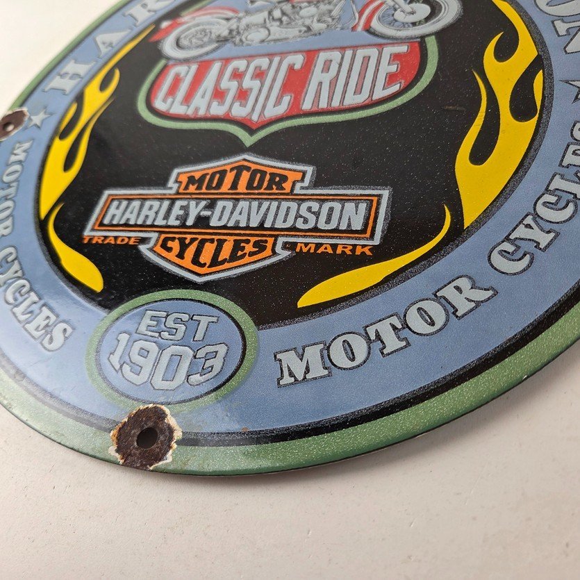 This vintage porcelain gas pump sign features the iconic Harley Davidson Motorcycles brand.