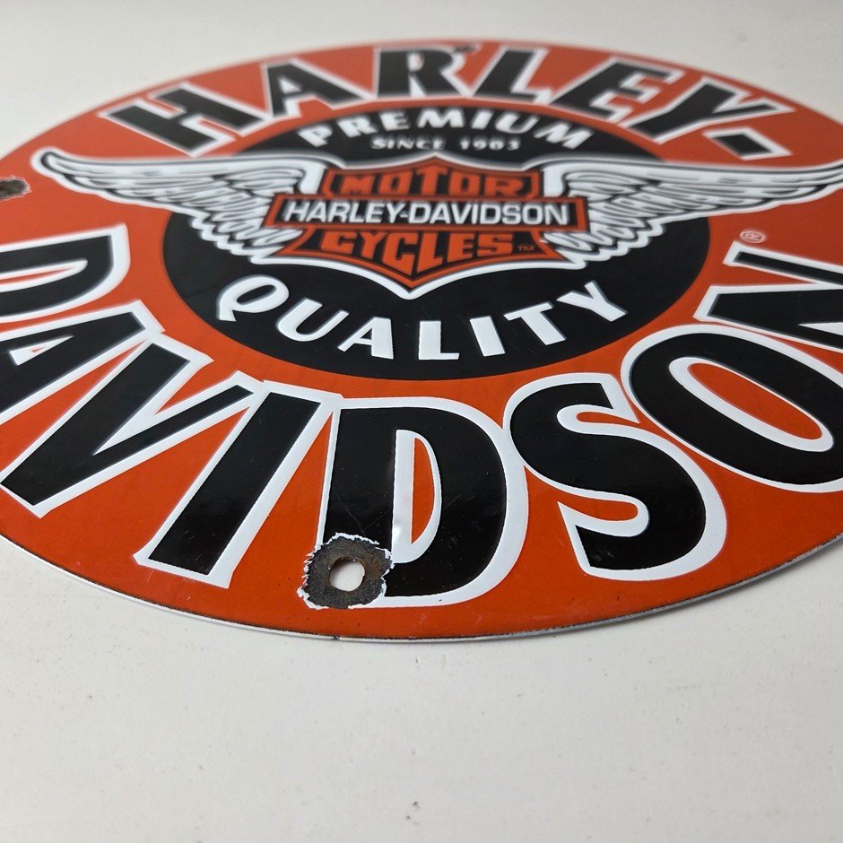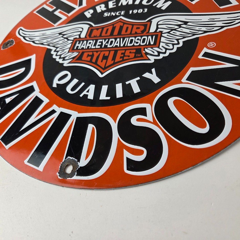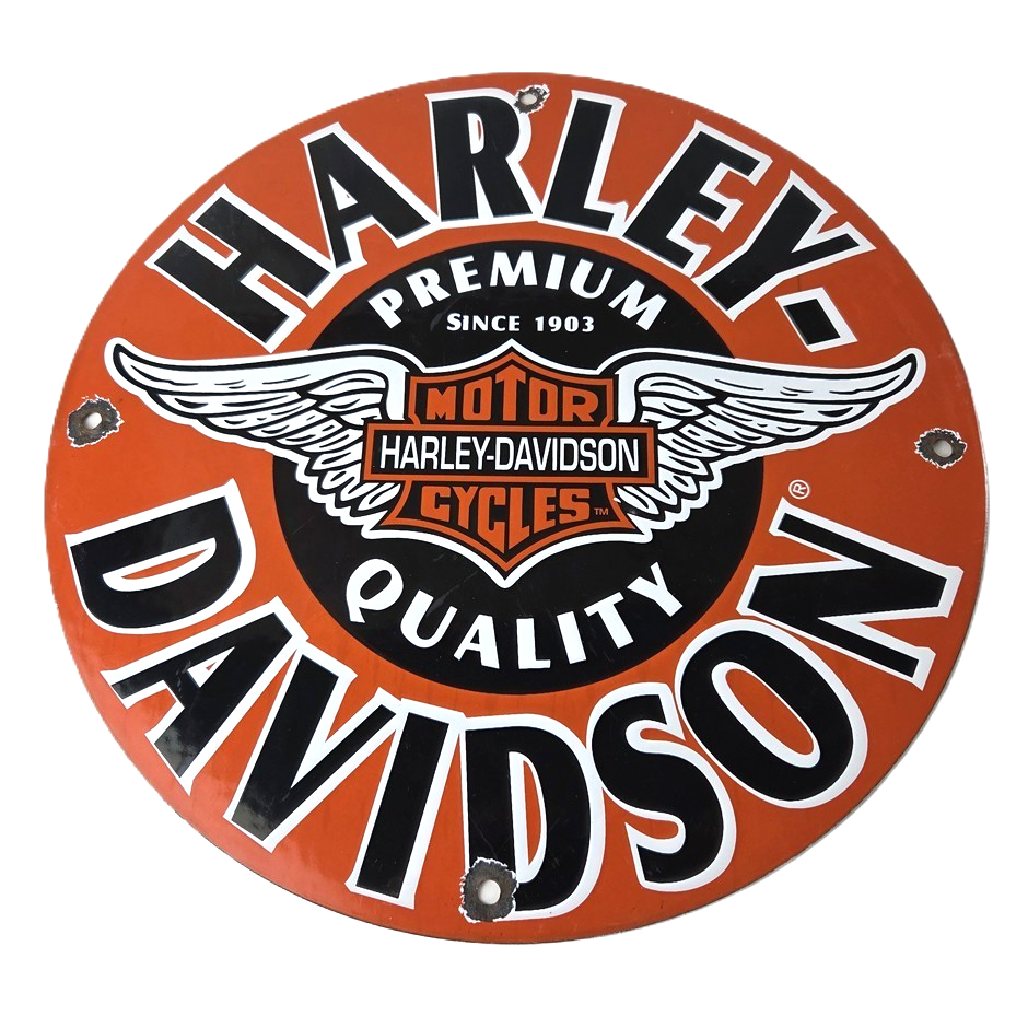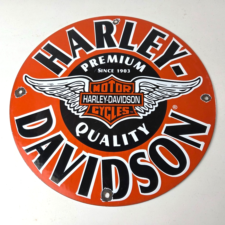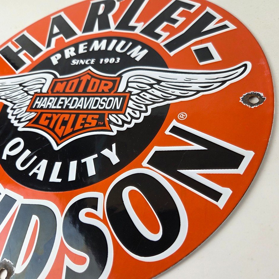 This vintage porcelain sign showcases the iconic Harley Davidson Motorcycles company with the Harley chicken wings graphic. Measuring at 11 3/4″, this Harley sign is a must-have for any gas & oil or collectibles enthusiast. The bold orange & black colors make this sign a standout piece of advertising for any man cave, collector, motorcycle shop, or garage.