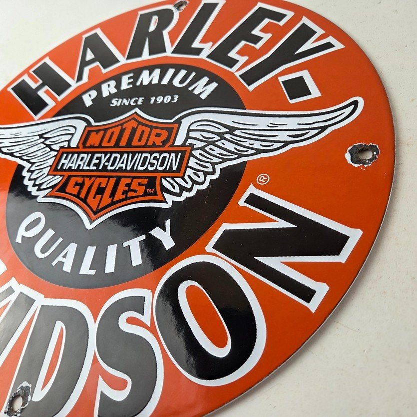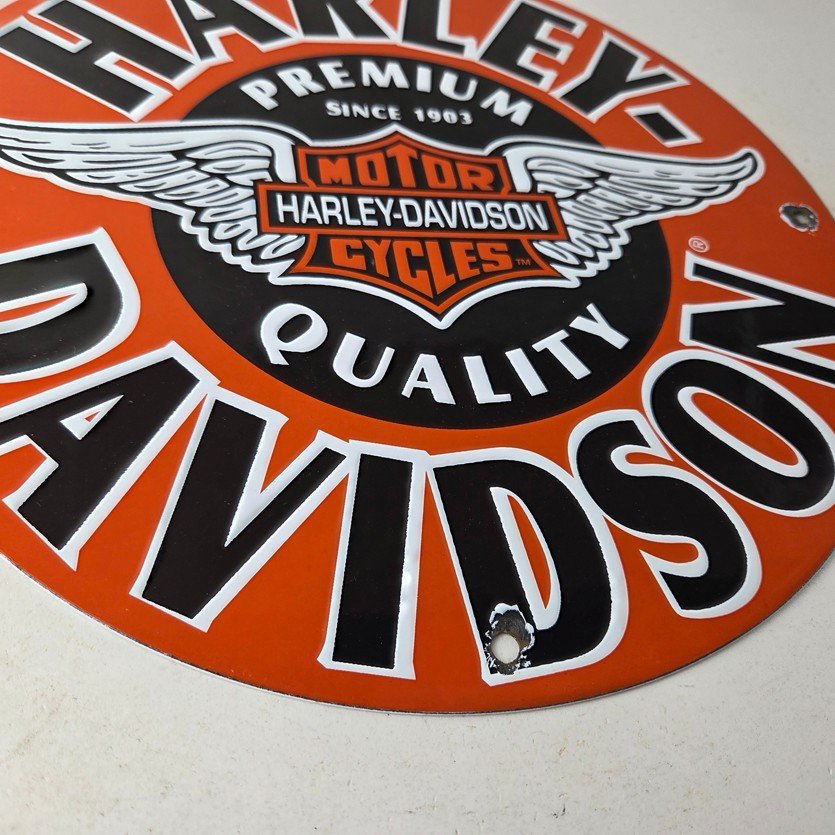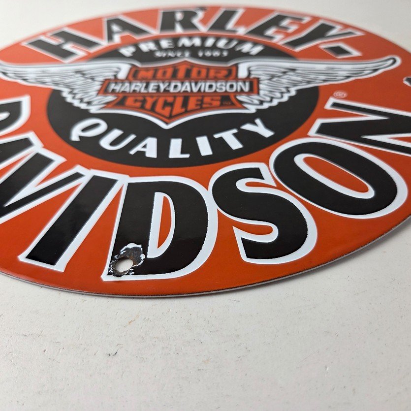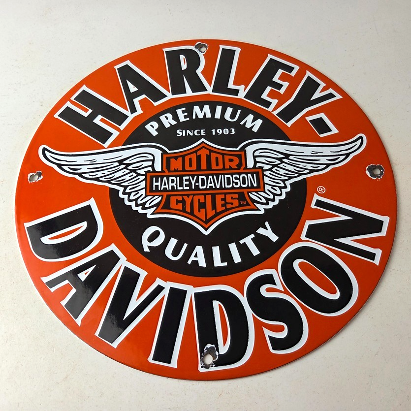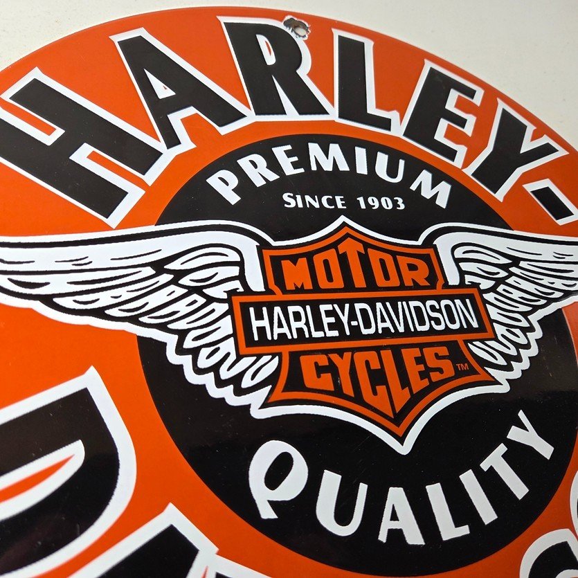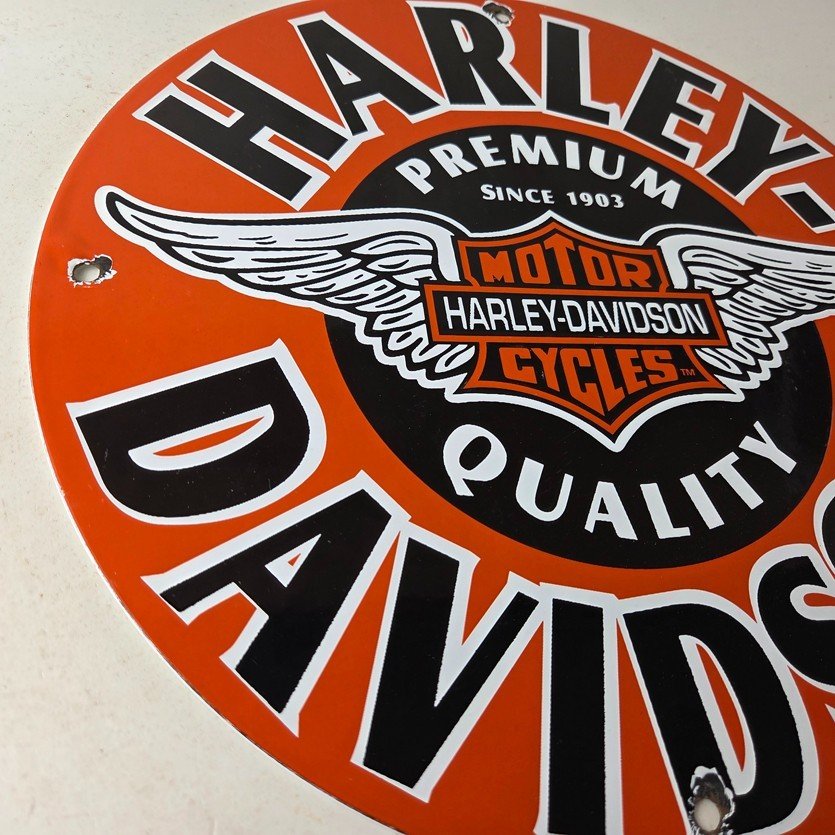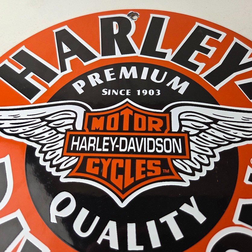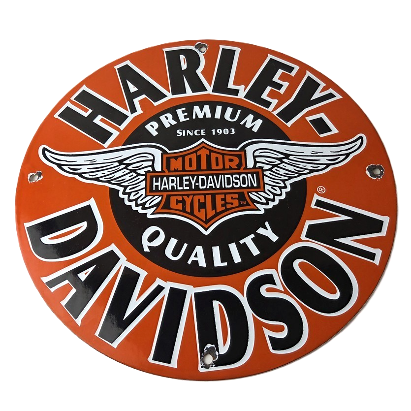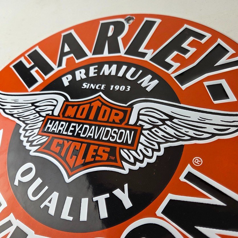 This vintage porcelain sign showcases the iconic Harley Davidson Motorcycles company with the Harley chicken wings graphic. Measuring at 11 3/4″, this Harley sign is a must-have for any gas & oil or collectibles enthusiast. The bold orange & black colors make this sign a standout piece of advertising for any man cave, collector, motorcycle shop, or garage.