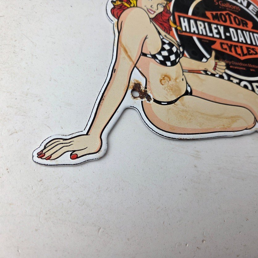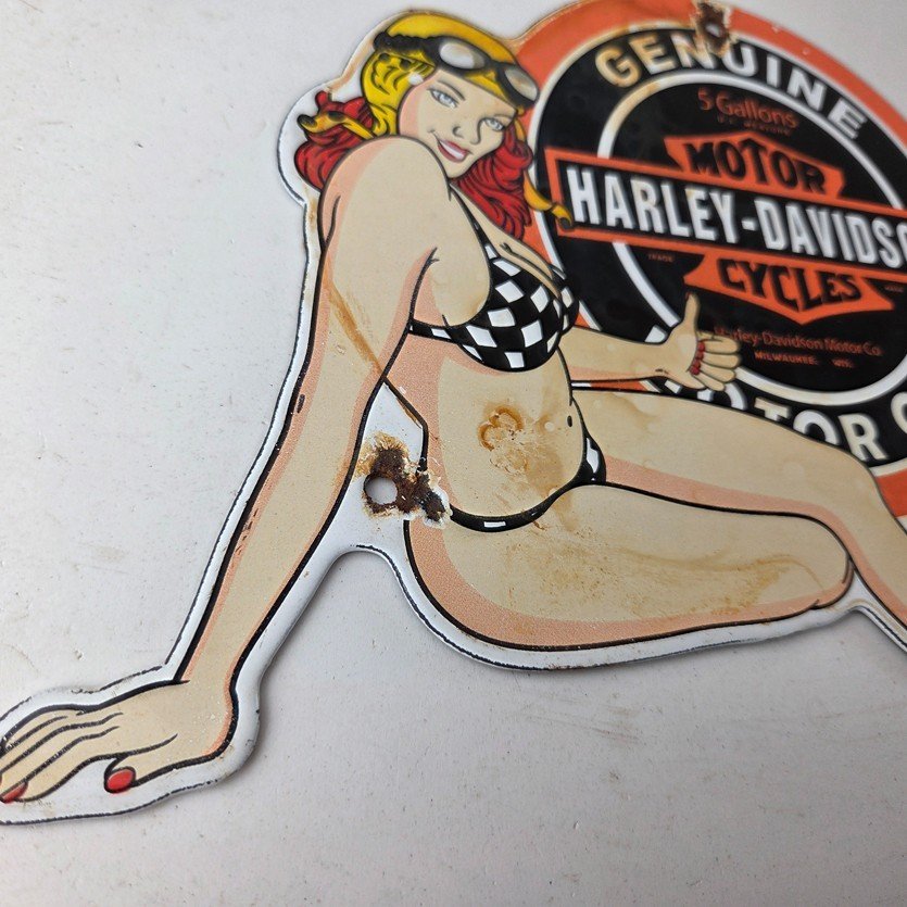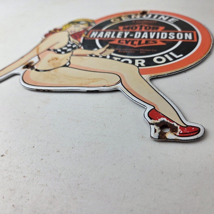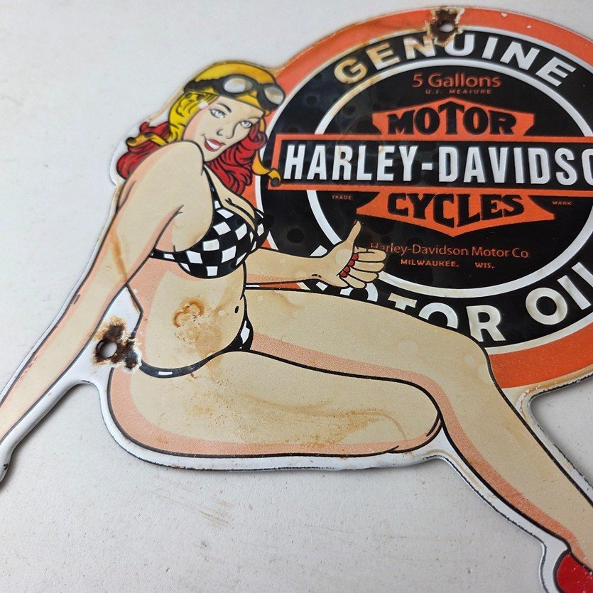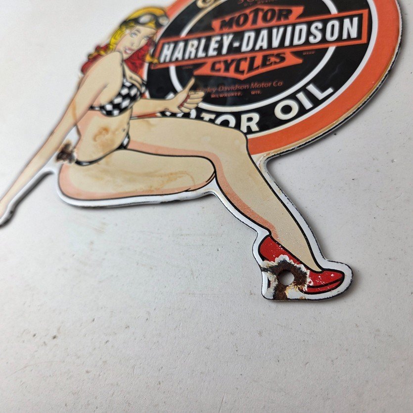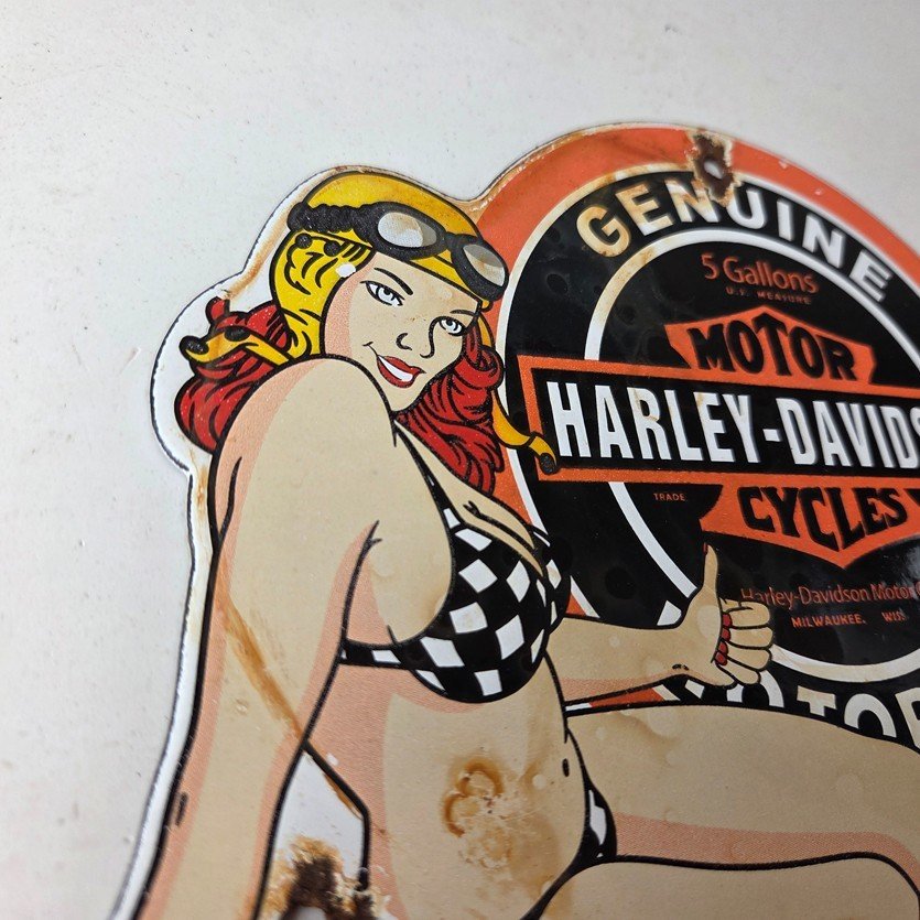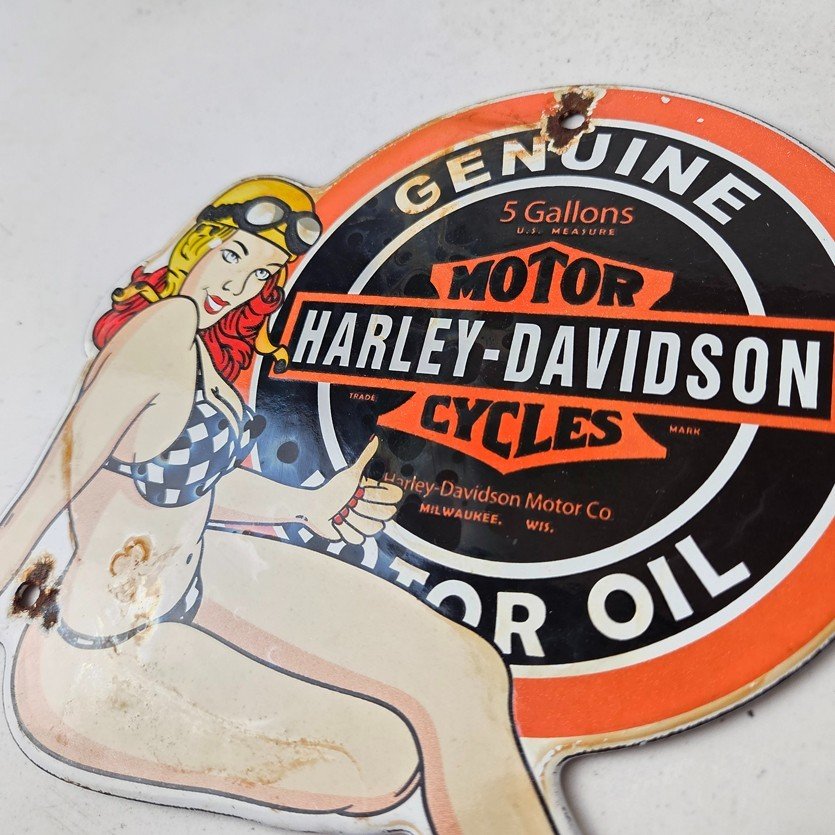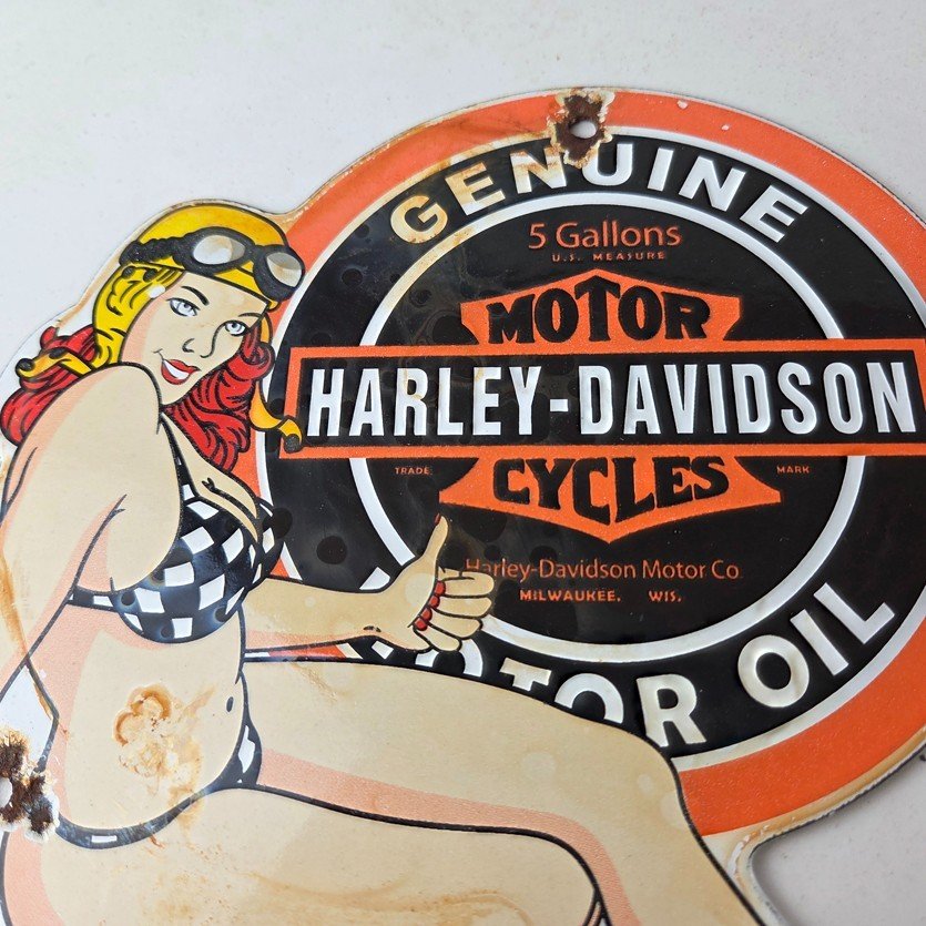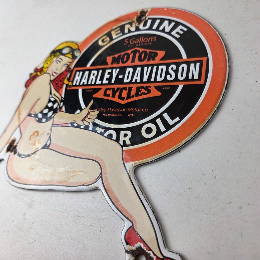 This vintage porcelain gas pump sign features the iconic Harley Davidson Motorcycles brand.