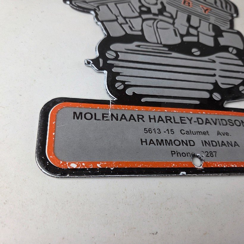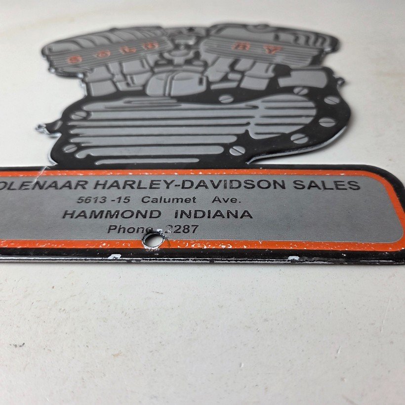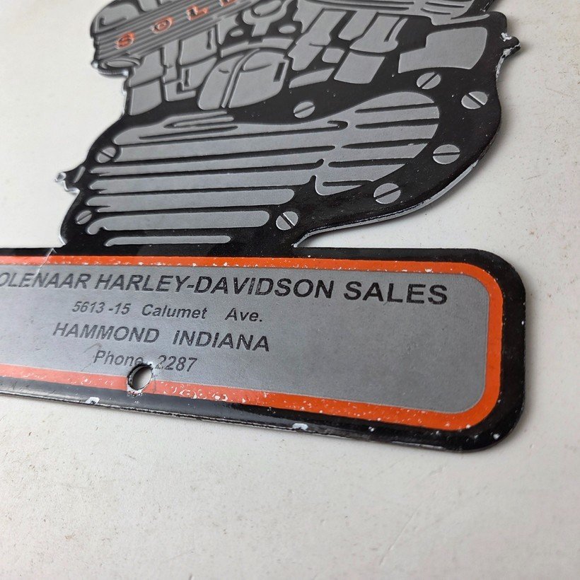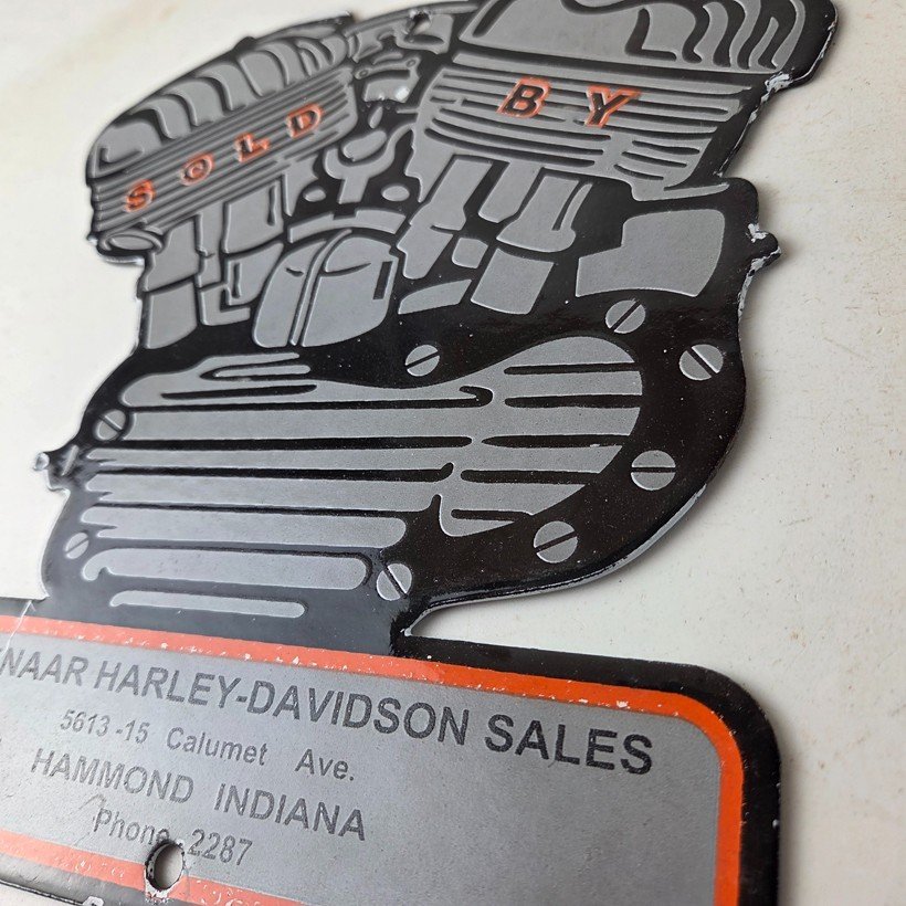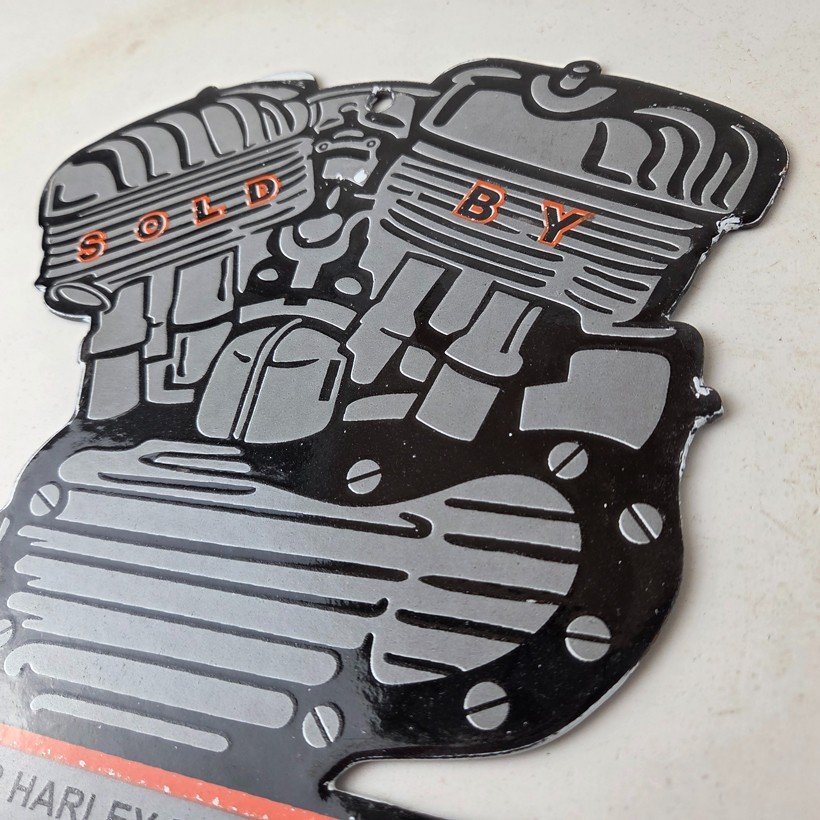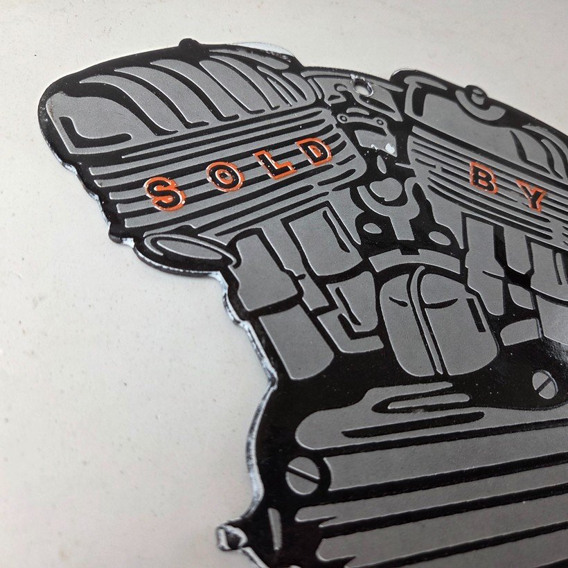 This vintage porcelain sign showcases the iconic Harley Davidson Motorcycles company with the Genuine Parts & Service engine. Measuring at 12″ by 8″, this Harley sign is a must-have for any gas & oil or collectibles enthusiast. The bold orange & black colors make this sign a standout piece of advertising for any man cave, collector, motorcycle shop, or garage.
