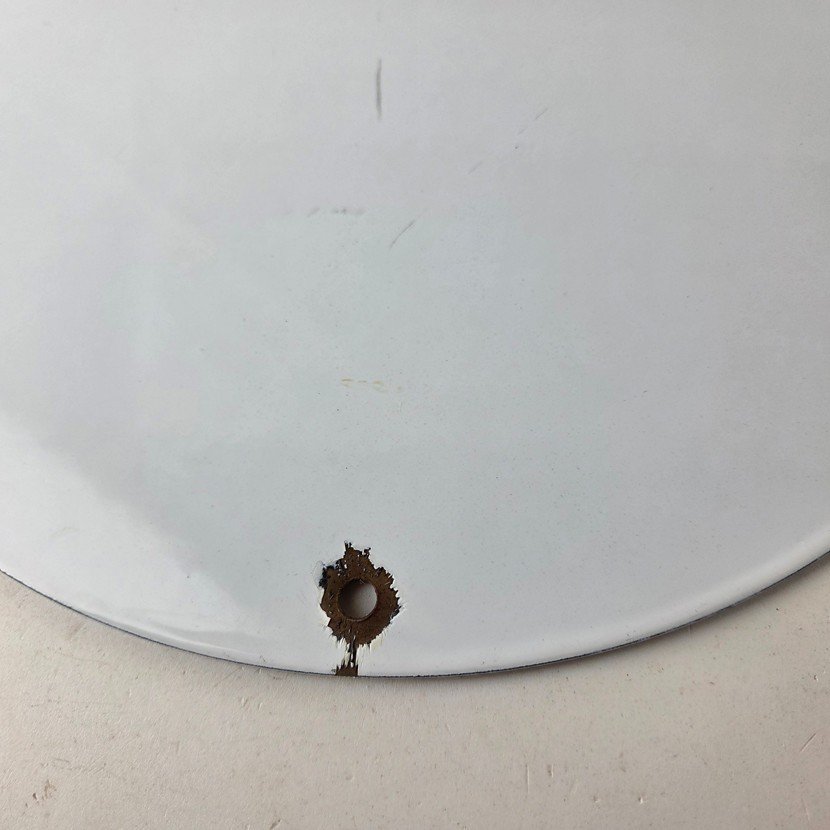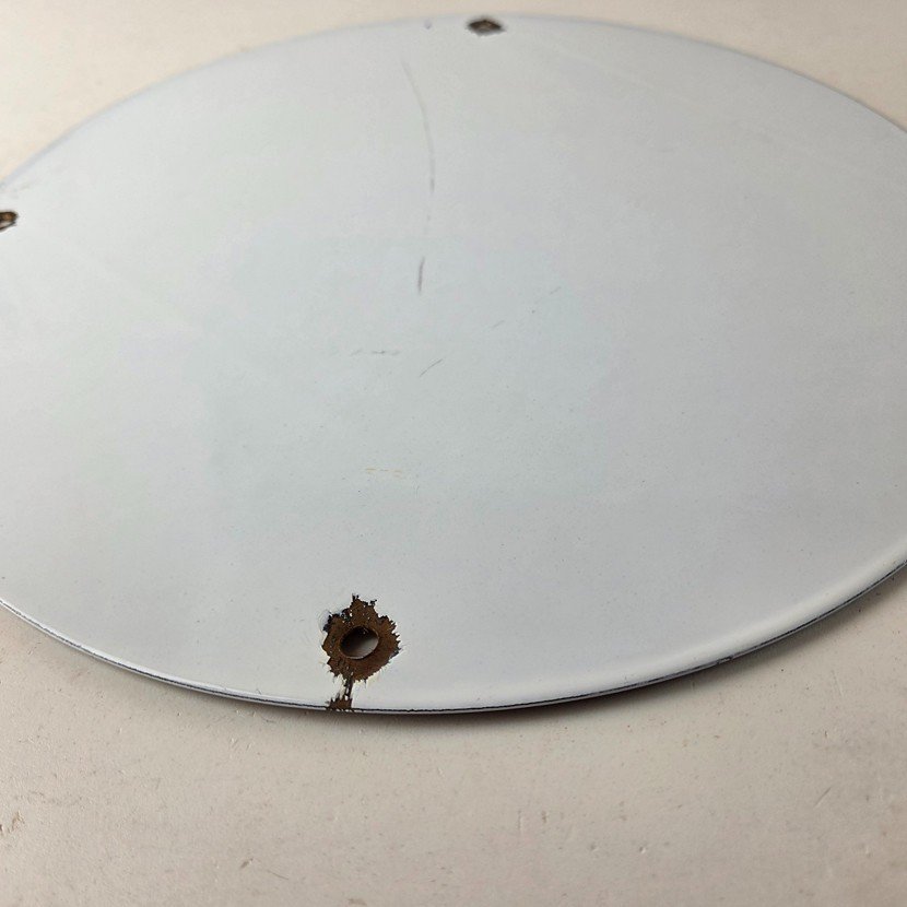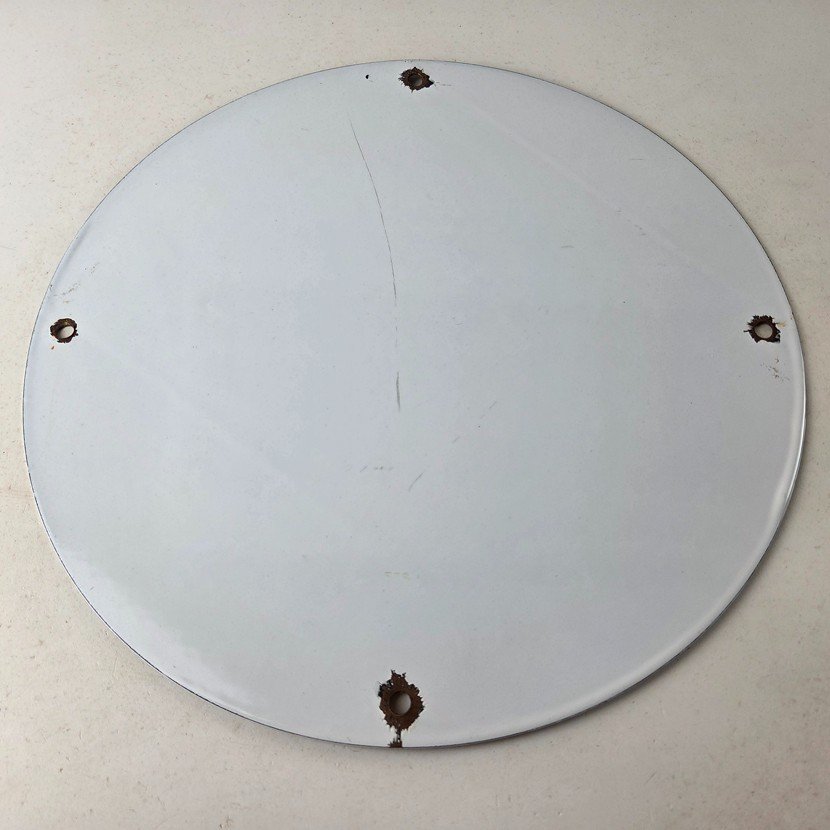 Made of porcelain enamel on steel with patina and wear: rust spotting around the mounting holes, minor edge chips, light surface scratches, and minimal discoloration. This is a porcelain enamel advertising sign in excellent condition, exactly as shown in the photos.