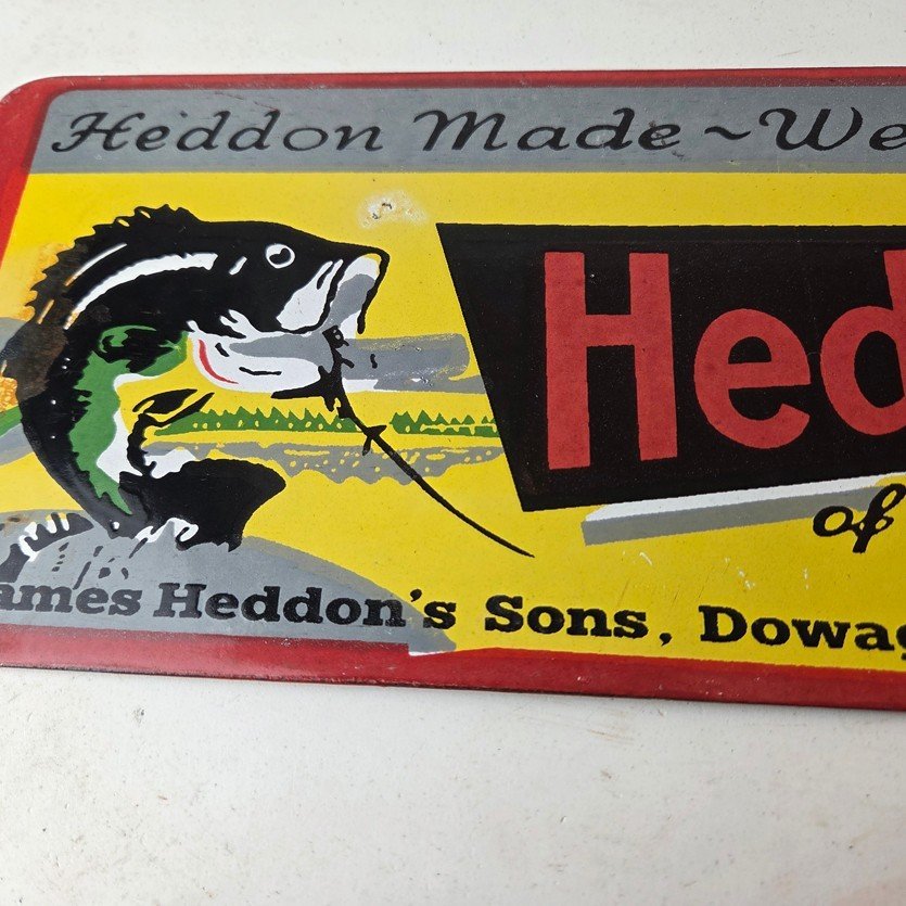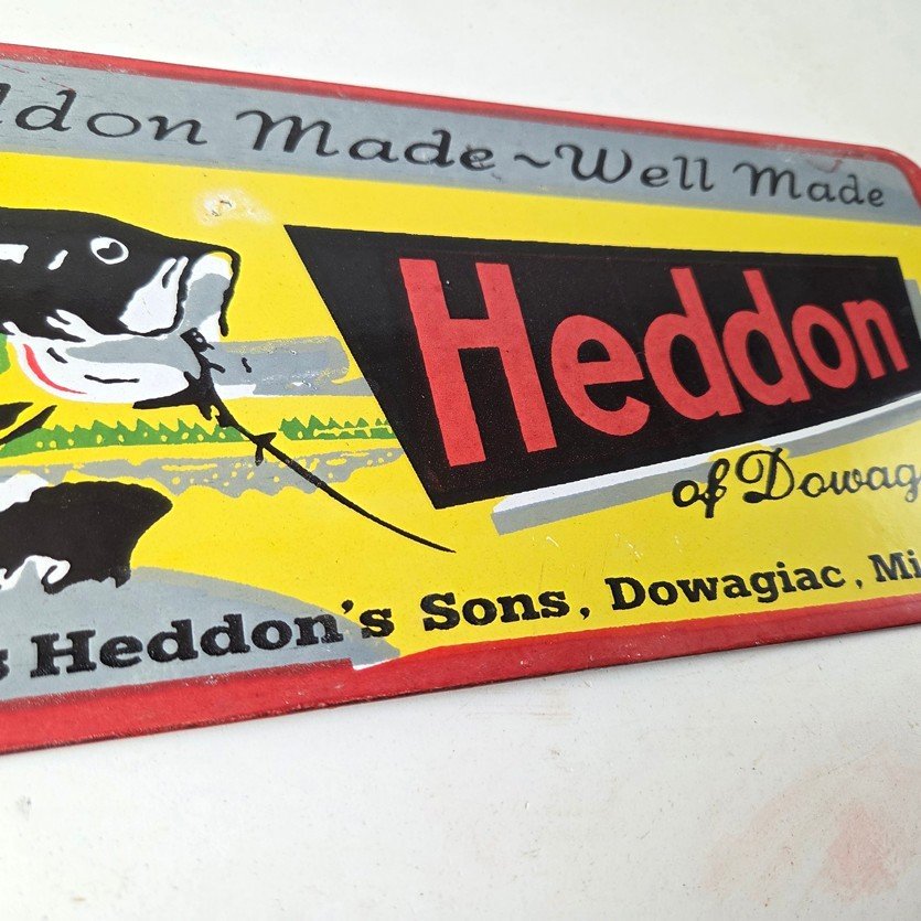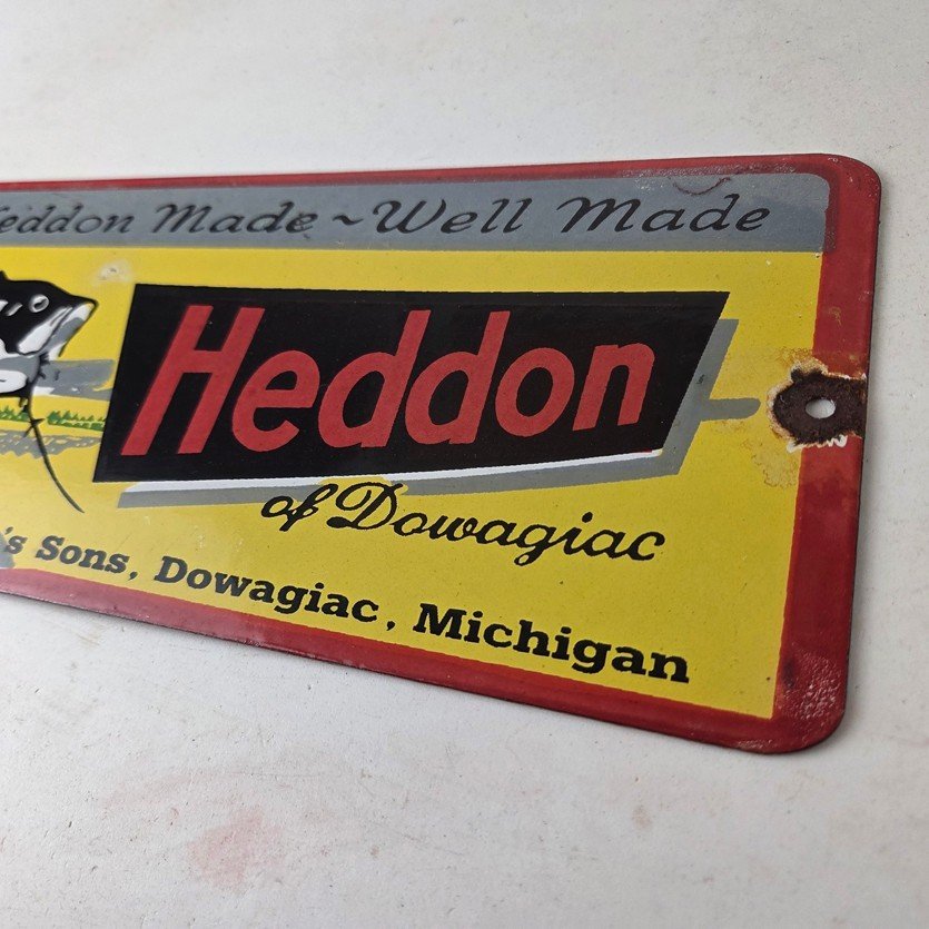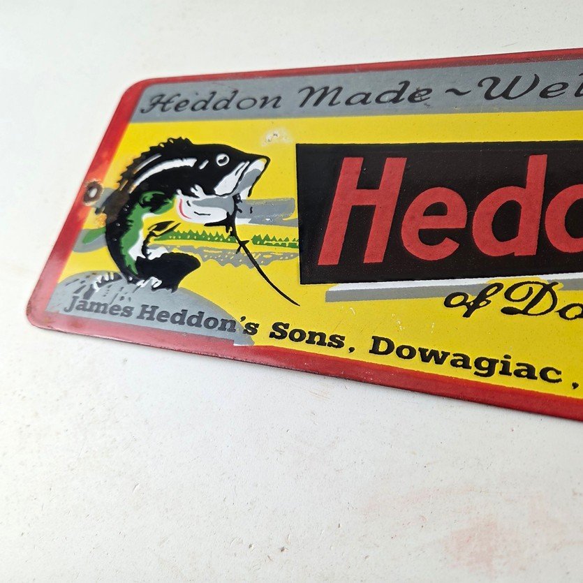 This vintage Heddon Fishing Lures porcelain sign has excellent colors and measures 11 inches across by 5 inches tall. Add a touch of nostalgia to your fishing collection with this vintage porcelain sign featuring Heddon Fishing Lures.