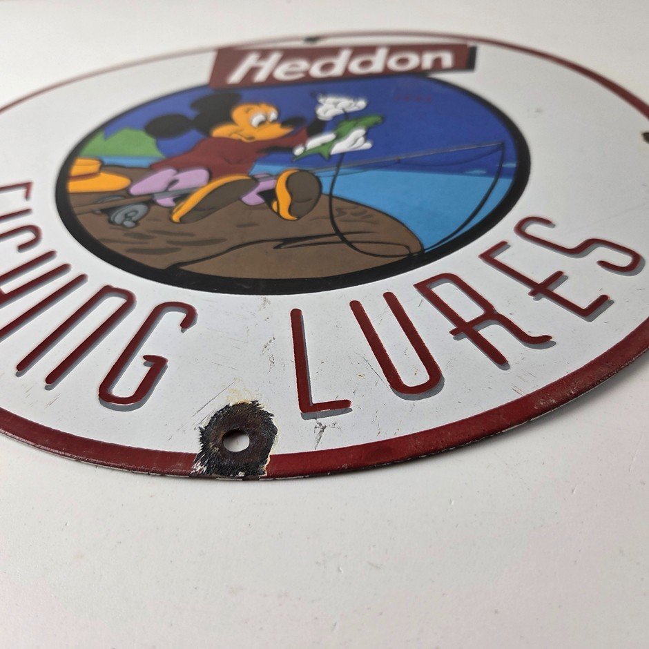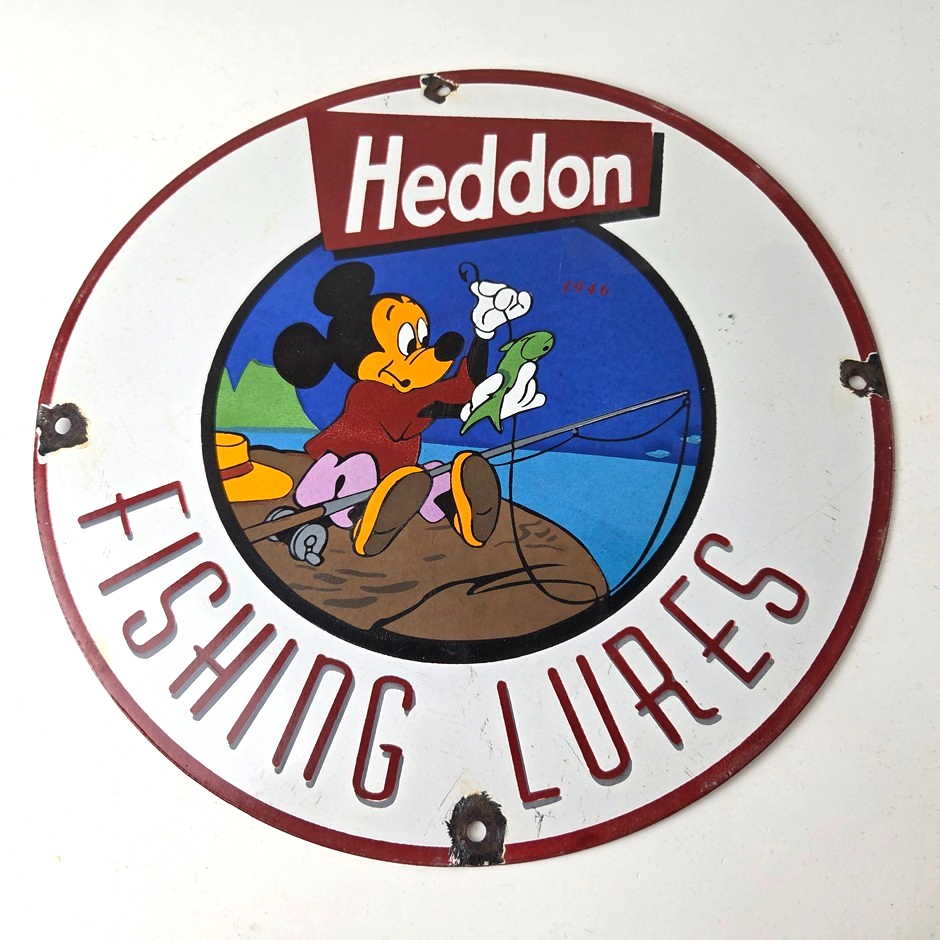 This vintage Heddon Fishing Lures porcelain sign has excellent colors and measures 12″ across. Add a touch of nostalgia to your fishing collection with this vintage porcelain sign featuring Heddon Fishing Lures.