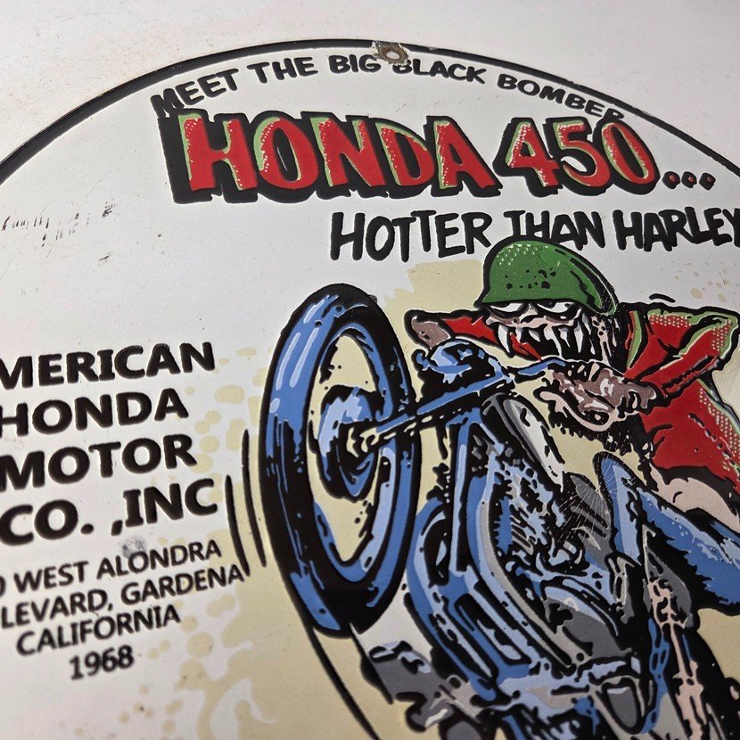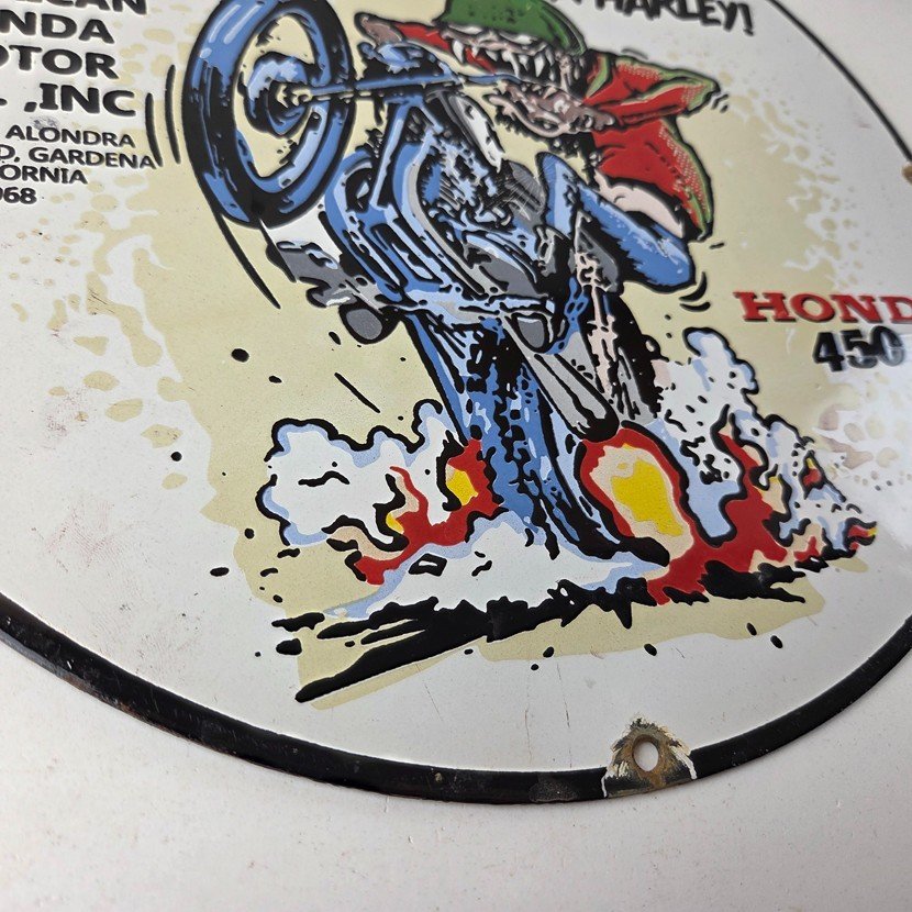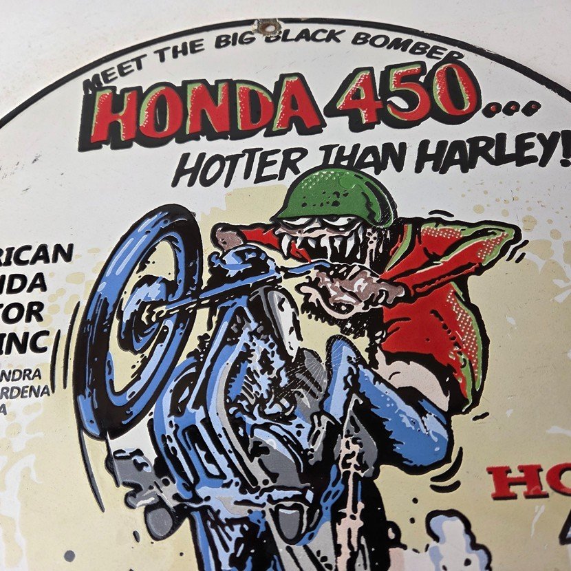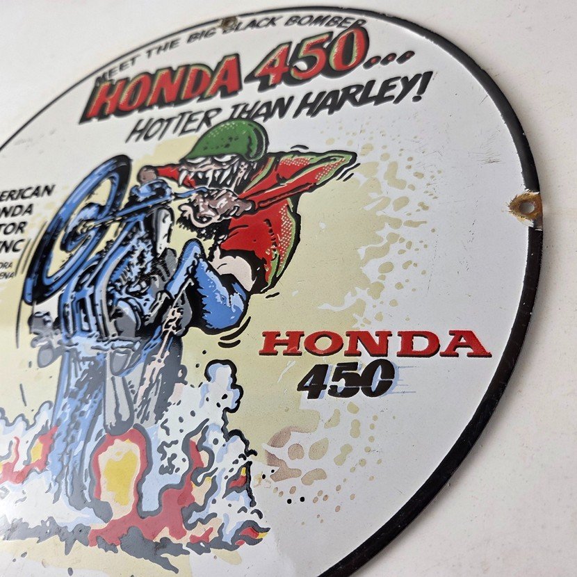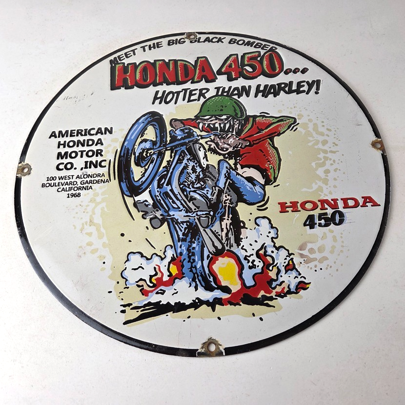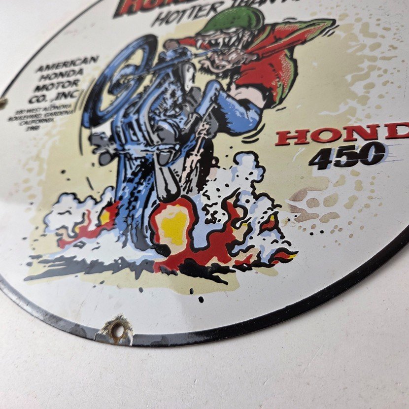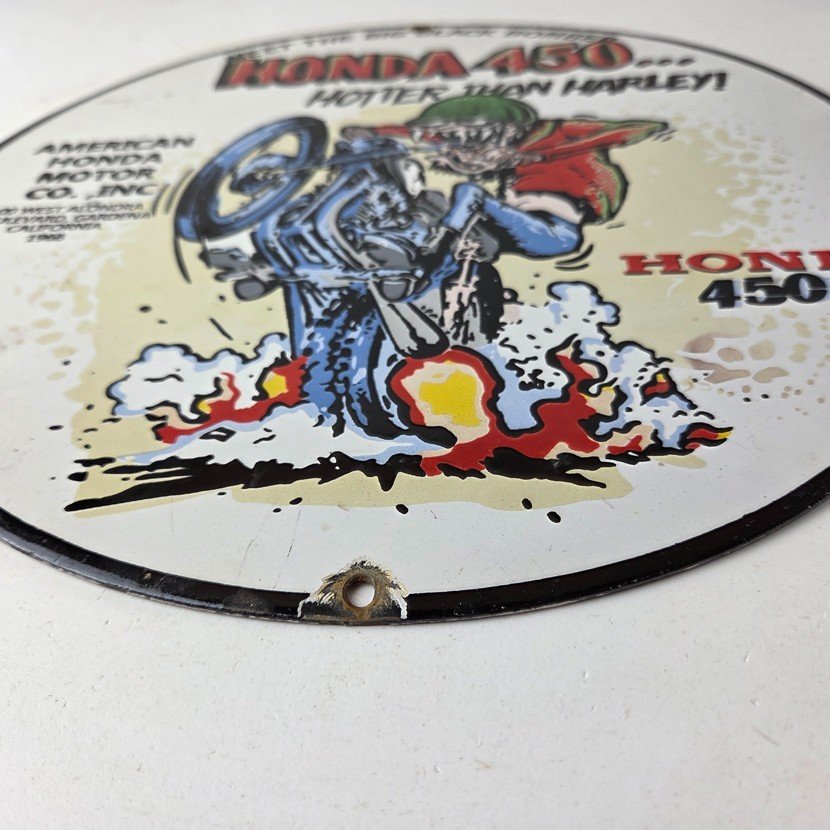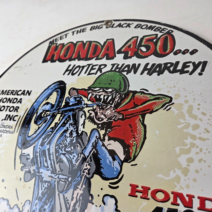 This vintage Rat Fink Porcelain sign is a true gem for any collector of oil & gas memorabilia. Rev up your collectibles with this vintage Honda hot rod sign featuring Rat Fink styling. Measuring 12″ across and made of porcelain, this striking piece is perfect for any biker or gas & oil enthusiast.