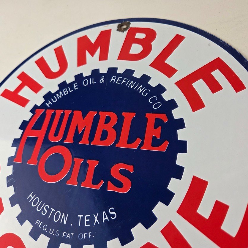 This vintage Humble Gasoline porcelain sign features a striking design with bold red & Blue colors and is made of porcelain material. It is perfect for display in a garage, shop, or man cave. The sign measures 11 3/4″ and is in excellent condition, with no major chips or cracks. It was made in the United States and has excellent porcelain and colors.