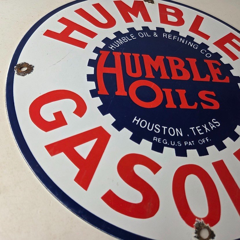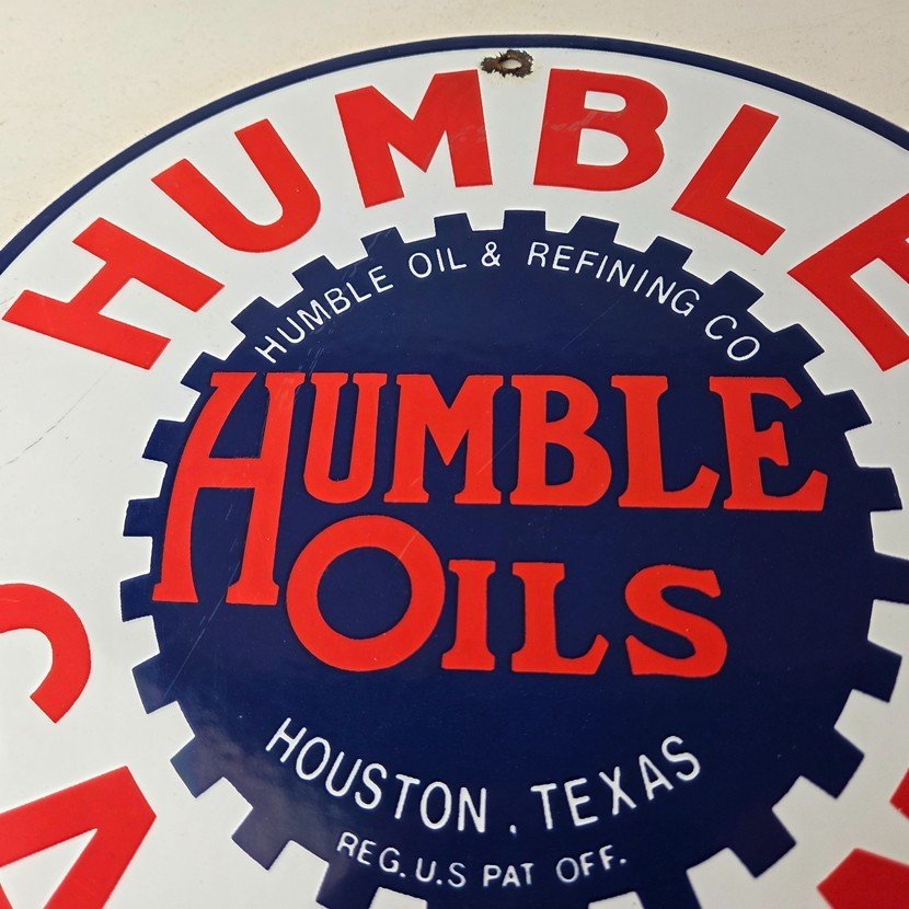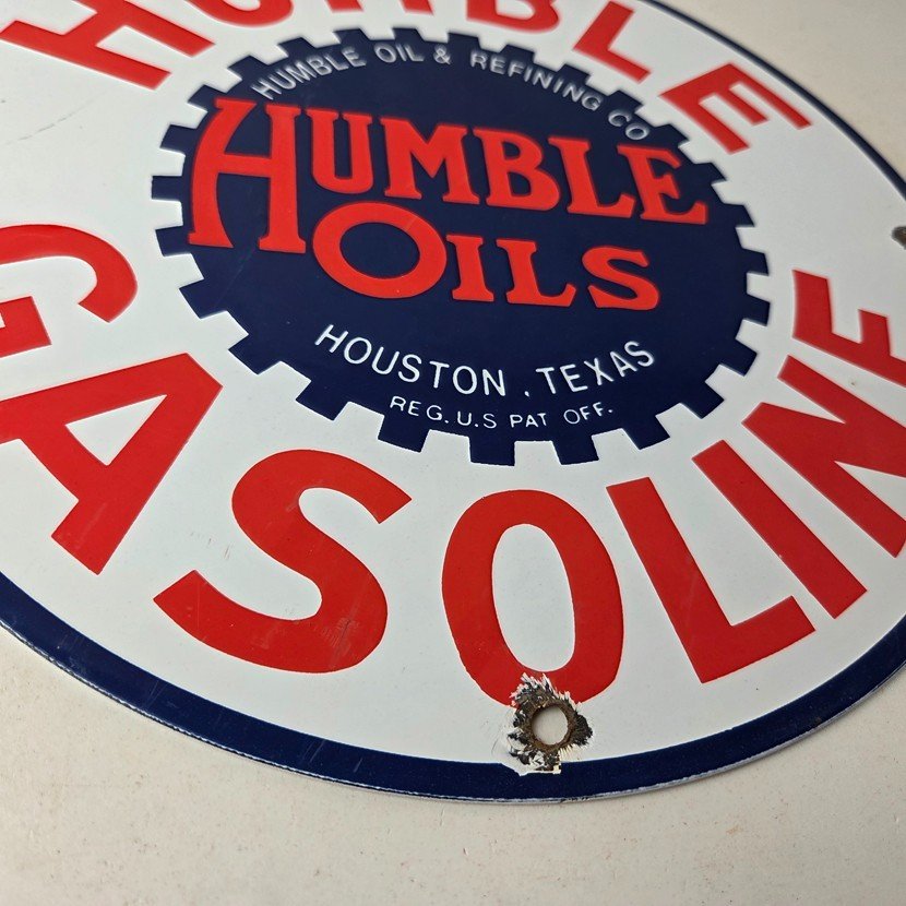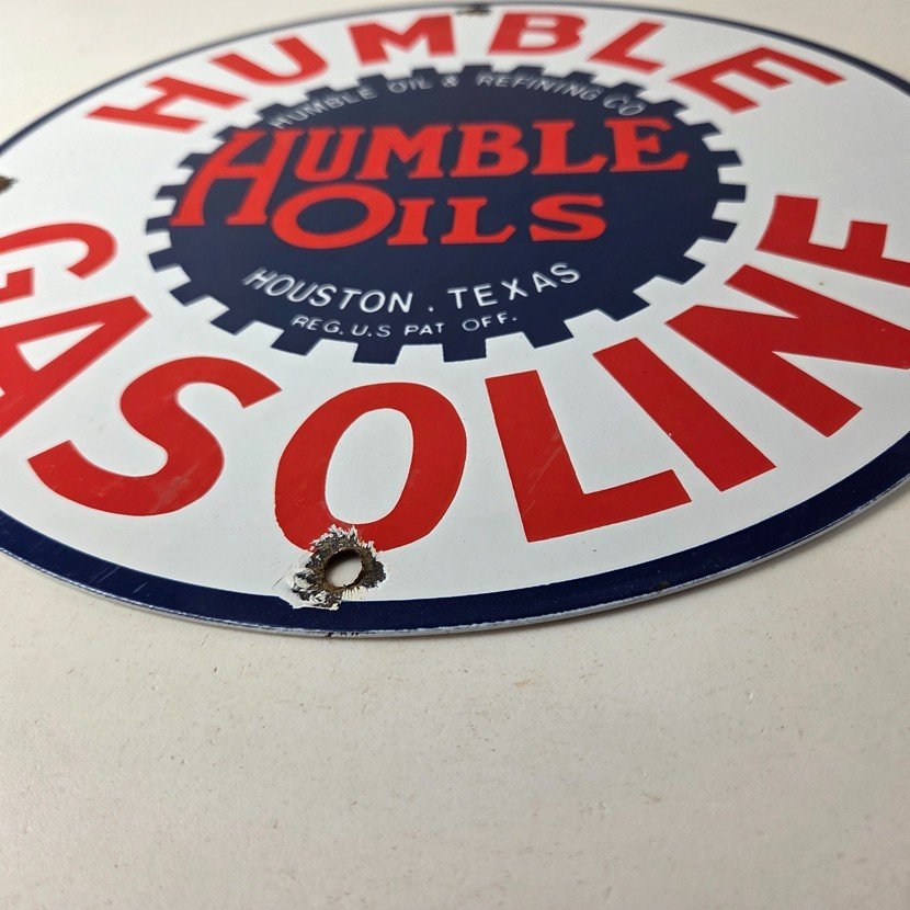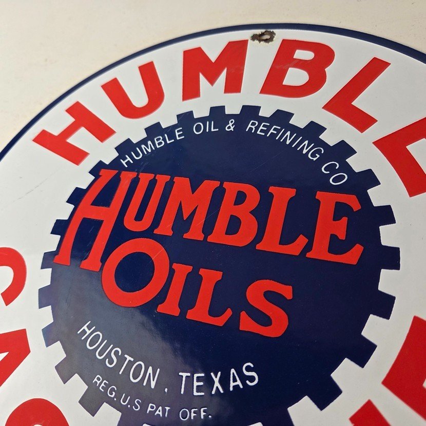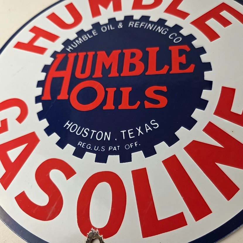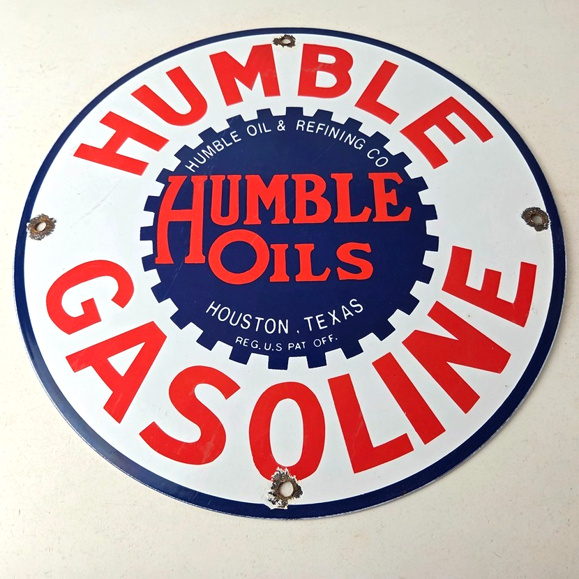 This vintage Humble Gasoline porcelain sign features a striking design with bold red & blue colors and is made of porcelain material. It is perfect for display in a garage, shop, or man cave. The sign measures 11 3/4″ and is in excellent condition, with no major chips or cracks. It was made in the United States and has excellent porcelain and colors.