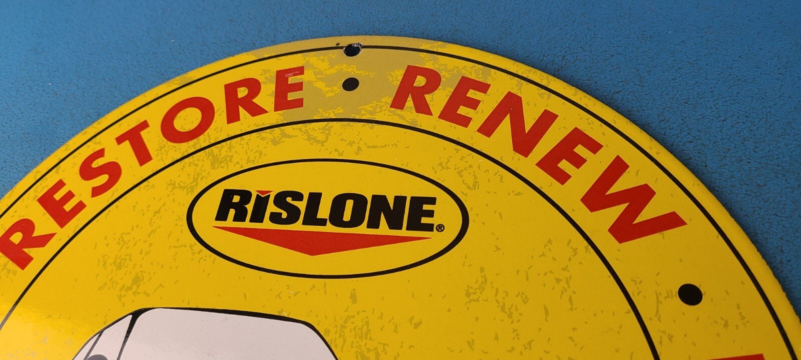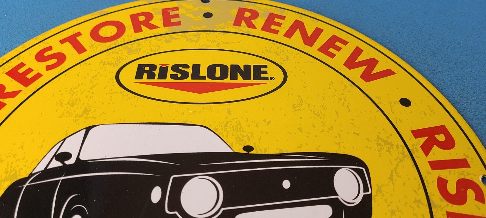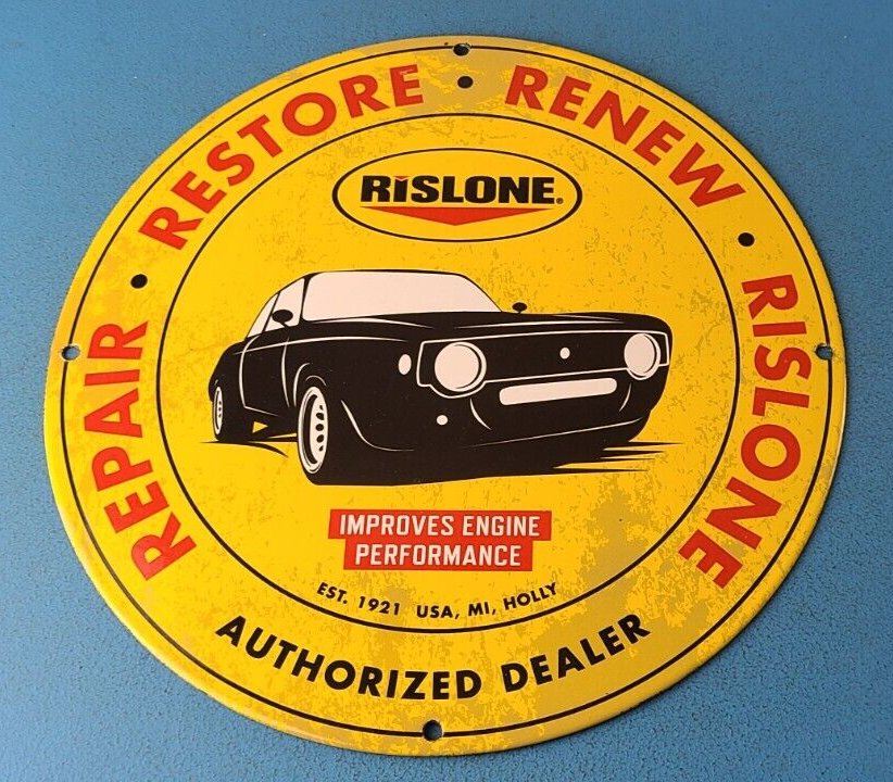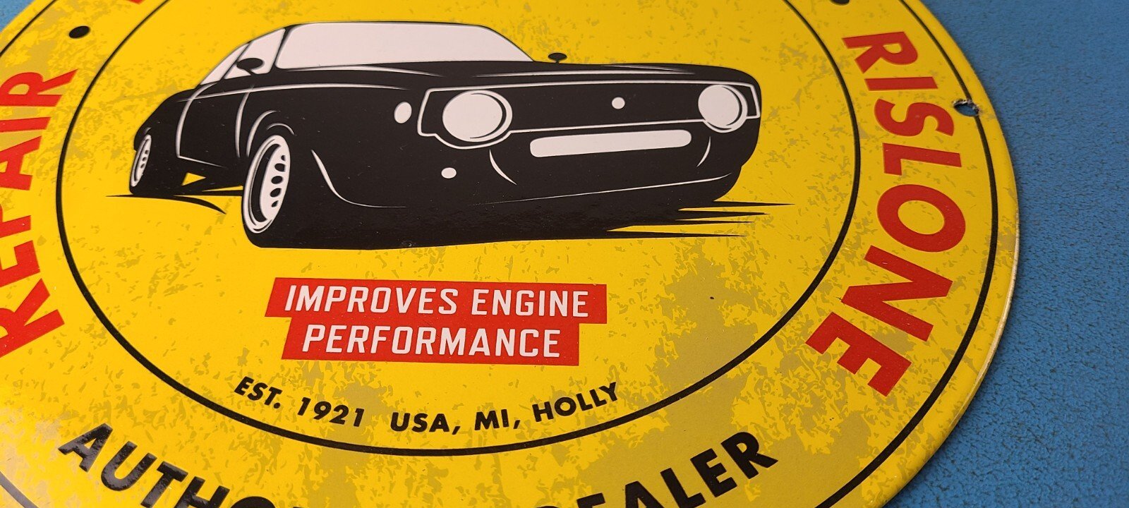 This vintage Rislone porcelain sign is a great addition to any gas and oil or automotive memorabilia collection. Featuring the Rislone brand, this sign promotes their Improve Engine Additive product in bold yellow, red, and black colors. The sign measures11 3/4″ and is in excellent condition, with no major chips or cracks.