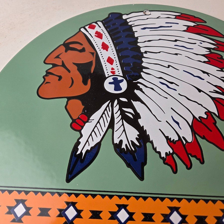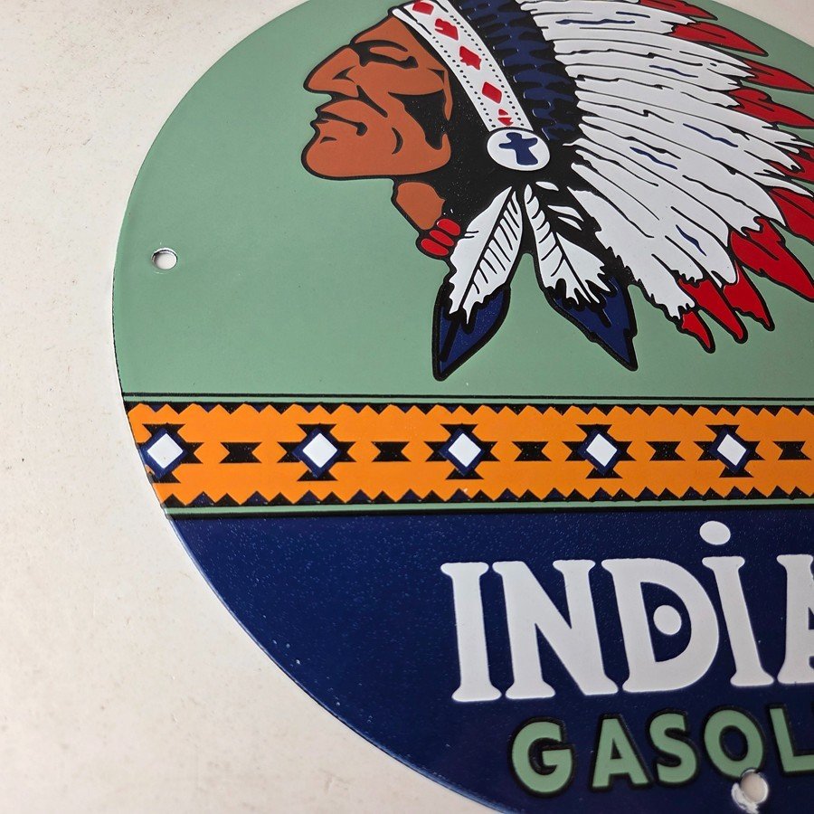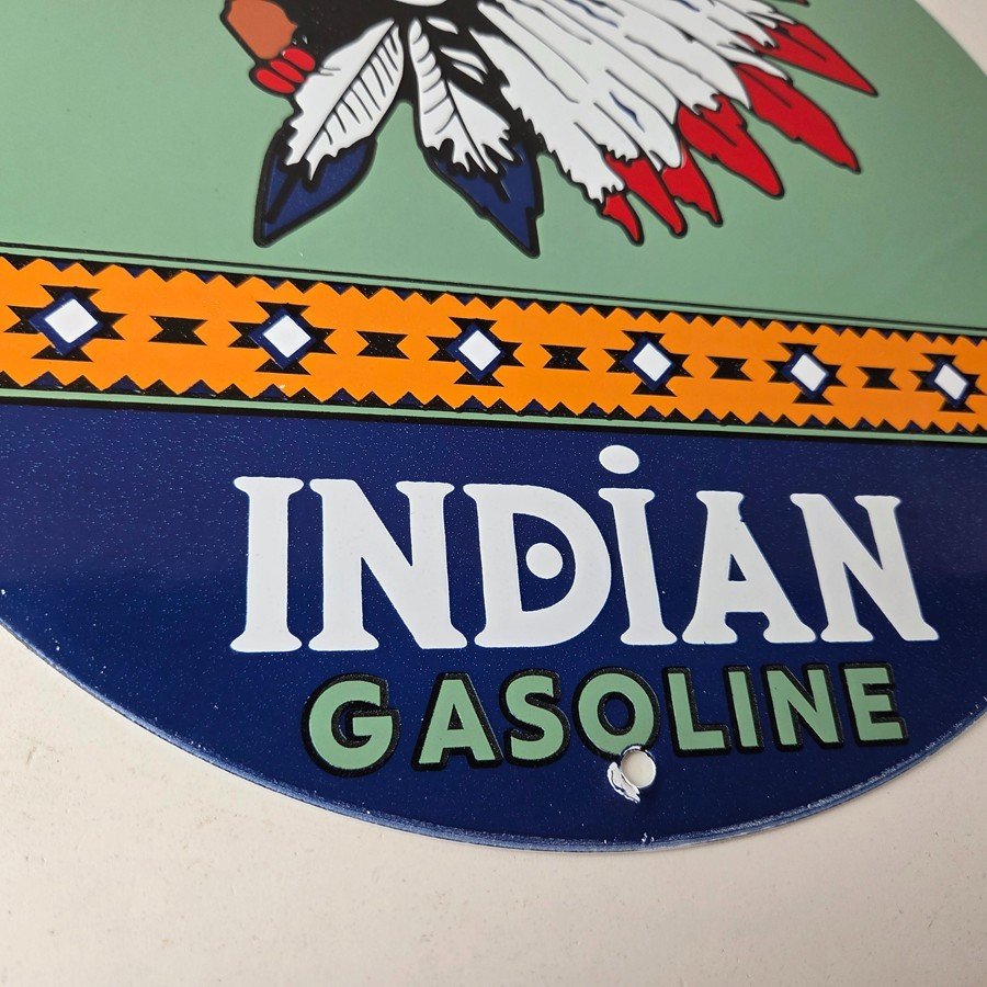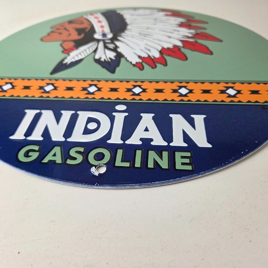 Add a piece of Gasoline memorabilia to your gas & oil collection with this vintage porcelain Indian Gasoline Sign. The beautifully designed native American Indian Chief Gas Pump Sign is a must-have for any advertising and collectibles enthusiast. Made with porcelain this sign measures 11 3/4″ across. This sign features Indian Gas as the brand type.