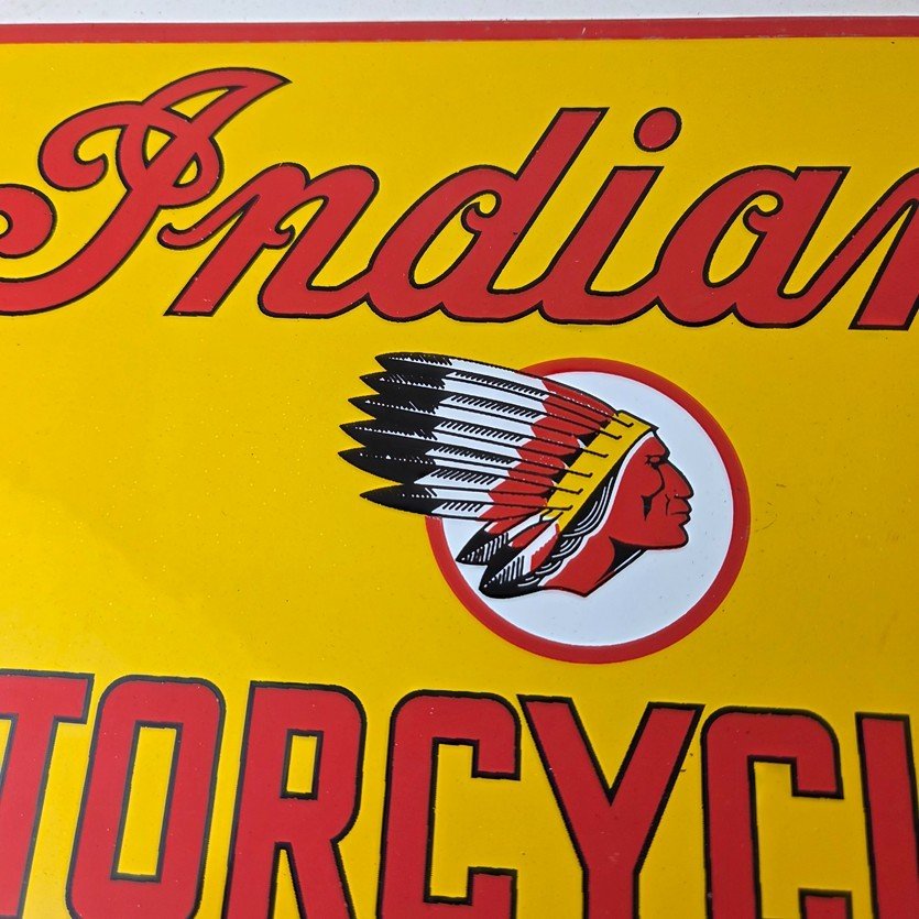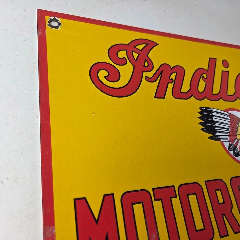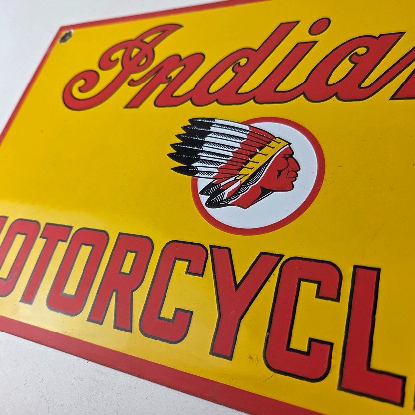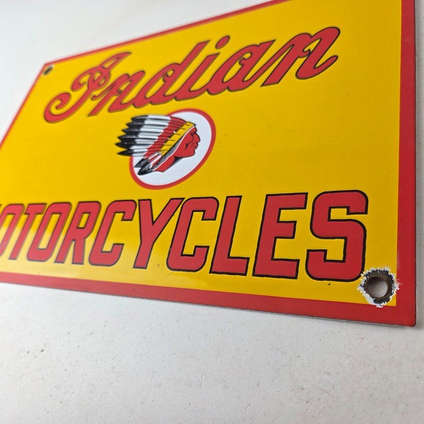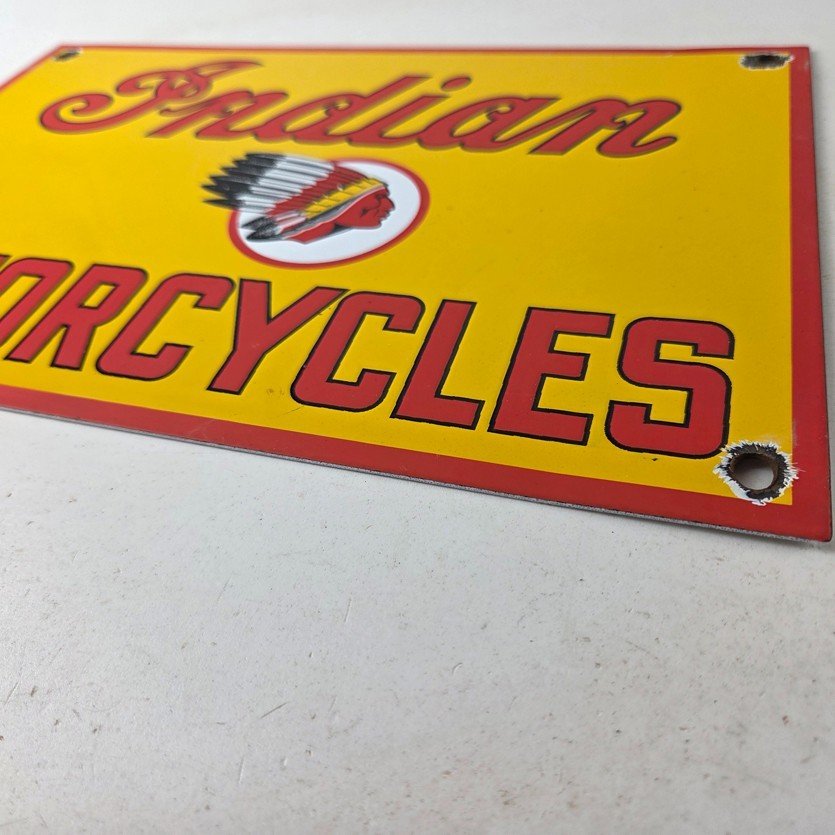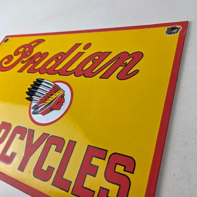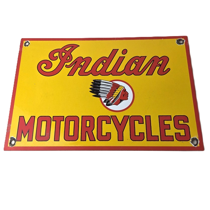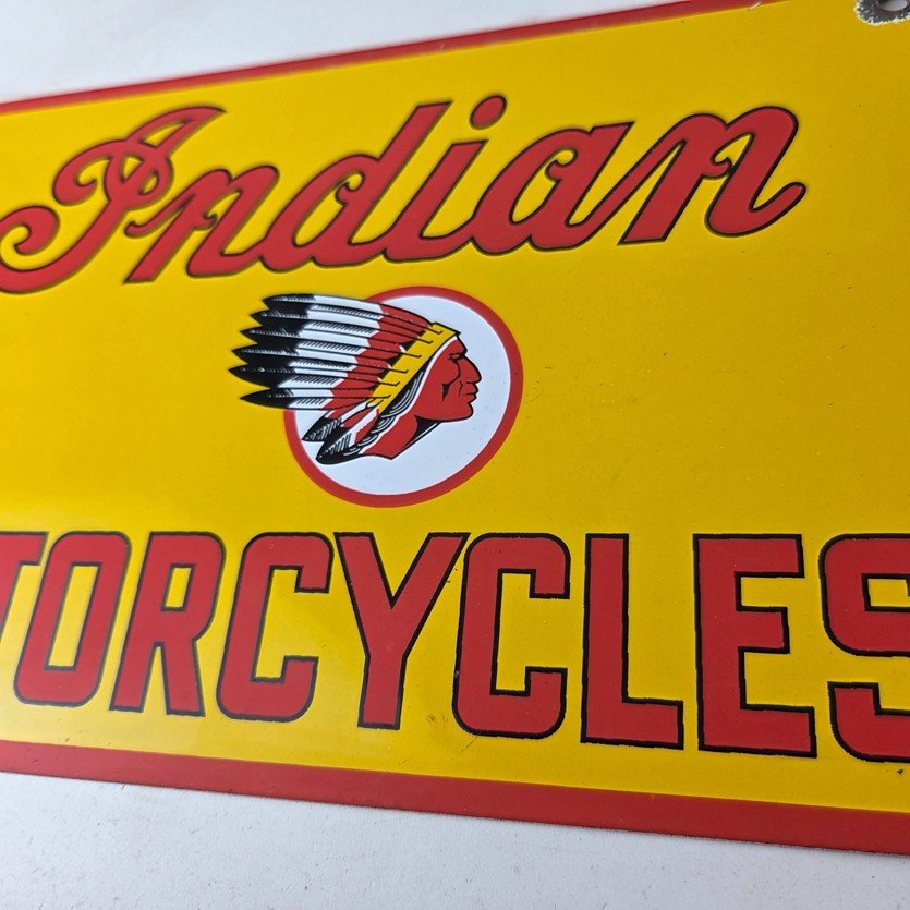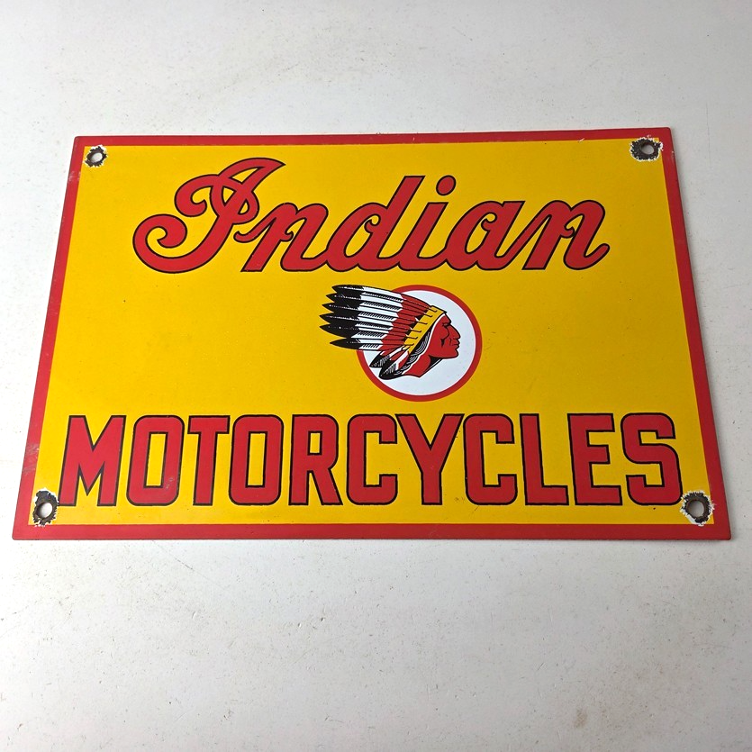 This vintage Indian Motorcycles porcelain sign features the Indian Motorcycles lettering. The sign measures 11 3/4″ by 7 3/4″ in size and has porcelain on both sides.