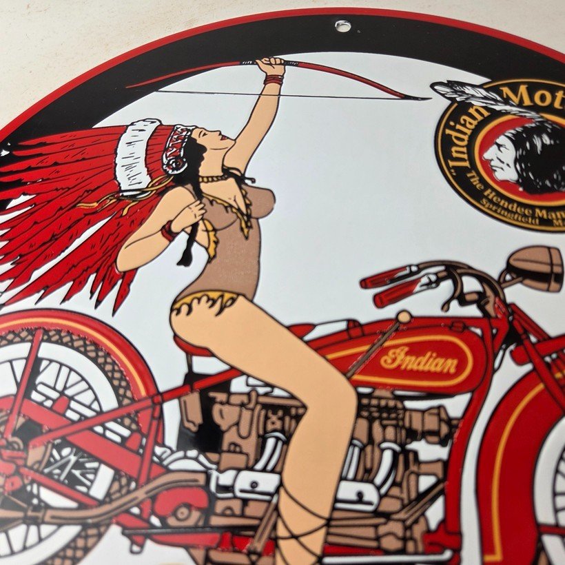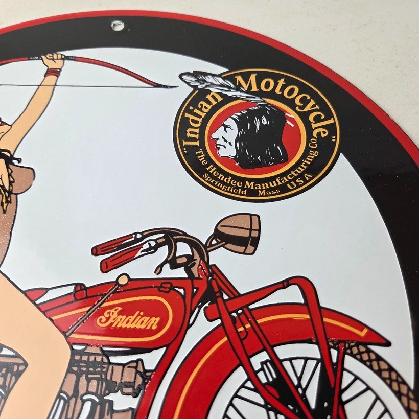 This vintage Indian Motorcycles porcelain sign features Indian Motorcycles advertising with the Indian pin up girl with bow and arrow. The sign measures 11 3/4″ in size and has porcelain on both sides.