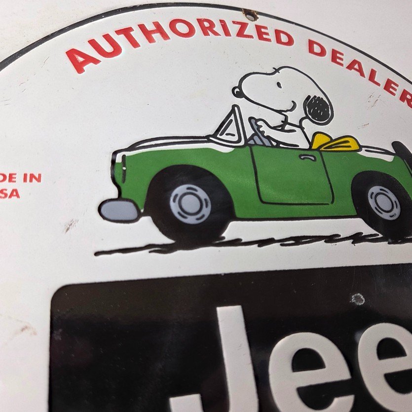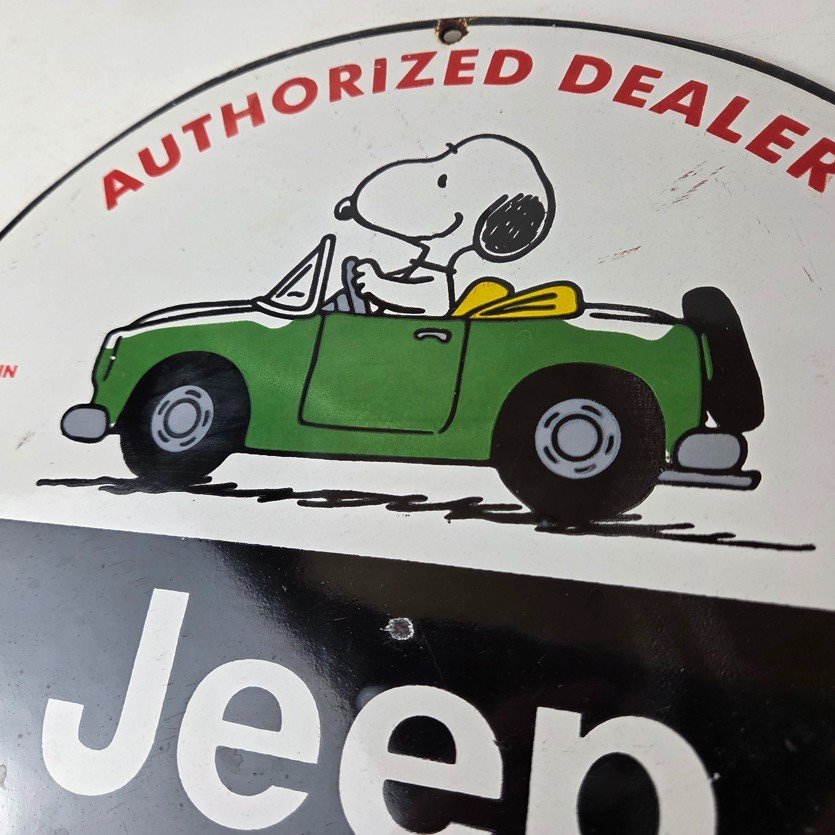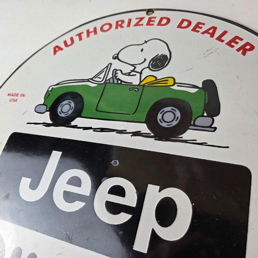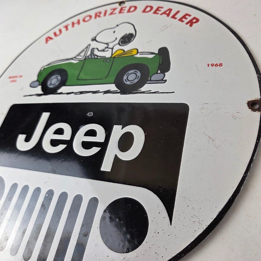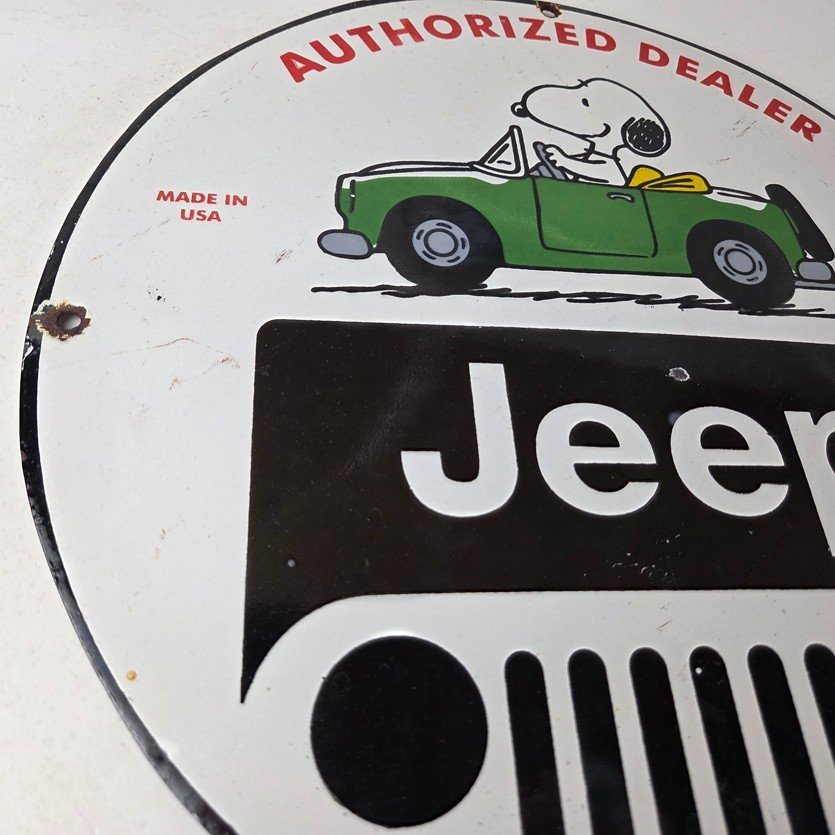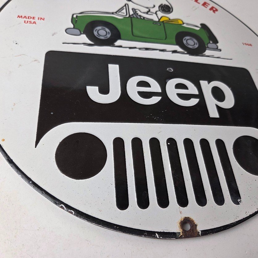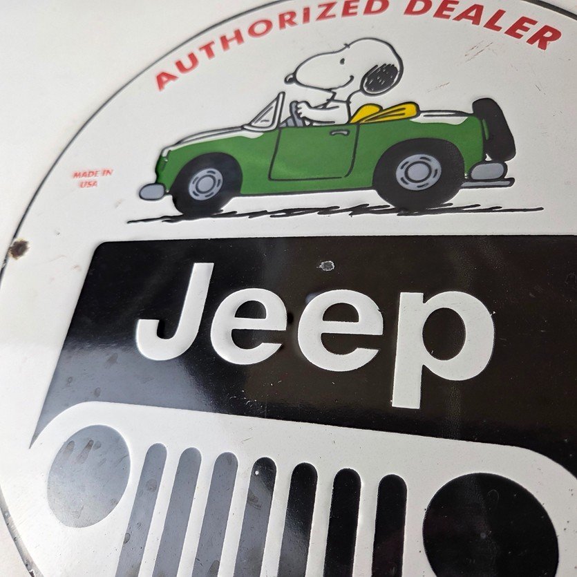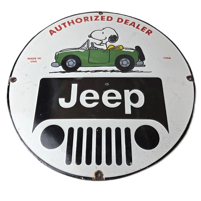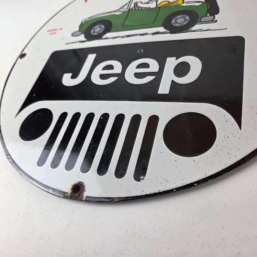 This vintage Jeep 4WD Automobiles porcelain sign features the Jeep brand. The sign measures 12″ in size and has porcelain on both sides.
