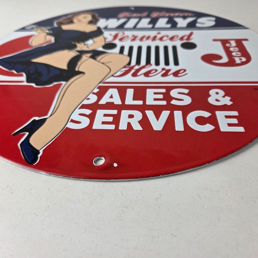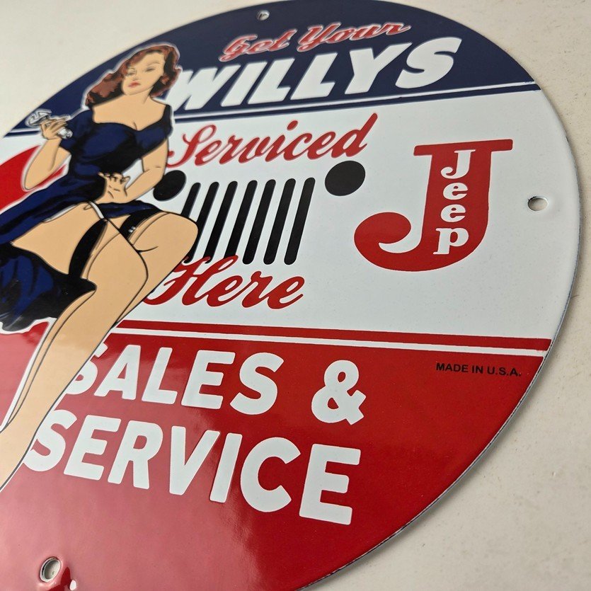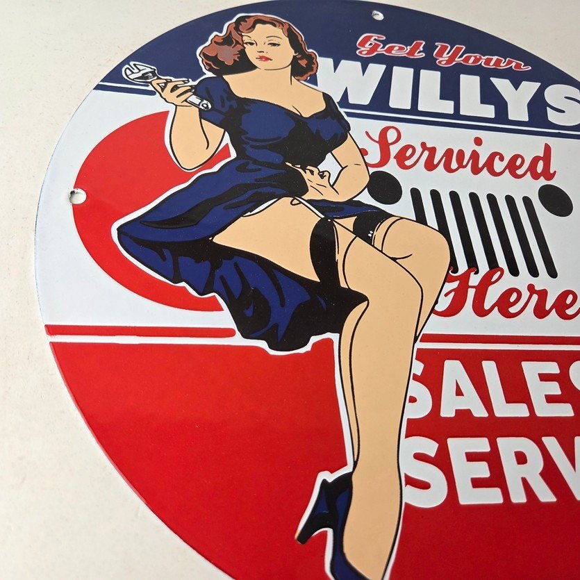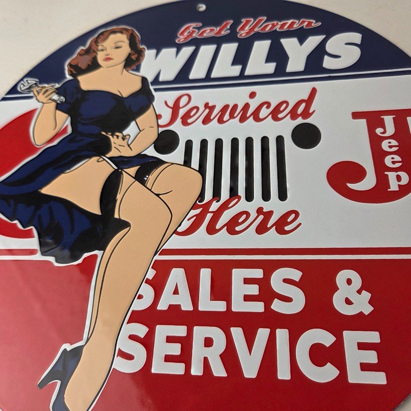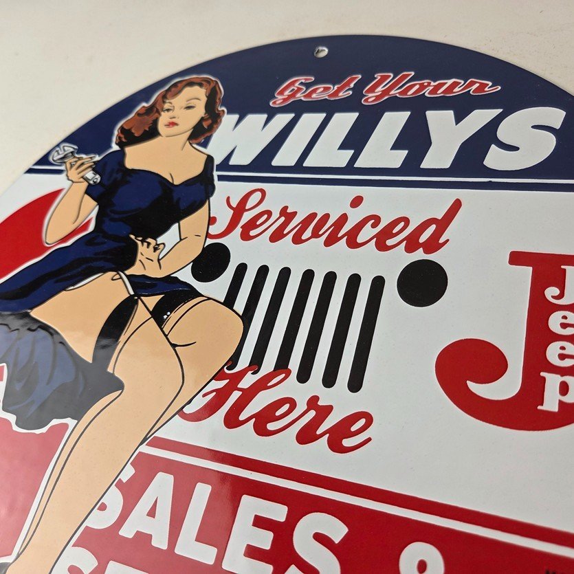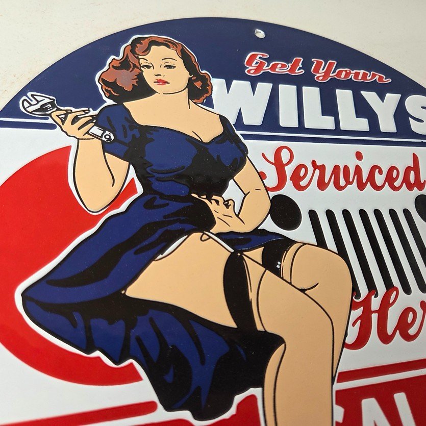 This vintage porcelain sign features Jeep 4 WD vehicles with the words “Get Your Willy’s Serviced Here” and “Jeep” in bold letters on the right. The sign measures 11 3/4 inches in size. It is a great addition to any gas and oil or advertising collectibles collection. This sign will make your mancave, collection, shop, or garage really stick out. It is your chance to own a piece of Jeep advertising.