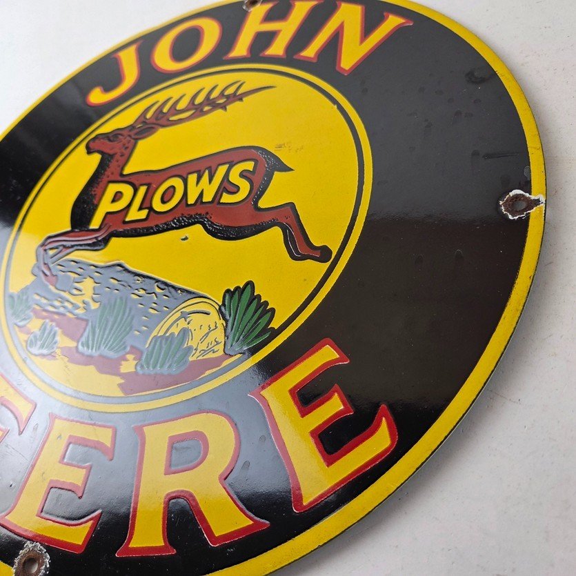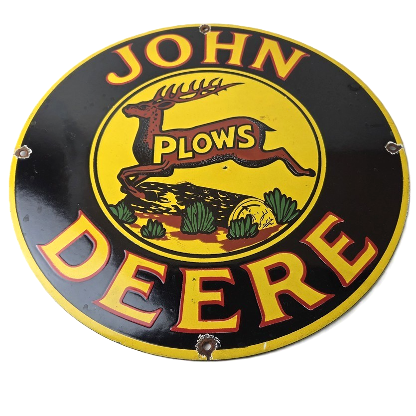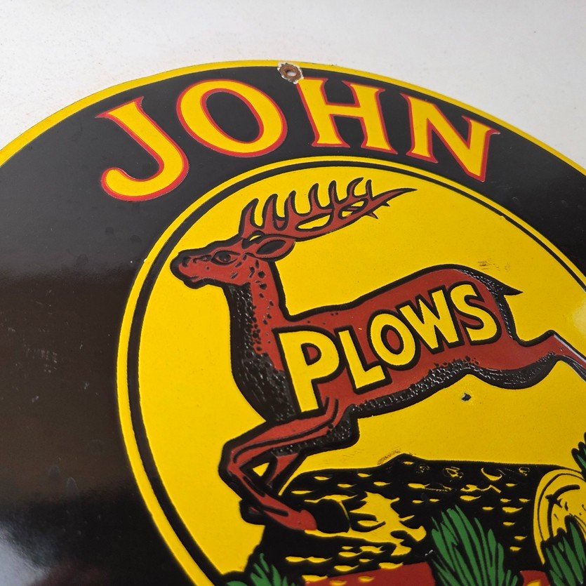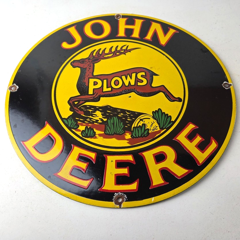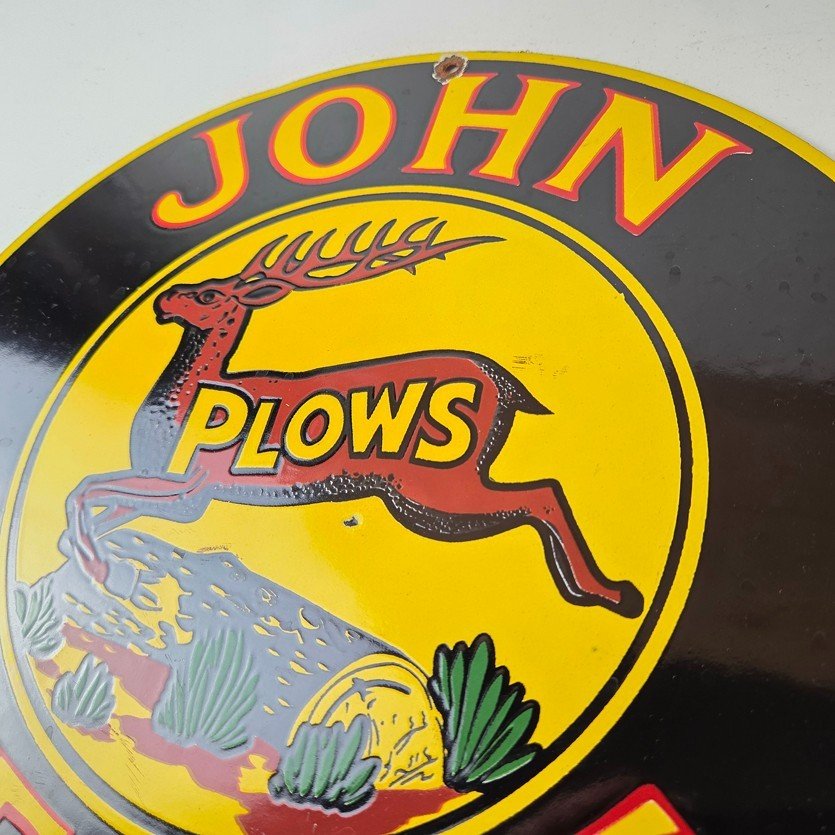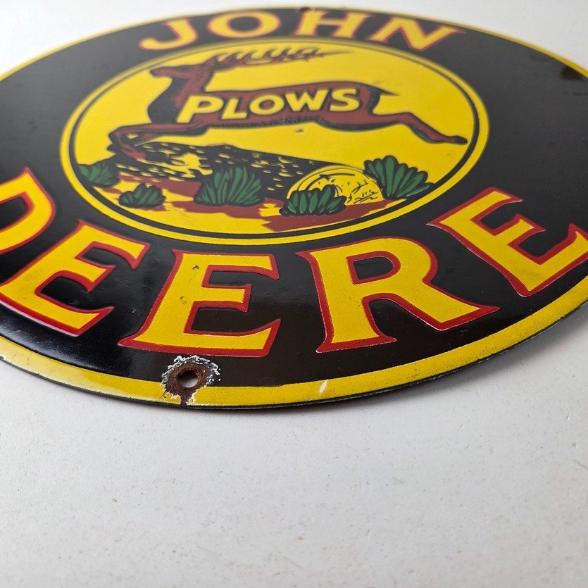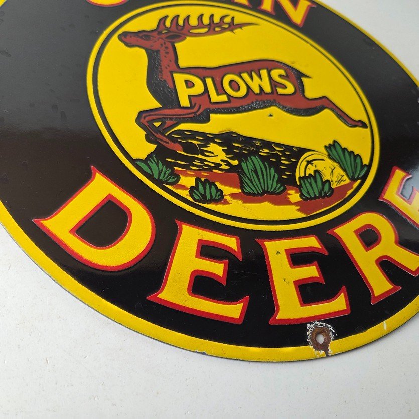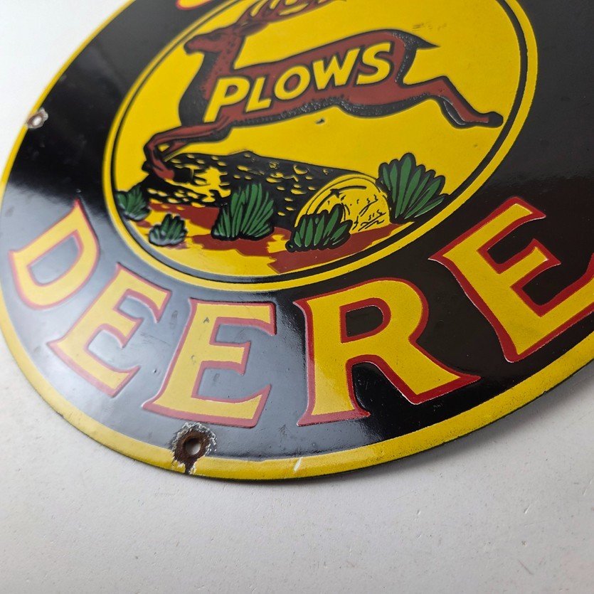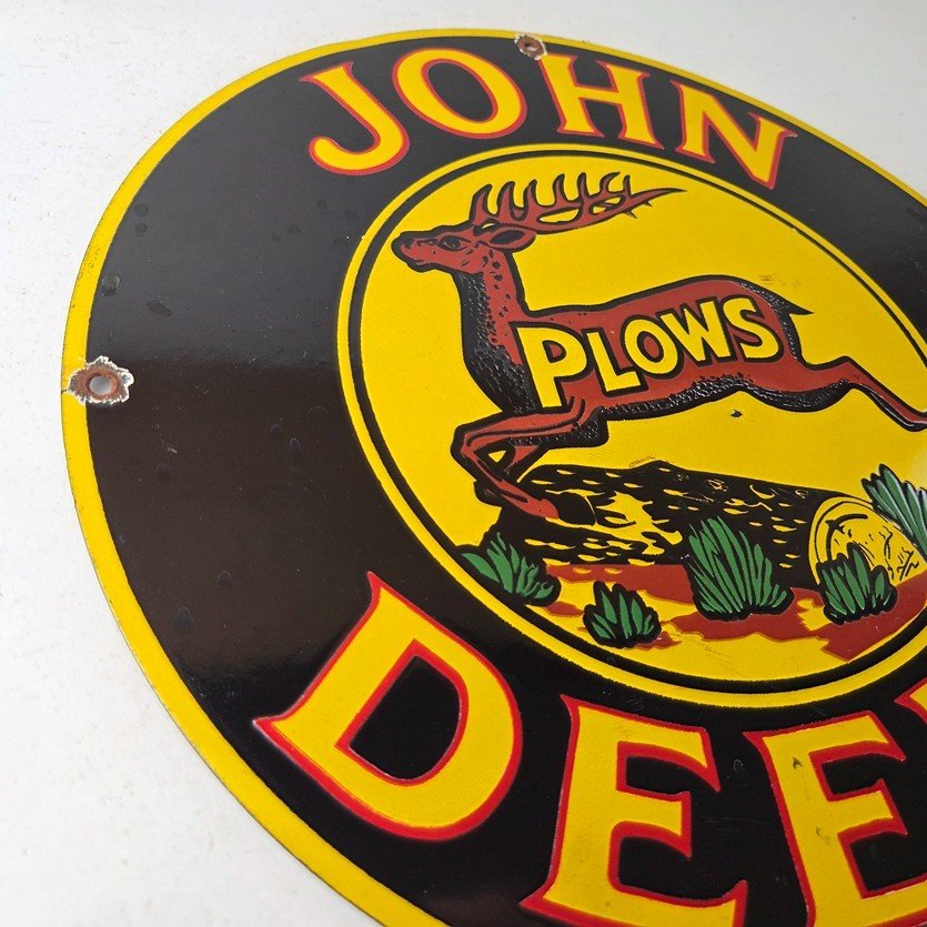 This vintage John Deere leaping deer sign makes a great addition to a garage, shop display, man cave, barn, or any John Deere memorabilia collection, vintage farm equipment advertising collection, or tractor/ranch sign collection.