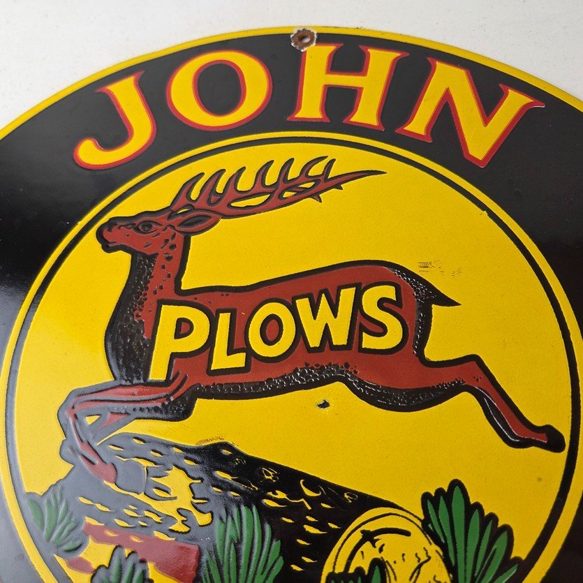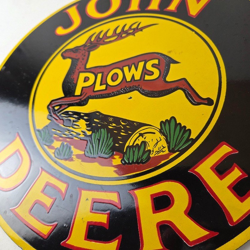 This is a vintage John Deere Plows porcelain sign (also known as a John Deere tractor sales & service pump plate), measuring 12 inches round. It features the classic leaping deer logo: a detailed brown deer in mid-leap over a yellow field and rock, with “PLOWS” in white across its body, “JOHN DEERE” arched at the bottom in yellow, “DEERE” emphasized, black background with yellow circle and red/yellow border — a classic John Deere plows and farm equipment advertising sign.